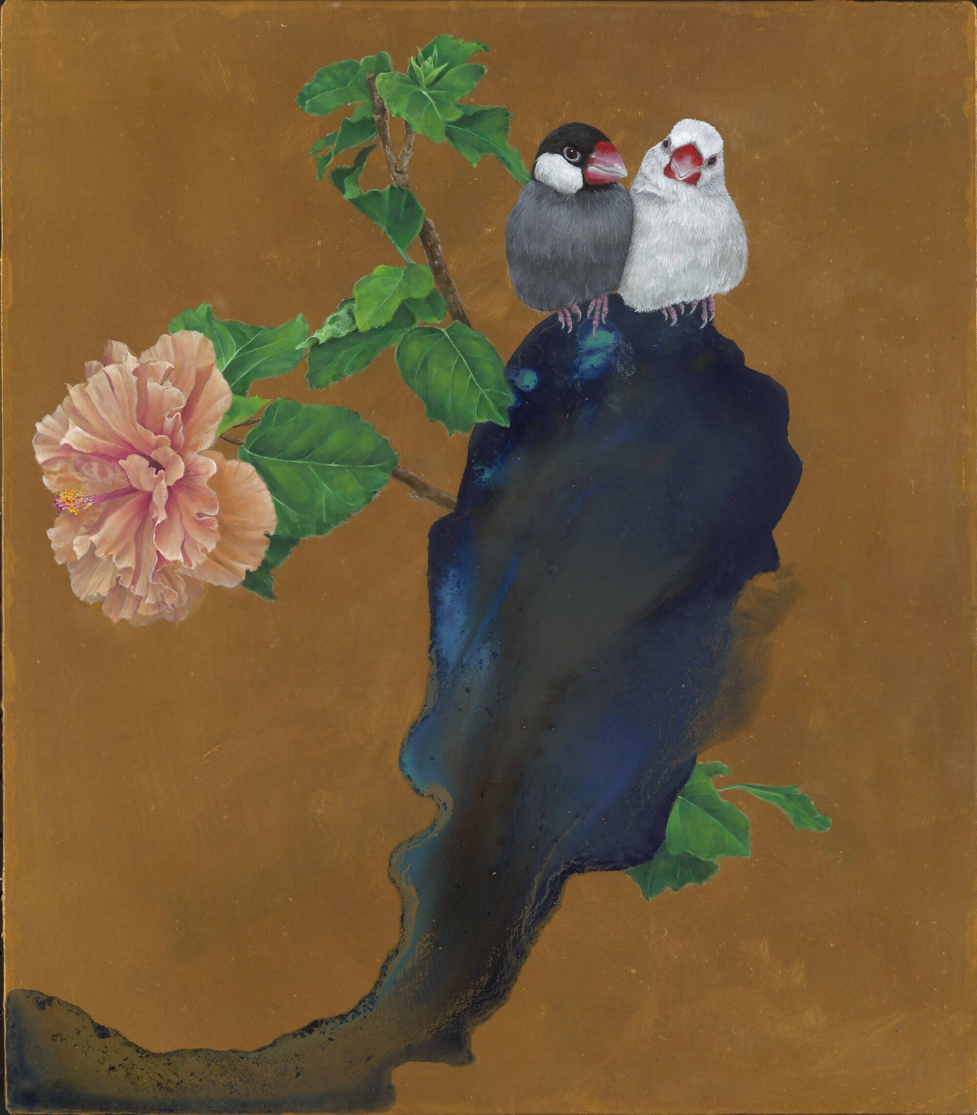 In this evocative artwork, two birds nestle closely beside radiant hibiscus flowers--a scene that portrays deep affection. The setting, which can be anything from a lofty tree branch or perilous rocky terrain, becomes inconsequential, allowing the focus to remain on the intimate connection between the subjects in an atmosphere of profound love.