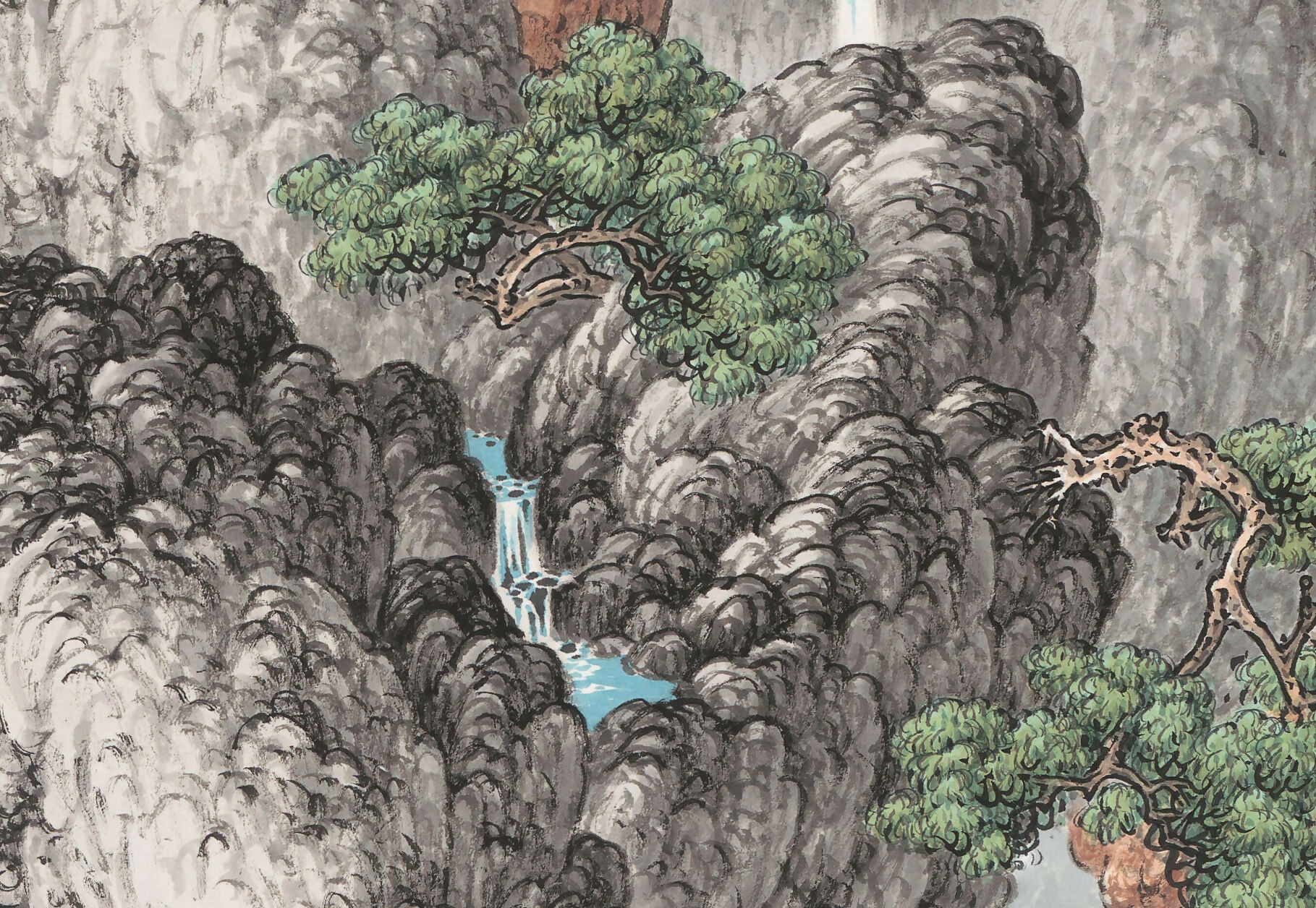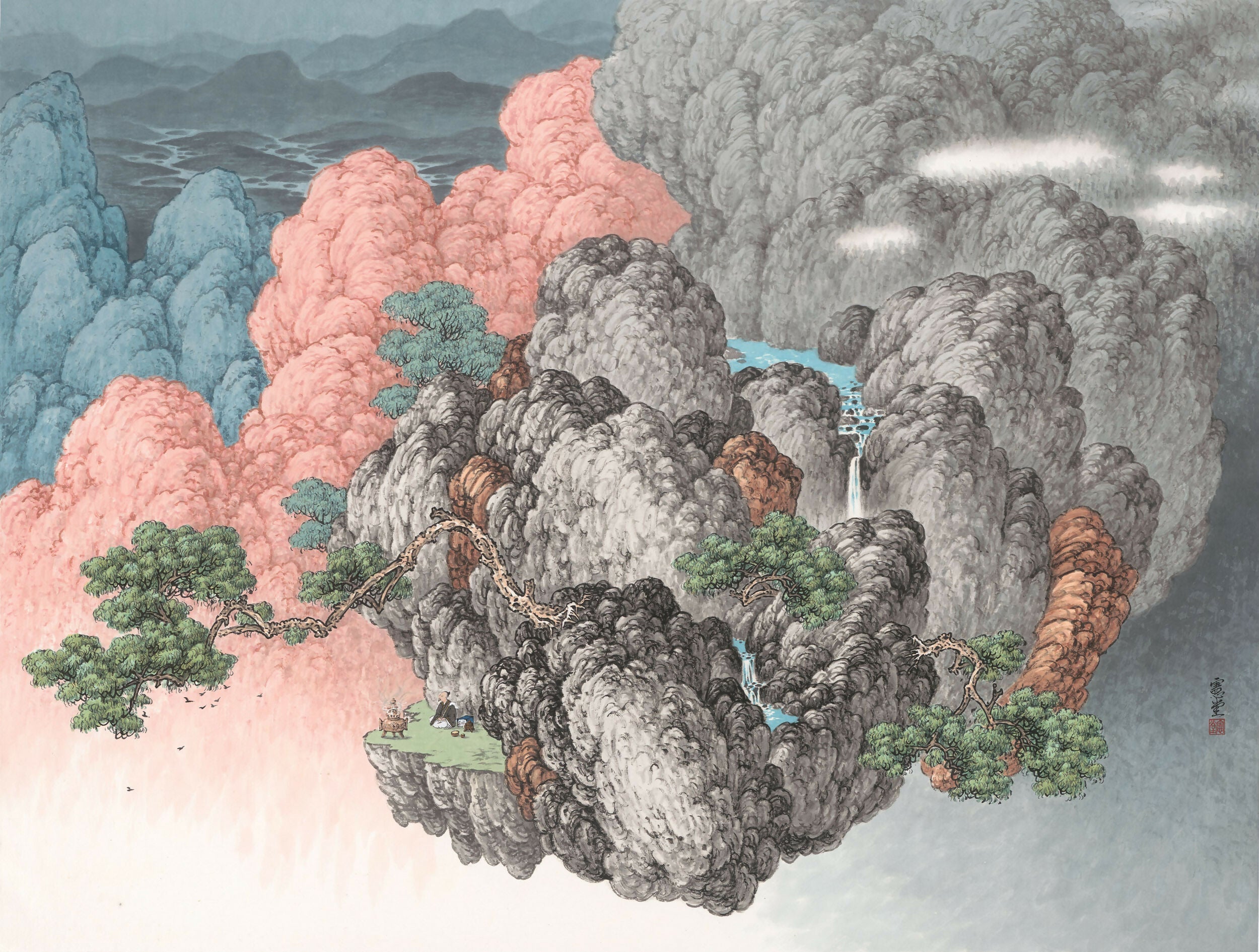 In the upper left corner, the distant mountains are depicted in an array of gray tones, suggesting a far-reaching expanse. The nearby peaks, awash in mineral shades of azurite and vermilion, create a bold yet serene equilibrium, evoking the harmony of yin and yang in the universe.
