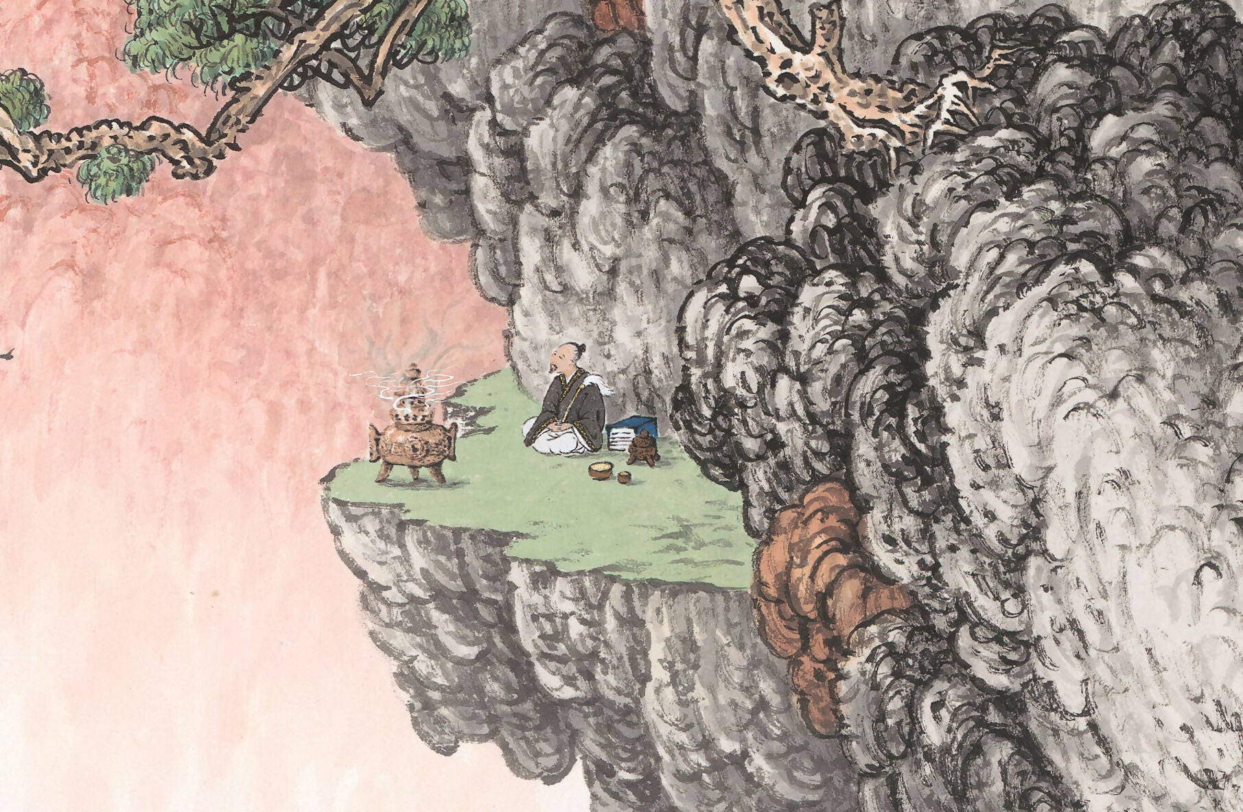 The towering cliffs, like unwavering sentinels, provide a secure haven and a tranquil sanctuary for those seeking enlightenment. Positioned at the base of the mountain is the alchemist, surrounded by a sinuous pine tree, a group of flying birds, and an expansive open area, hinting at the infinite potenials for inner discovery.