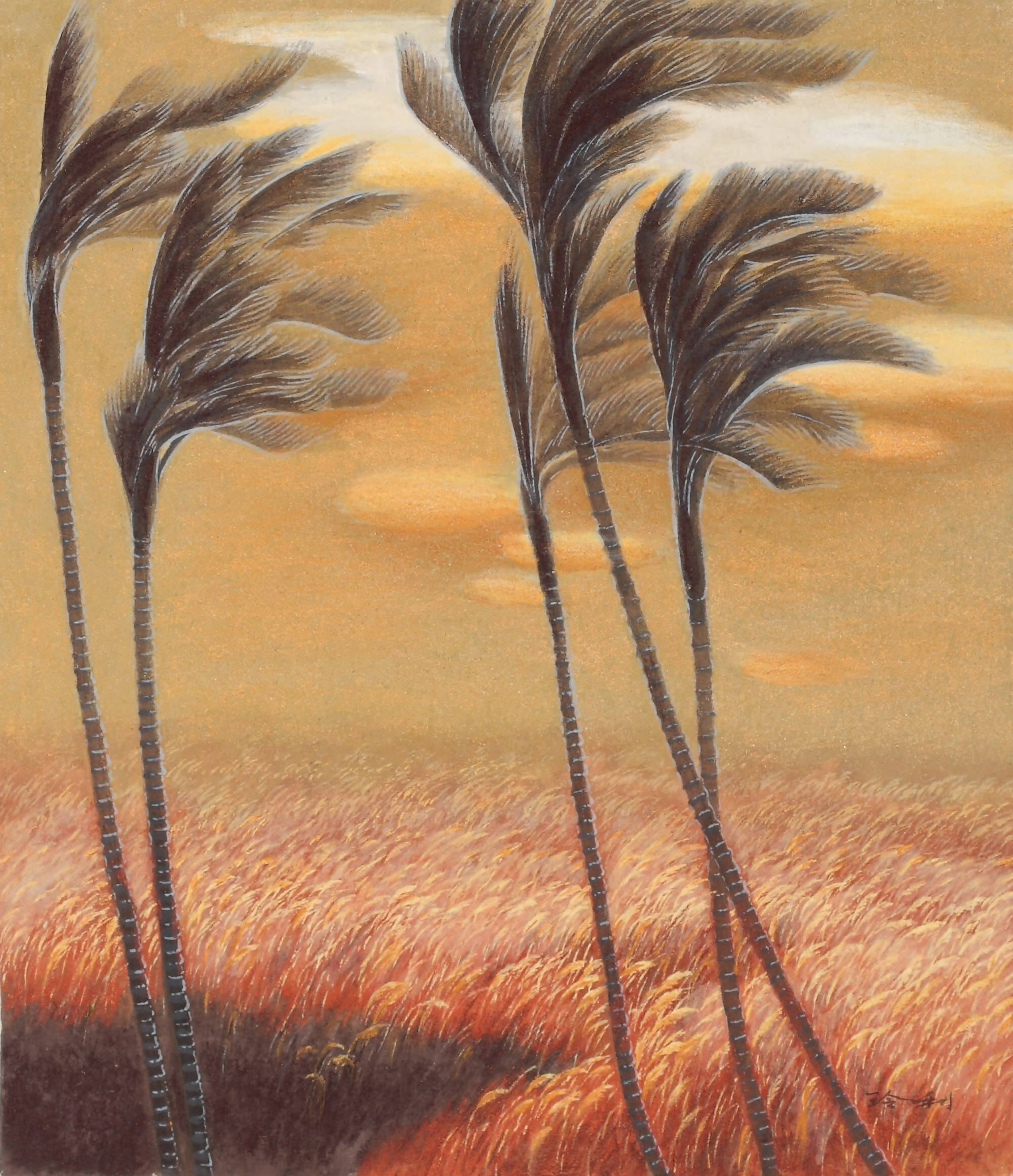 In this evocative piece, the artist portrays towering palm trees that stand firmly, swayed relentlessly by powerful winds against a golden horizon dotted by migrating geese flying south. The harshness of the elements underscores life's dynamic unpredictability, urging us to stay vigilant and open to embracing every challenge that crosses our path.