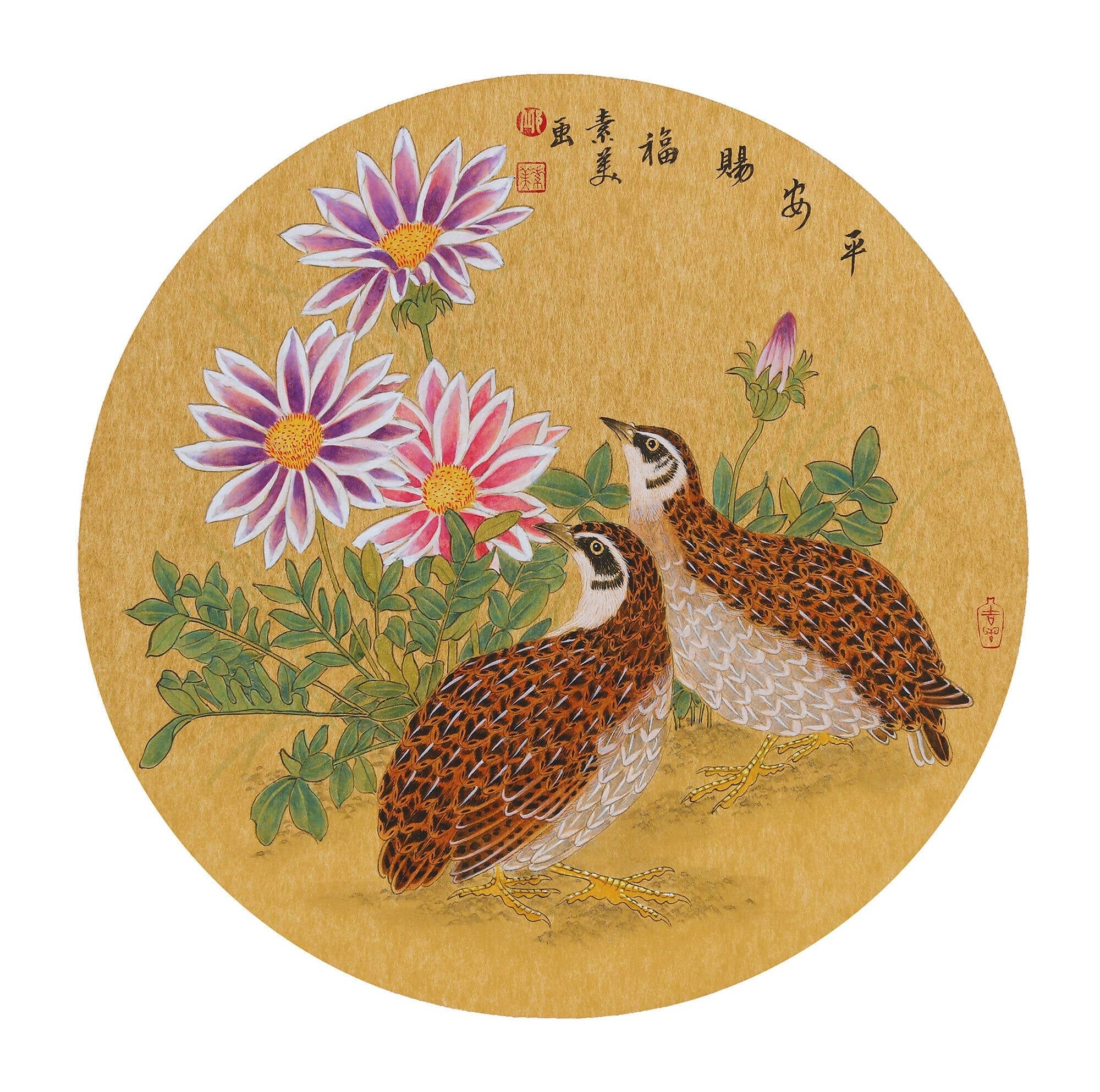 In this artwork, two quails stroll beneath a canopy of chrysanthemums as if sharing a moment of appreciation. The tranquil scene serves as a visual metaphor for unity and domestic bliss, elegantly encapsulating the ideals of harmony and peace.