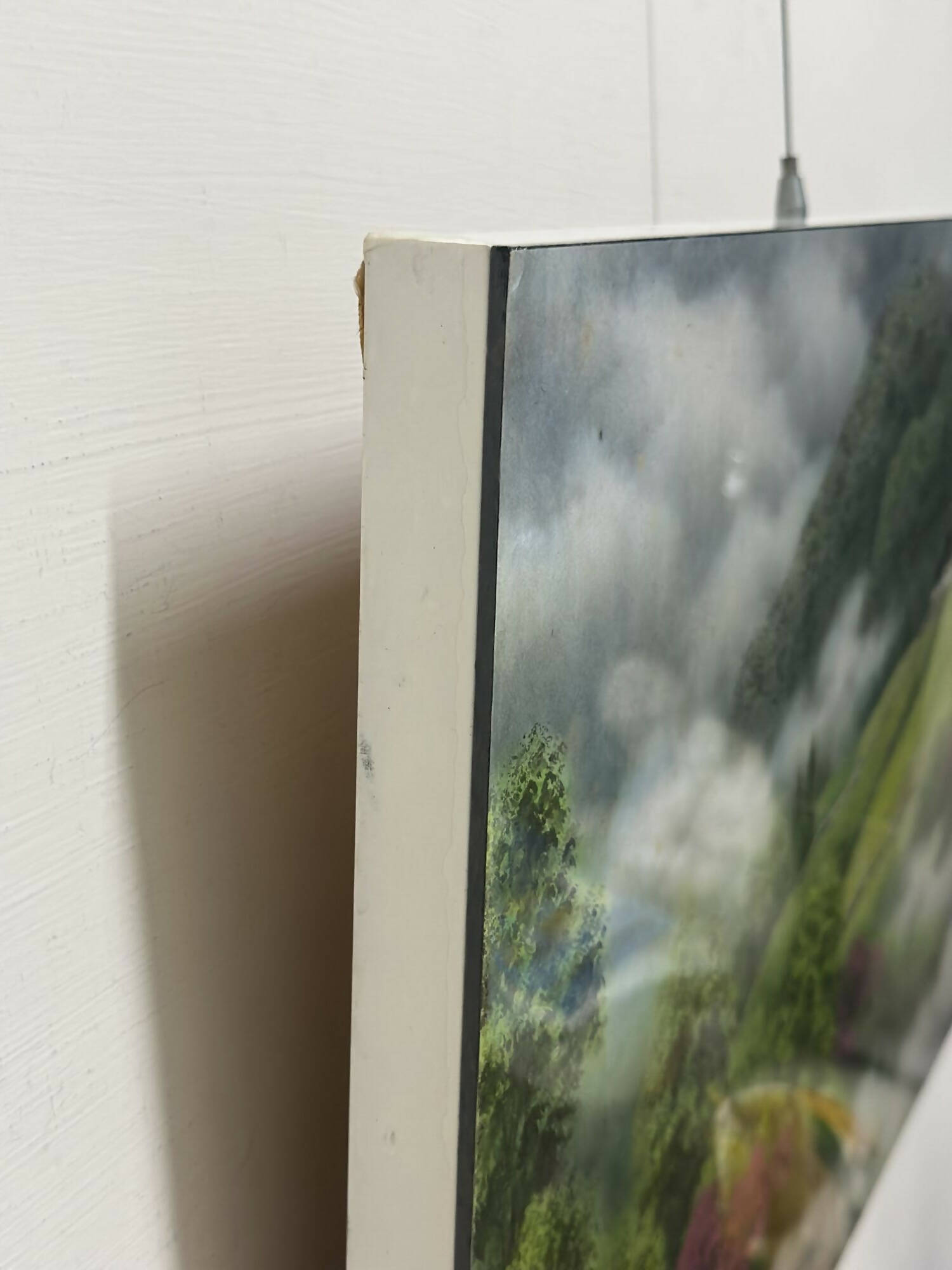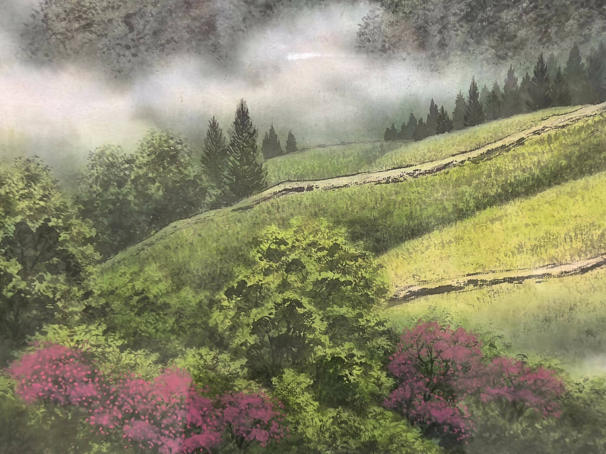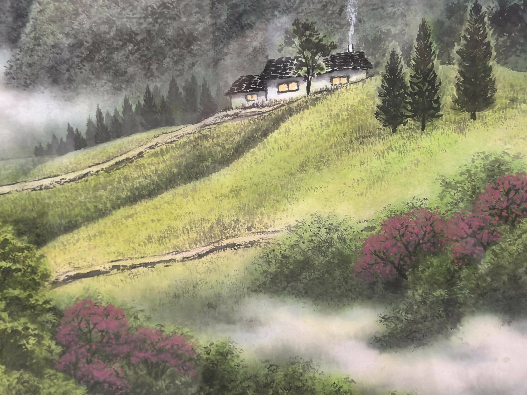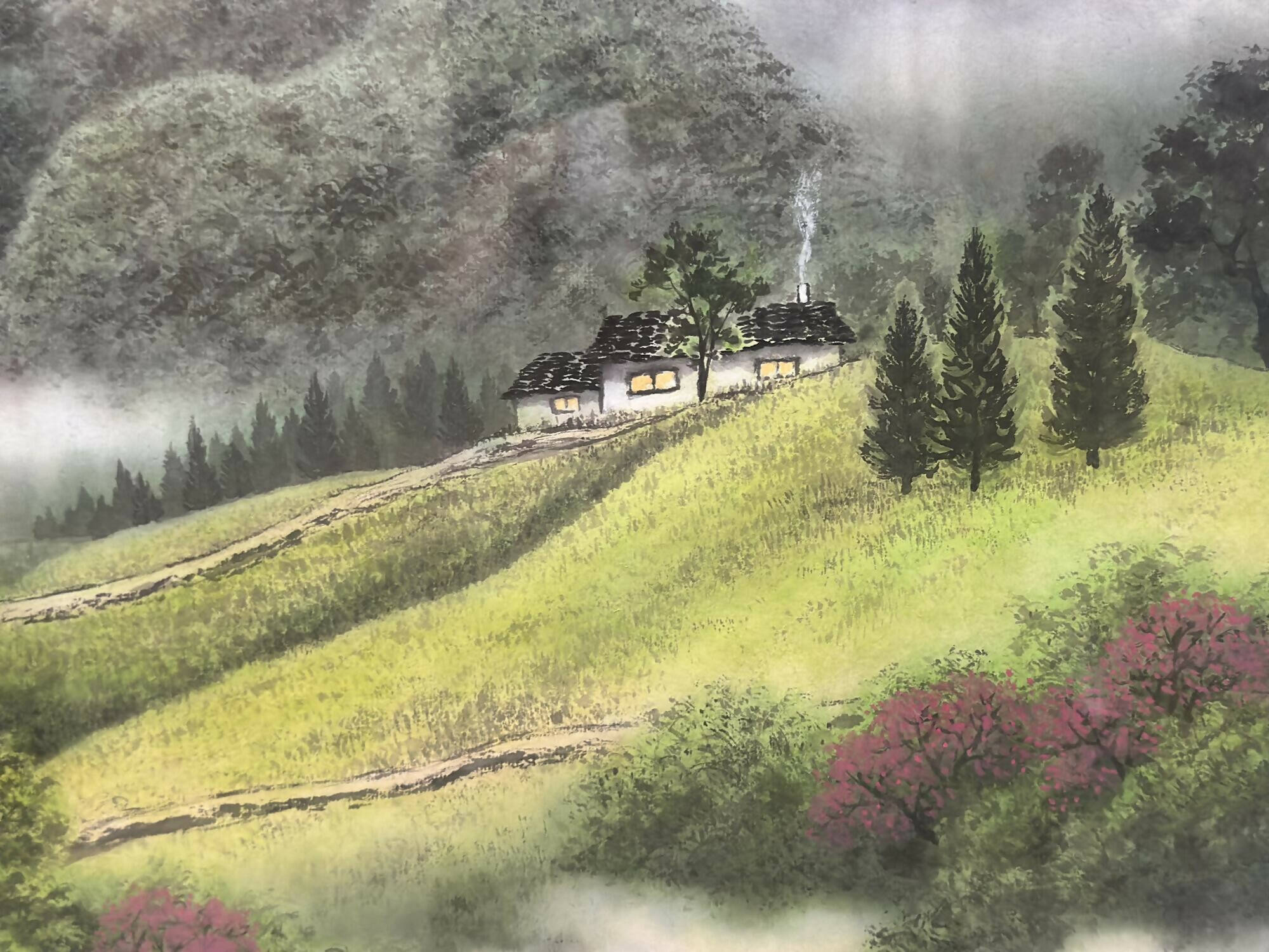 Nestled amidst undulating hills adorned with trees of deep emerald and vivid magenta hues lies a charming cottage reminiscent of fairy-tale settings. Positioned discreetly in the upper-right corner of the canvas, this lovely domicile radiates tranquility. From its chimney waft tendrils of smoke, carrying the irresistible scent of a meal being prepared.