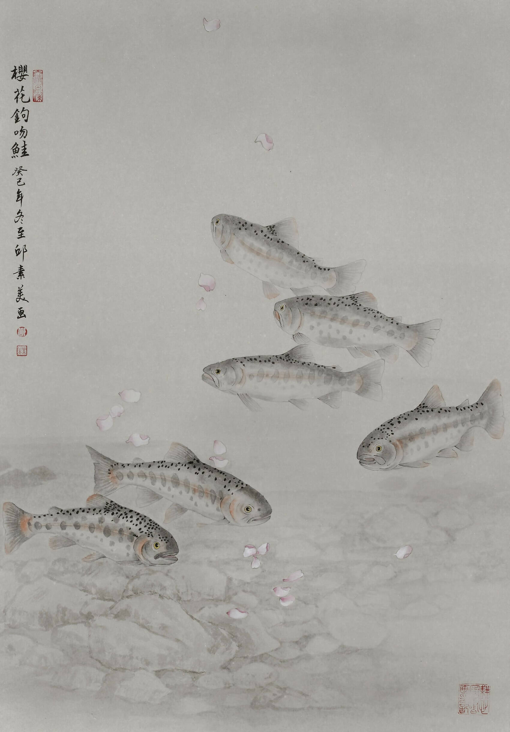 One of two similarly themed masterpieces, this artwork highlights Taiwan's ""National Treasure Fish,"" the Cherry Blossom Hooked-Snout Salmon, a rare species nearing extinction. During their breeding season, male and female salmon take on a cherry blossom-like pink hue, a feature further romanticized by the scattered cherry blossom motifs in the painting. Employing ink-wash techniques, the artist crafts a sweeping range of gray tones that evoke a sense of boundless freedom.