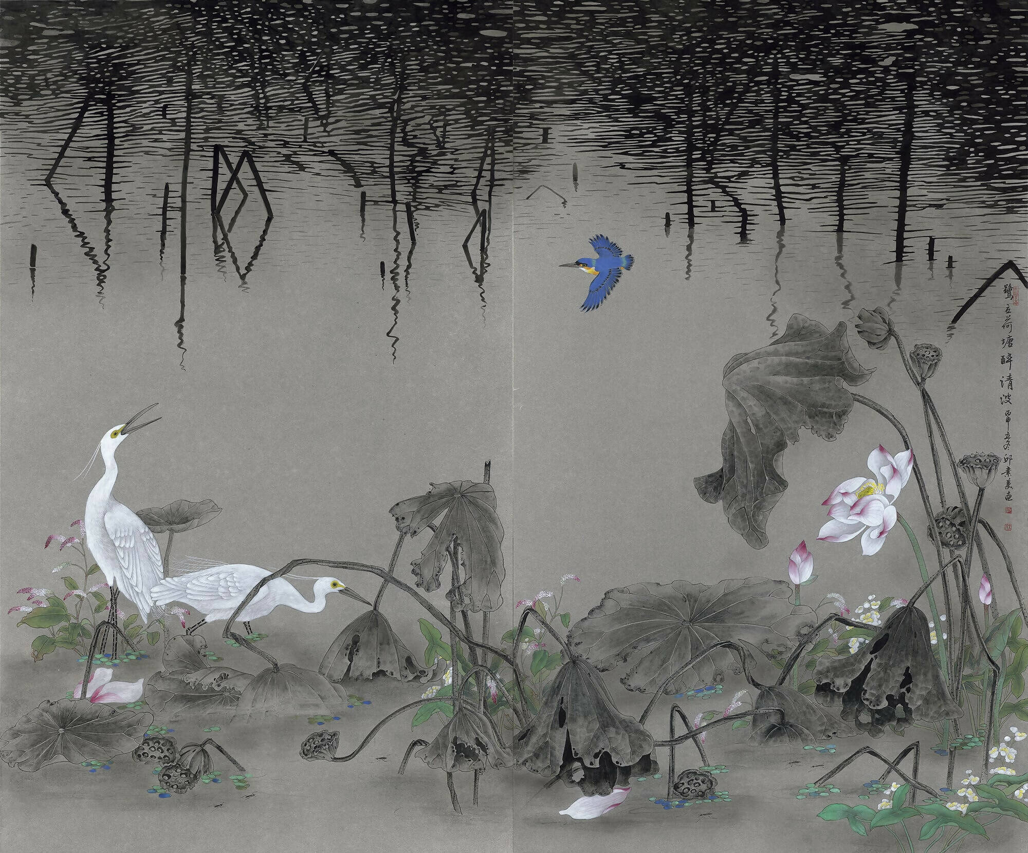The artist's skillful ink strokes capture shimmering water reflections in the distance while two poised white herons stand attentively in a lotus pond, just as a blue-coloured bird sweeps past. The surrounding flora, including red willow herbs and mushrooms, embellish the lotus flowers and seedpods. With this idyllic painting, the artist achieves a visual rich in detail yet exuding a Zen-like serenity.