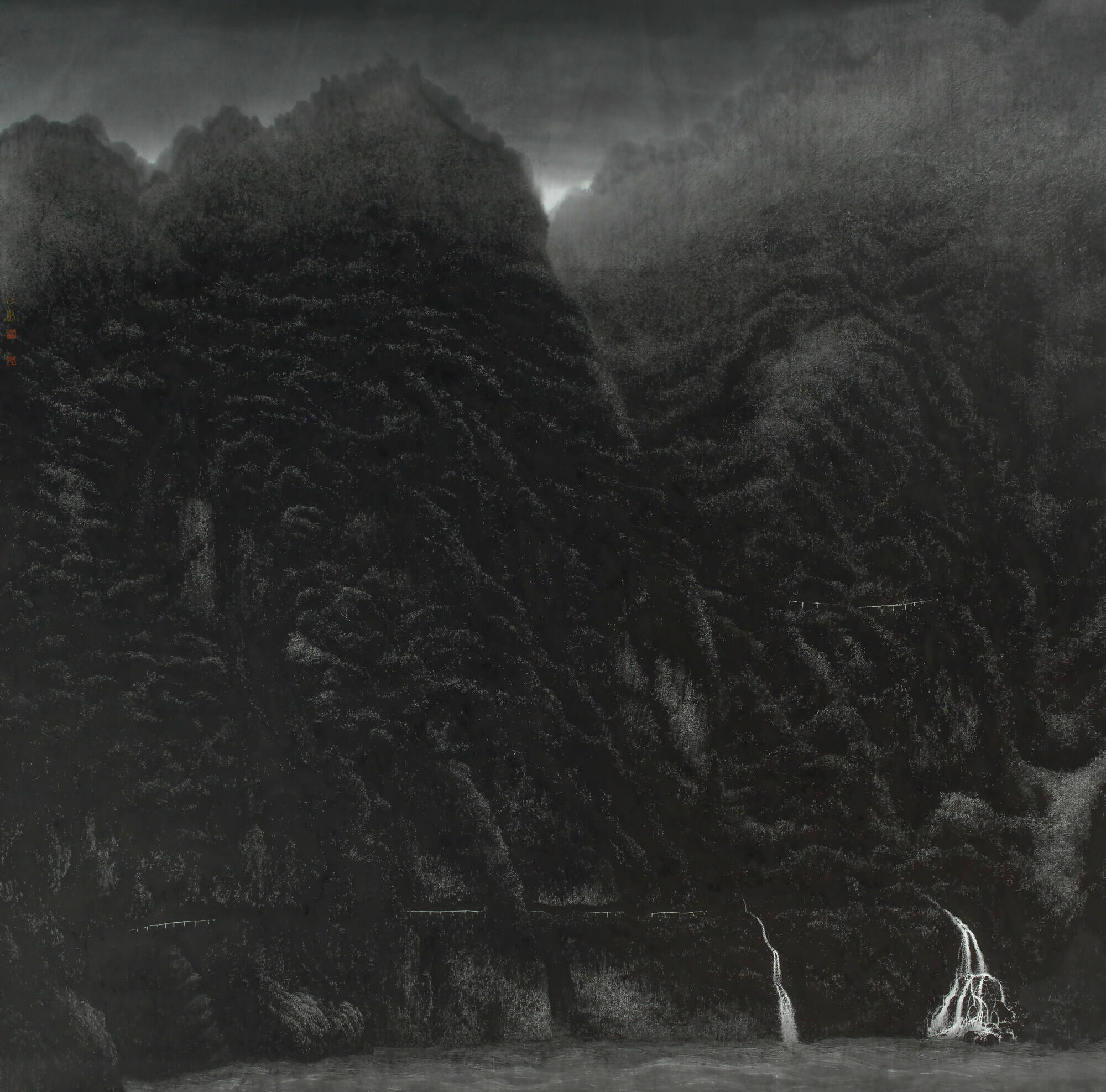 In "Daybreak," the profound and glorious moment just before dawn—the darkest and most silent instant before the world awakens—is captured on canvas. The painting vividly seizes this transitional moment between light and dark, stillness and movement. With each brush stroke, the ink develops through subtle shifts in shading and depth, constructing a lush mountain landscape. As dawn's light pierces through the clouds and illuminates the surging stream in the lower right corner, the artwork reveals an intricate interplay between motion and rest, light and shadow.