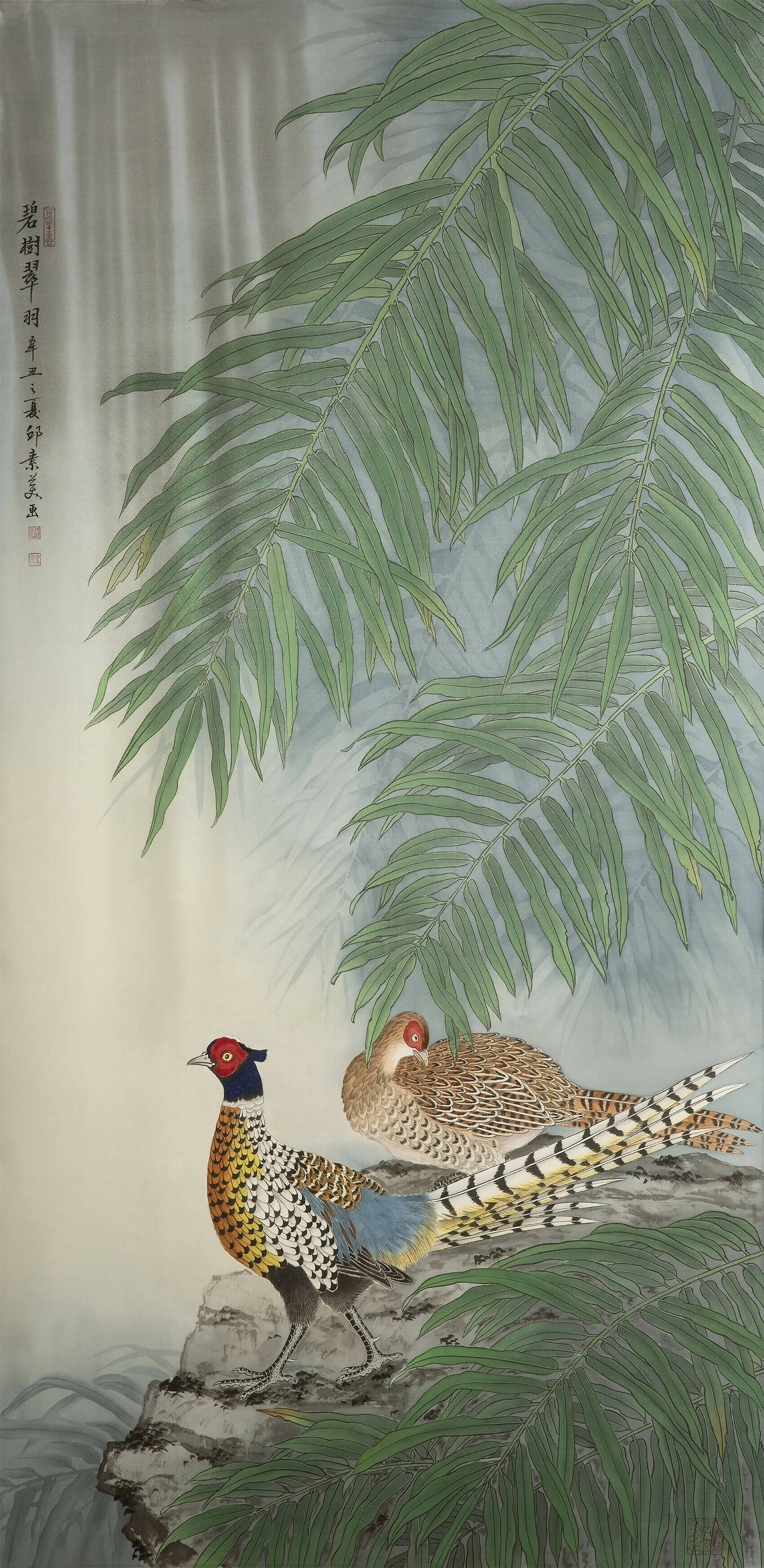 Intricate details of ferns complement the vibrant feathers of a ring-necked pheasant pair. The male stands regally on a rock, surveying his domain, while the female delicately preens in the shade. This dynamic composition symbolizes a nuanced portrayal of partnership and love, captured with exceptional brush strokes and vibrant palettes against monotone ones.