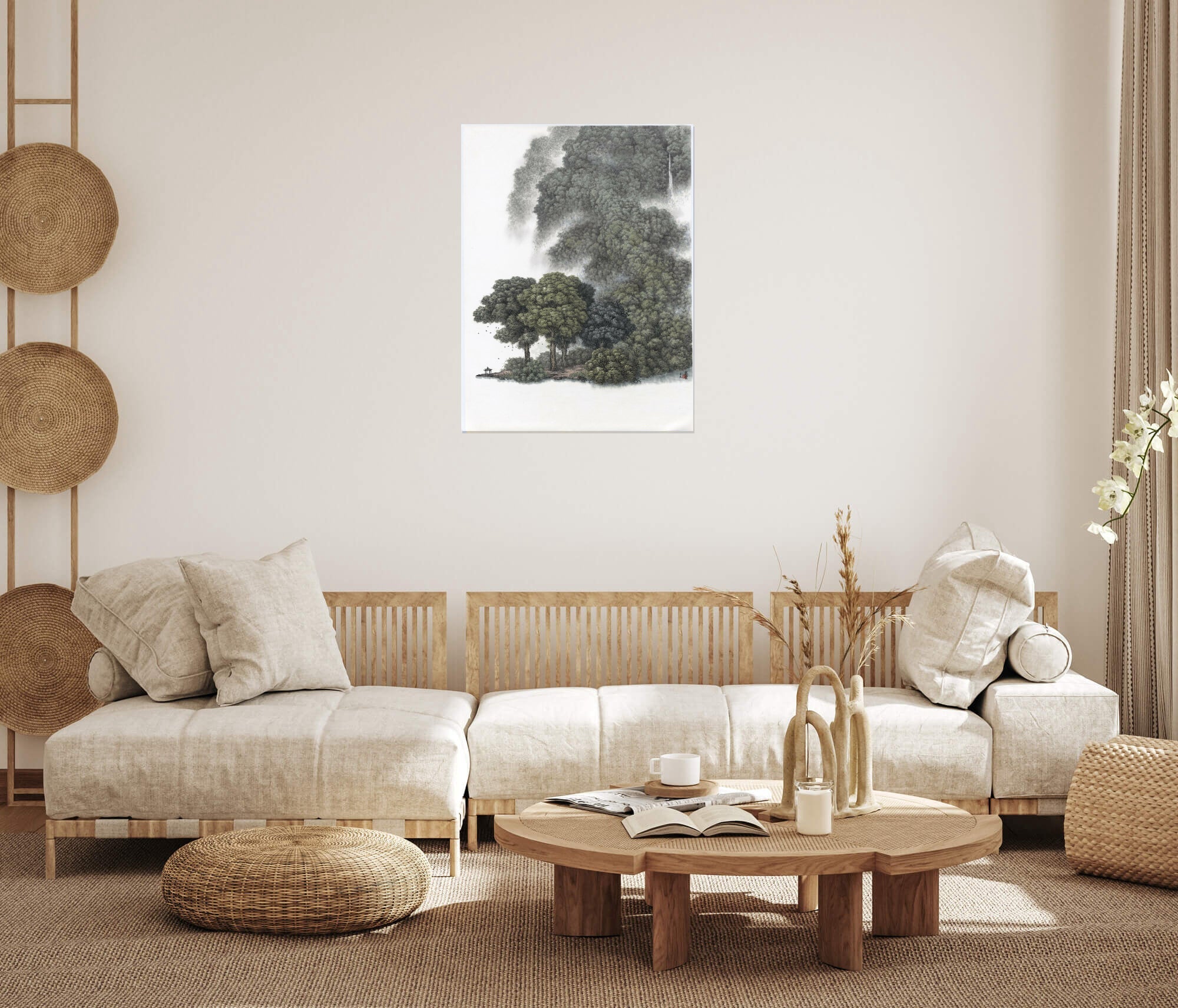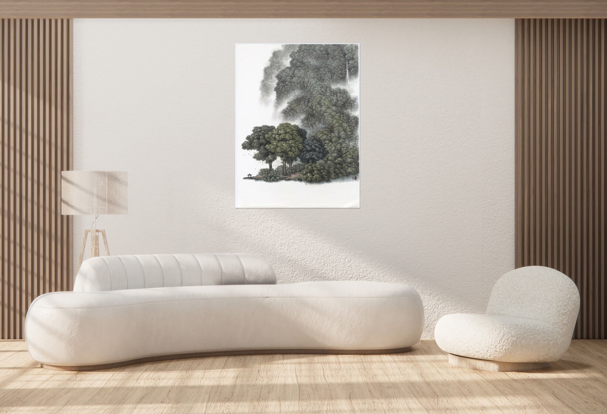 The sky and water's surface are poignantly rendered as expansive blanks of white paper, offering an imaginative canvas that allows the mind and soul to wander. In this tranquil setting, trees serve as temporal sentinels. The vivid hues in the foreground contrast sharply with the ethereal, mist-shrouded outlines of distant trees, presenting a comforting sense of continuity in an ever-changing world. The artist skillfully balances nothingness and detail--a metaphor for transience and permanence.