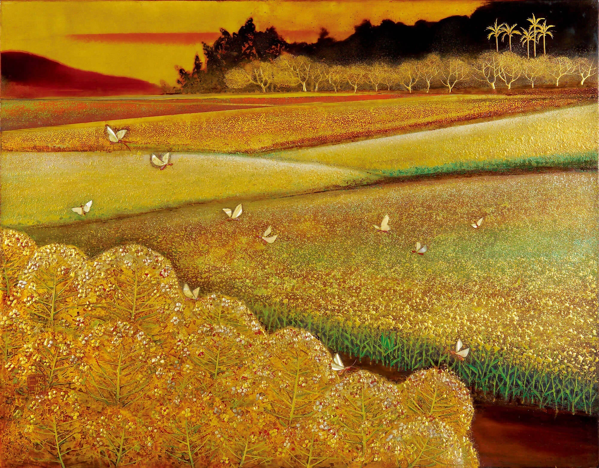 Crafted by the esteemed lacquer master Wang Ching-Shuang, this opulent piece embodies the vivacity of spring while radiating an innate tranquillity. At the heart of the artwork butterflies with wings that shimmer from the intricate mother-of-pearl inlay frolic amidst lush meadows.