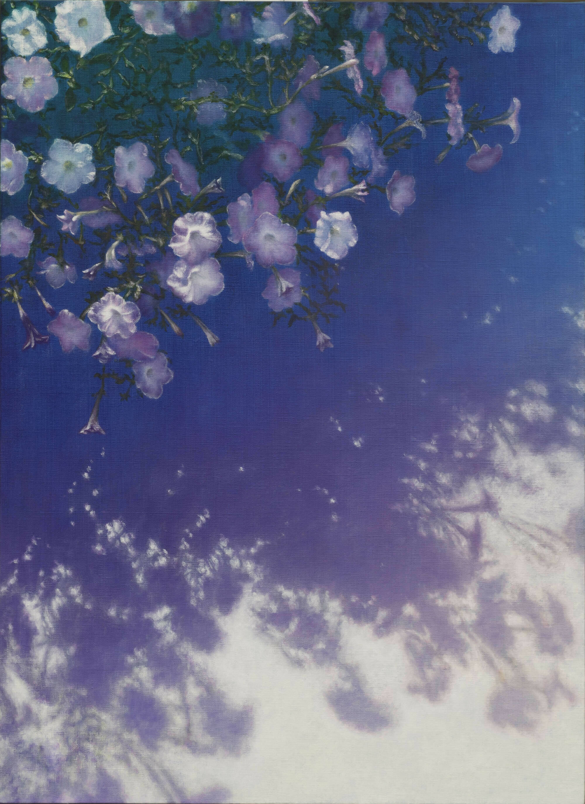 The painting "Flowers in a Palace" reveals a magical corner within a palace garden in Kucha, Xinjiang, where sunlight filters through the blossoms, casting dappled patterns on the ground. Liu's mastery of juxtaposing light and shadow to create immersive dimensions emerges in this painting, inviting viewers to examine its intricate brush strokes and deeper philosophical meanings.