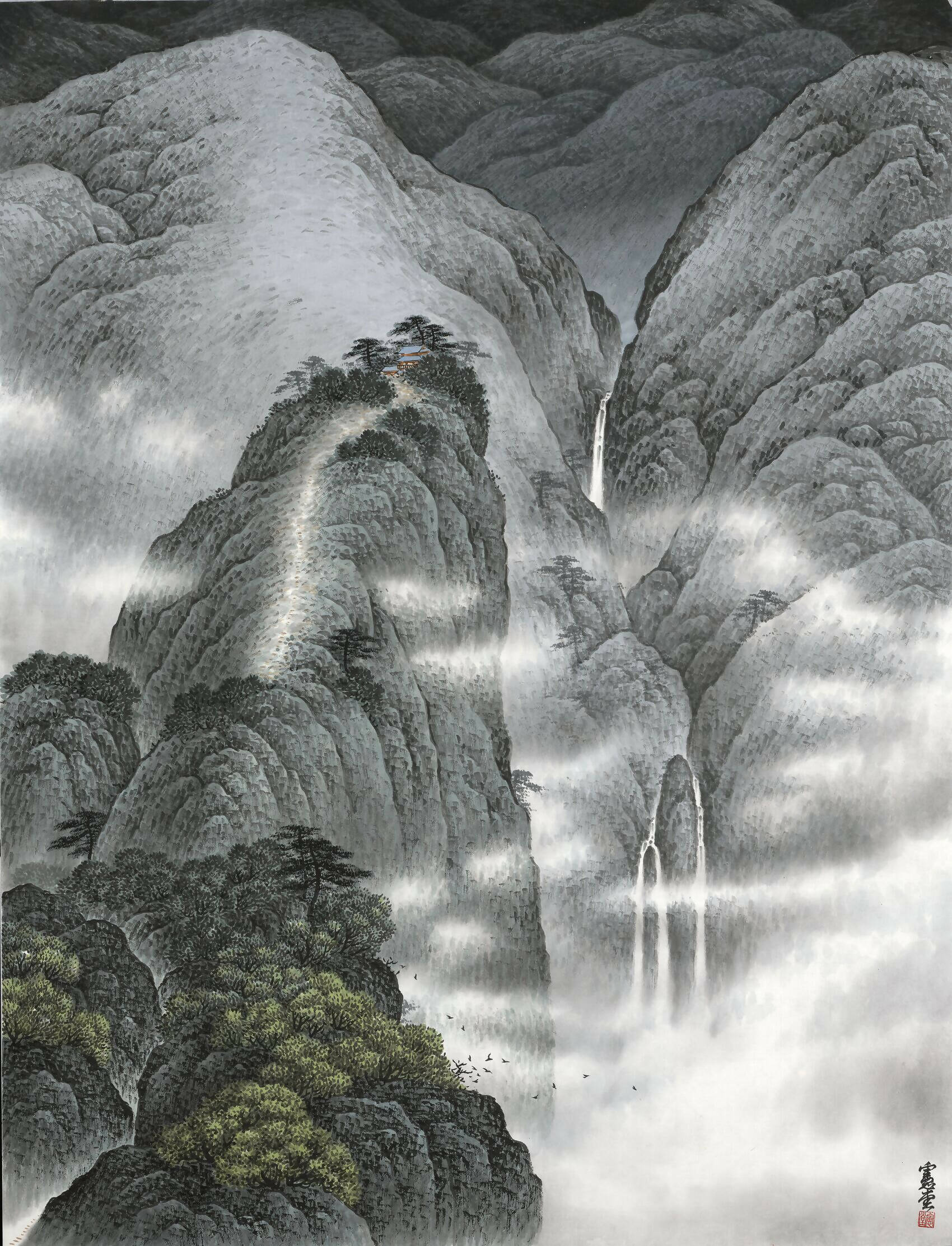 Navigating the serene terrains of Hou Xiantang's paintings, the audience finds itself transported beyond the mundane. Hou employs a distinct M-shaped brush stroke that lends an intriguing blend of vitality and enigma to the mountainous landscapes he presents as his ultimate "hidden paradise." This technique affords remarkable versatility, layering strokes to evoke towering, rugged mountains or employing a softer touch to suggest lush, dense forests.