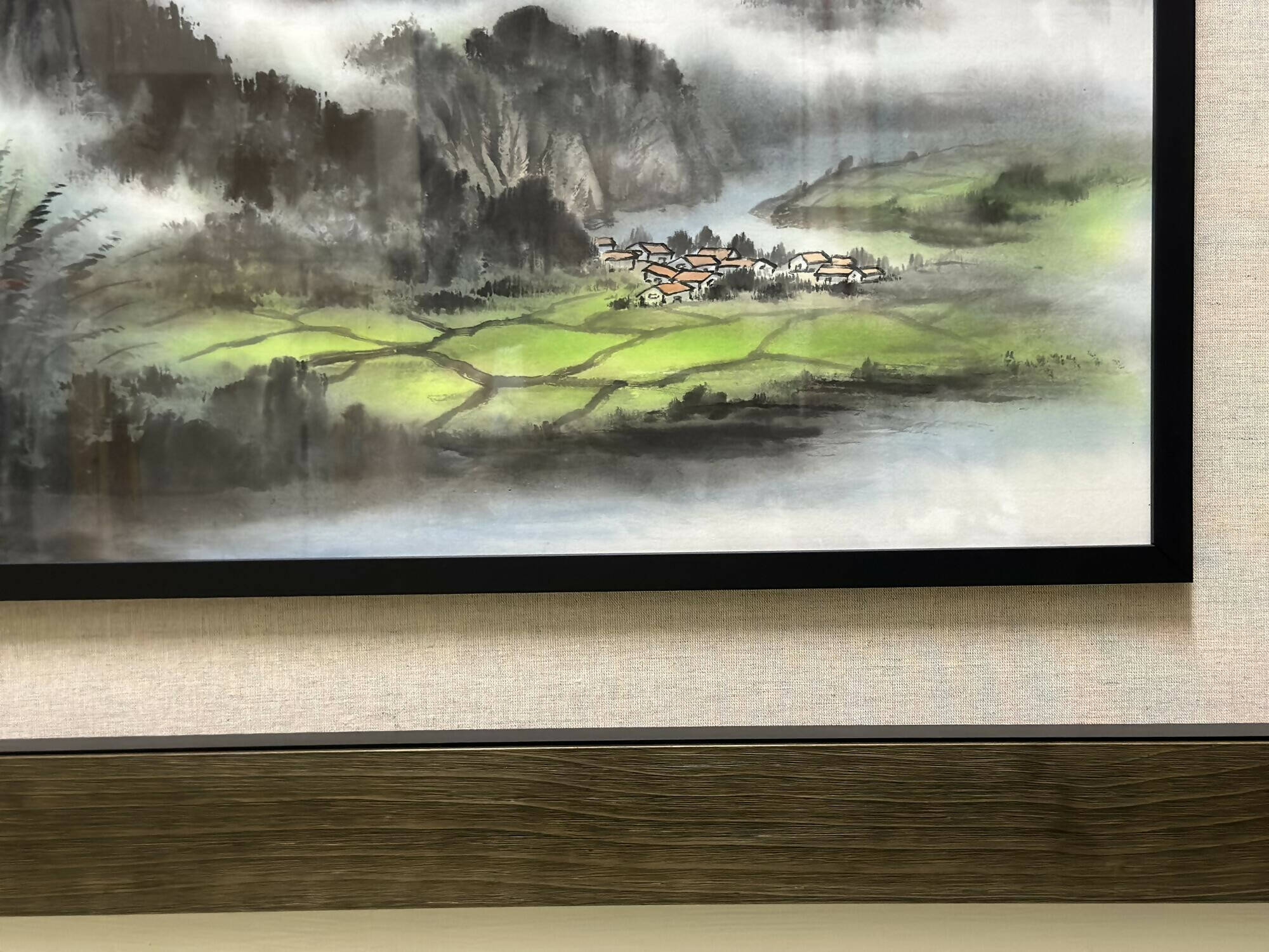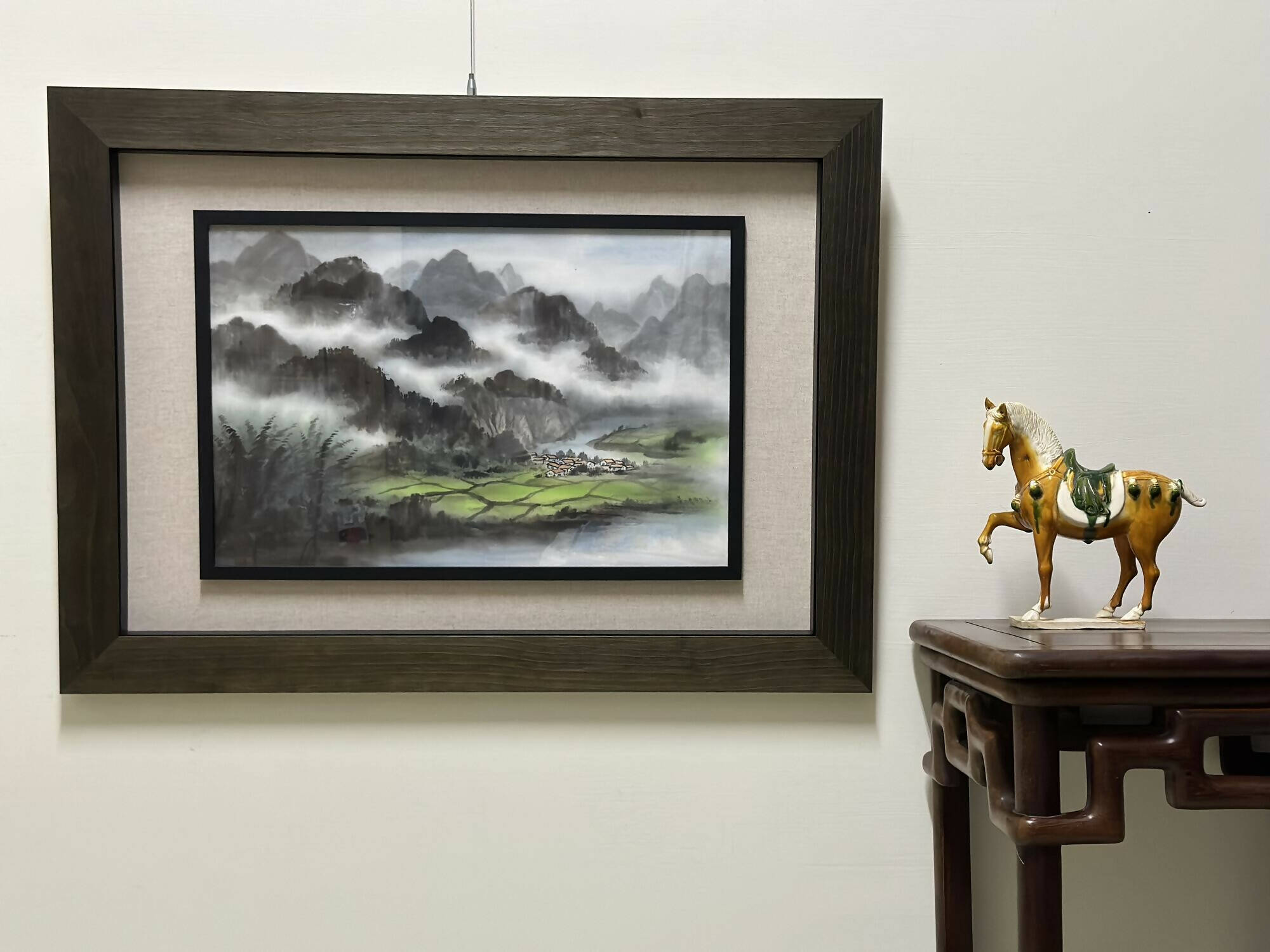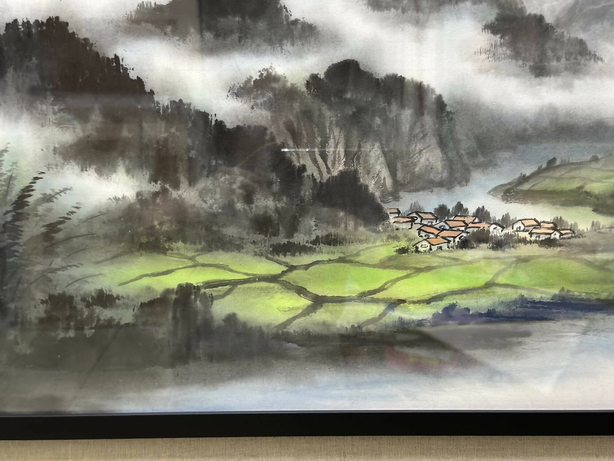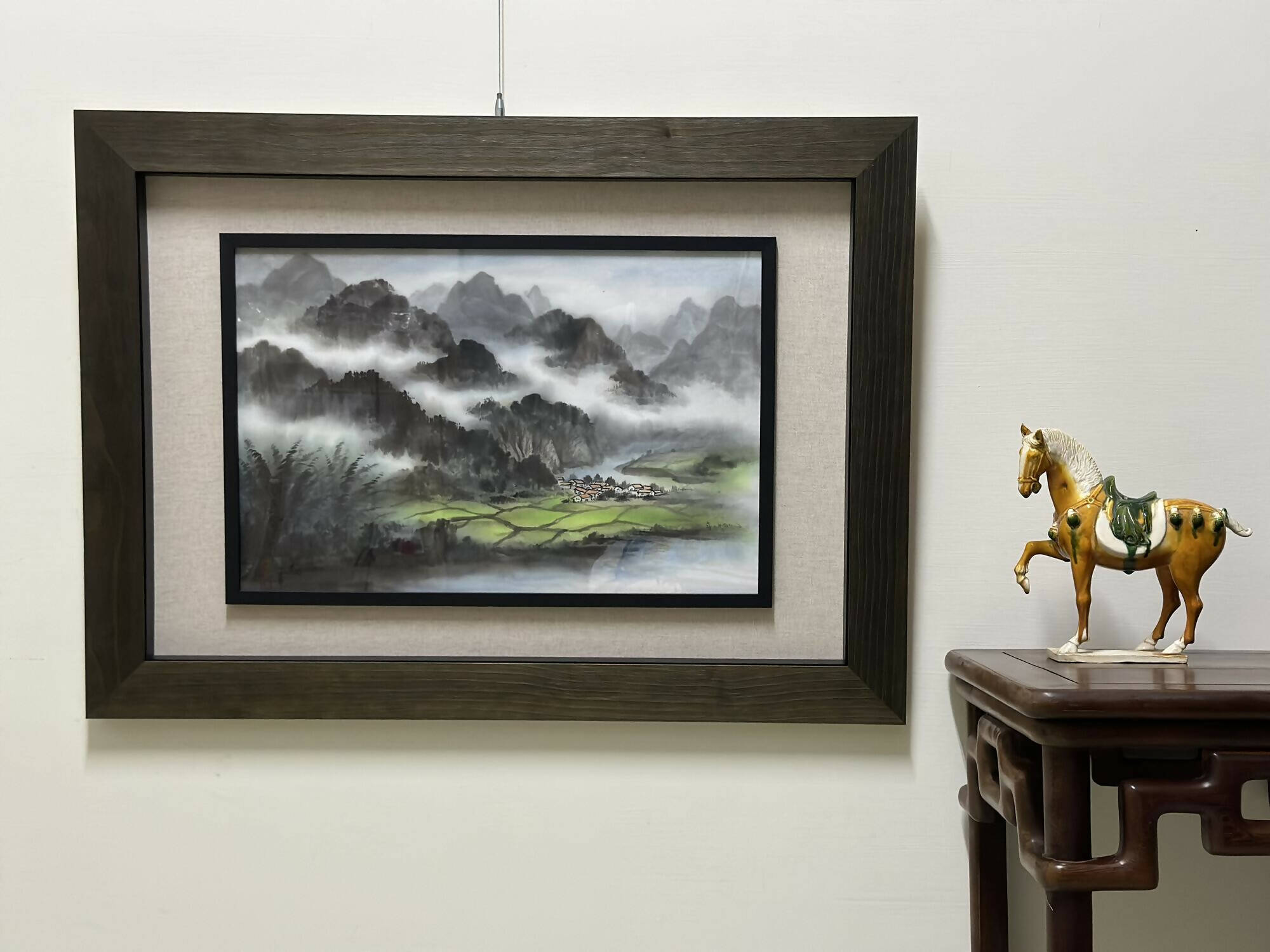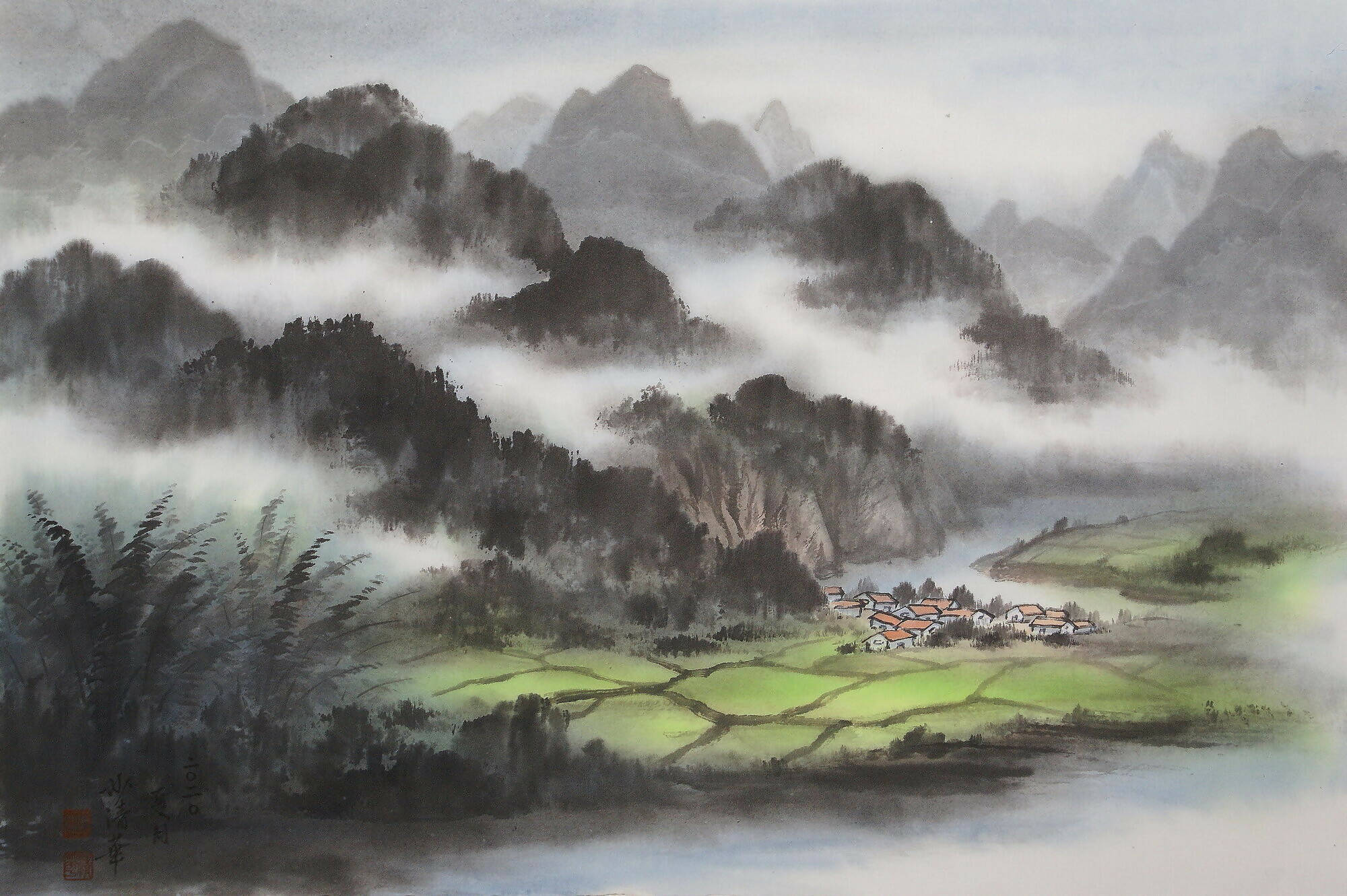 Beneath majestic mountains, their outlines gracefully softened by mist and rendered with impeccable ink wash techniques, lies a tranquil village. Lush rice fields cradle it, their vivid green tones anchoring the foreground. To the painting's lower right, a river winds its course, its path accentuated by a delicate haze that resonates with distant clouds, together setting an enchanting mood.