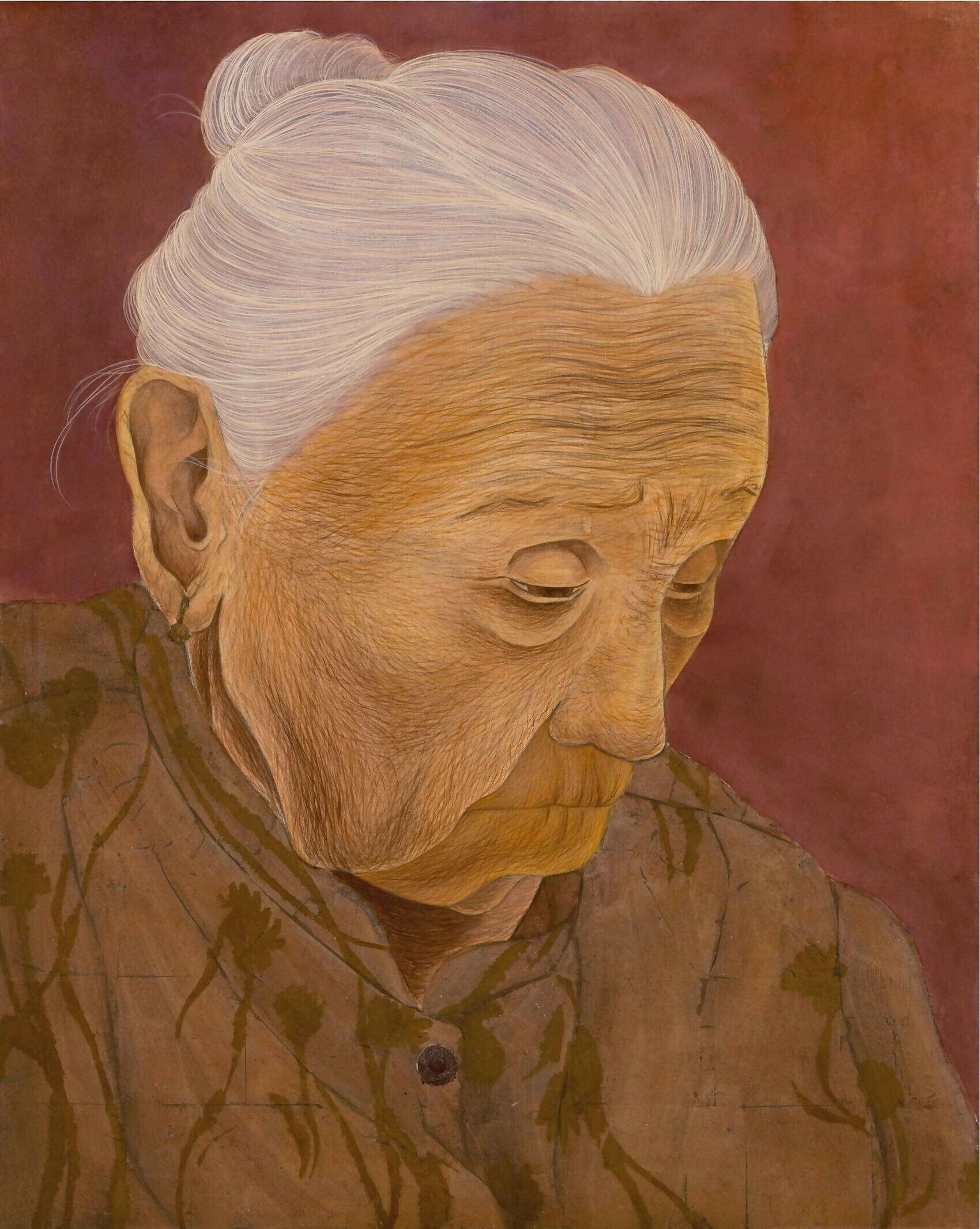 In this intimate portrait, the artist renders her grandmother's lifelike hair and skin with remarkable fluidity, achieved through countless delicate lines that serve as both a metaphor for the passage of time and a testament to their enduring emotional bond. Enhanced by silver foil accents, her neatly arranged attire and hair strike a compelling balance between simplicity and complexity, inviting endless interpretation and emotional engagement. It's a masterful display of the artist's technique and how she can inject raw emotion into her work.