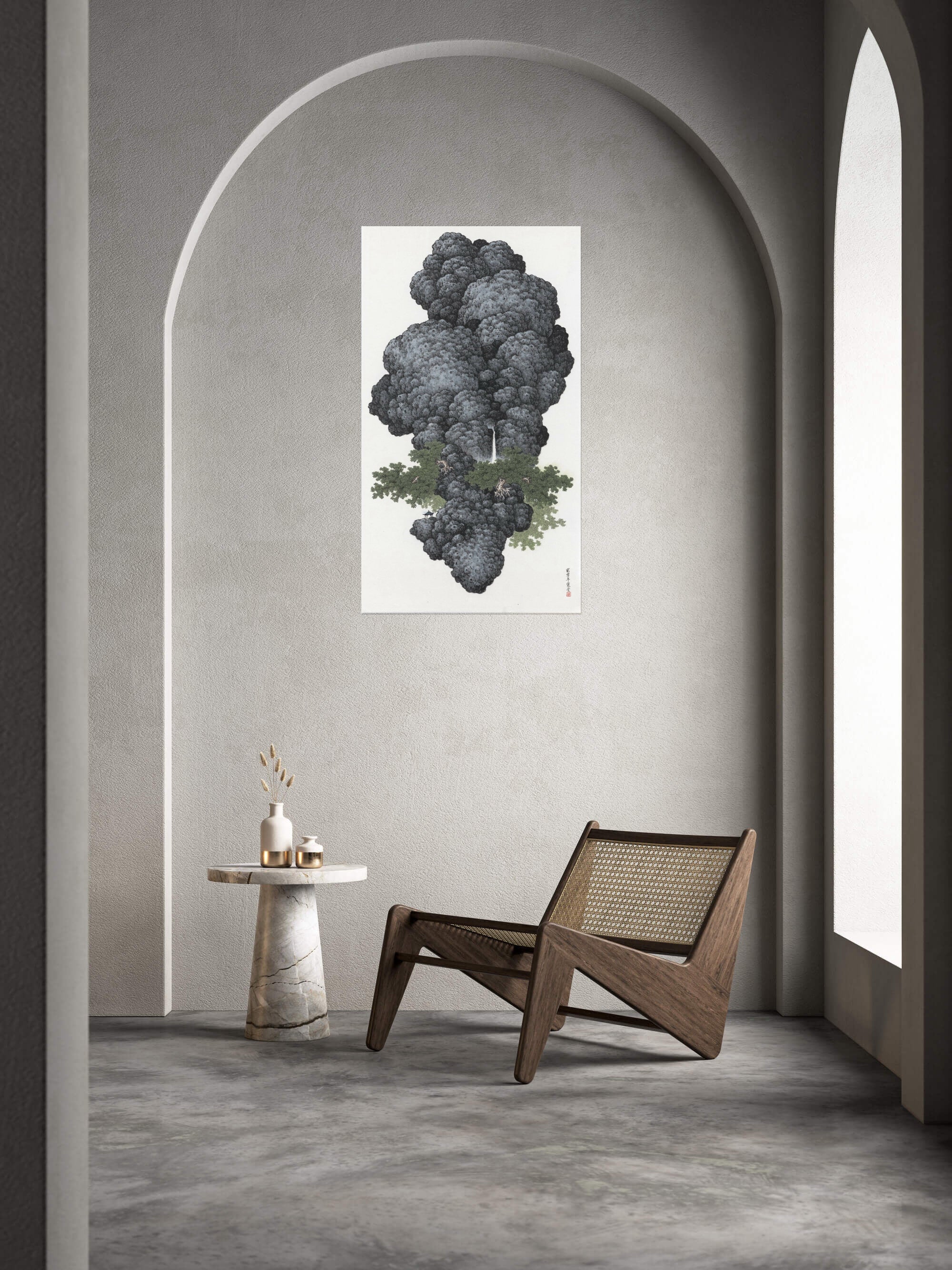 Ink-wash painting, unlike oil, lacks the benefit of coverage and opacity. One single misplaced stroke has the power to disrupt the entire artistic pursuit. There is no such thing as white ink; all white spaces are deliberate omissions on the paper. This juxtaposition of reserved white spaces—depicting clouds, mist, ripples, and streams—demands a high level of proficiency with the brush and a heightened awareness of aesthetics.