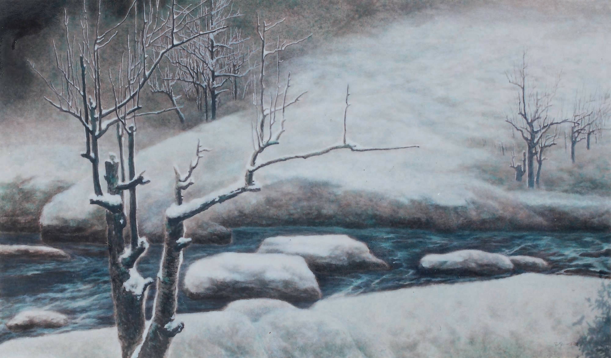 Titled Harmony in the Mountain Stream, the artwork features the classical Song dynasty (ca. 960 to 1279) composition technique "One river, Two banks," renowned for its essence of simplicity and depth. The distant and foreground banks, painted with vast expanses of snow-covered emptiness, evoke a profound sense of boundless desolation and tranquility.