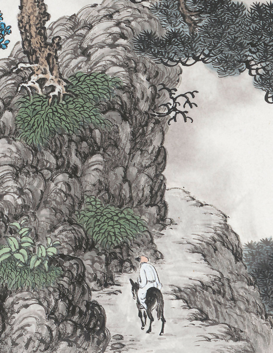 As we unroll this magnificent ink painting from left to right, the grandeur of towering mountains wrapped in swirling clouds emerges. Lush vegetation and verdant trees punctuate the rugged slopes while a solitary traveler atop a donkey is leisurely wandering through the mountainous terrain, gazing contemplatively into the distance, wondering what sights await him.