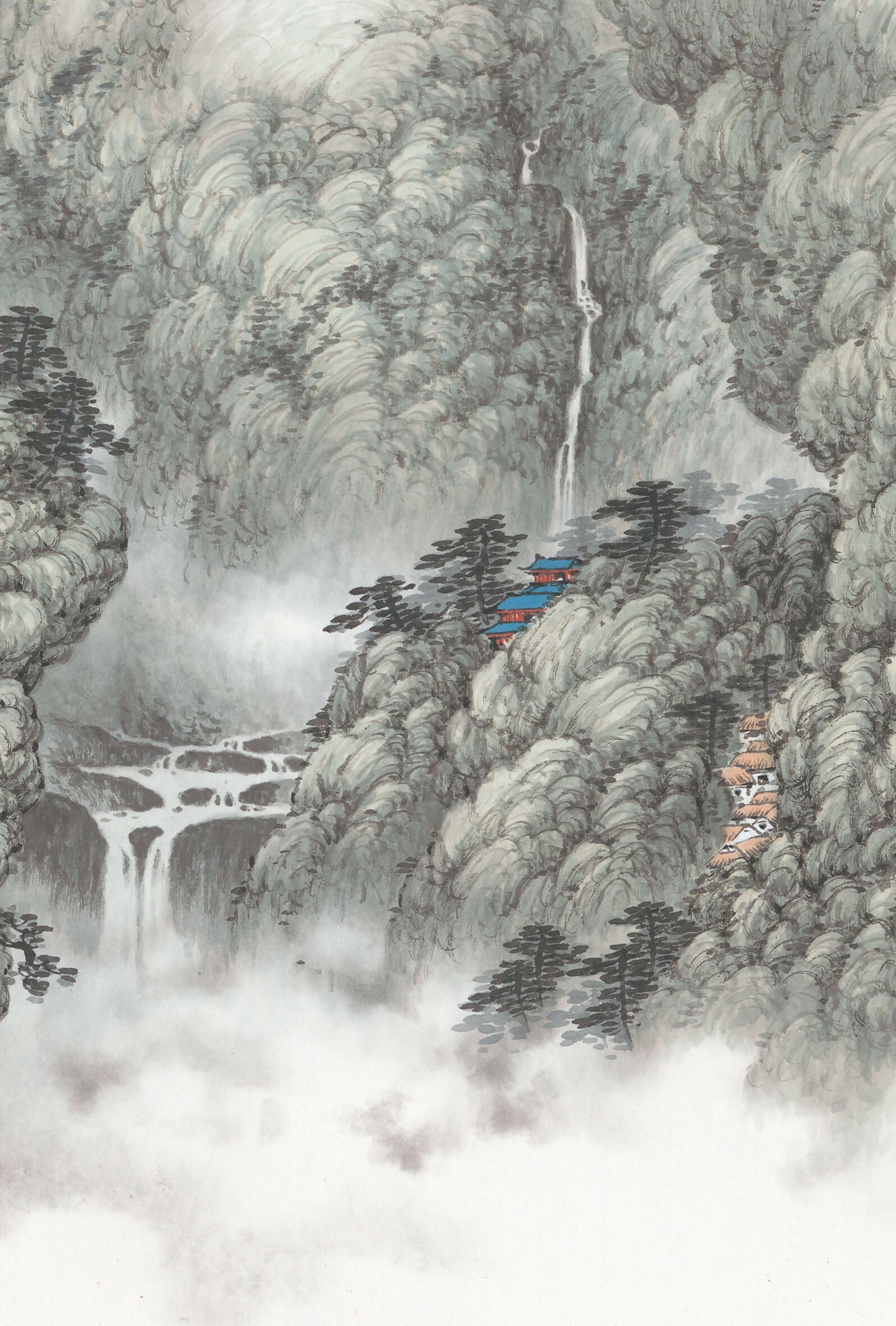 As the painting continues to reveal itself to the right, distant mountains come into view amid the rolling clouds. Cascading waterfalls descend down rocky cliffs and babbling springs trickle melodiously, while pavilions and cottages nestle harmoniously within the mountain's embrace.