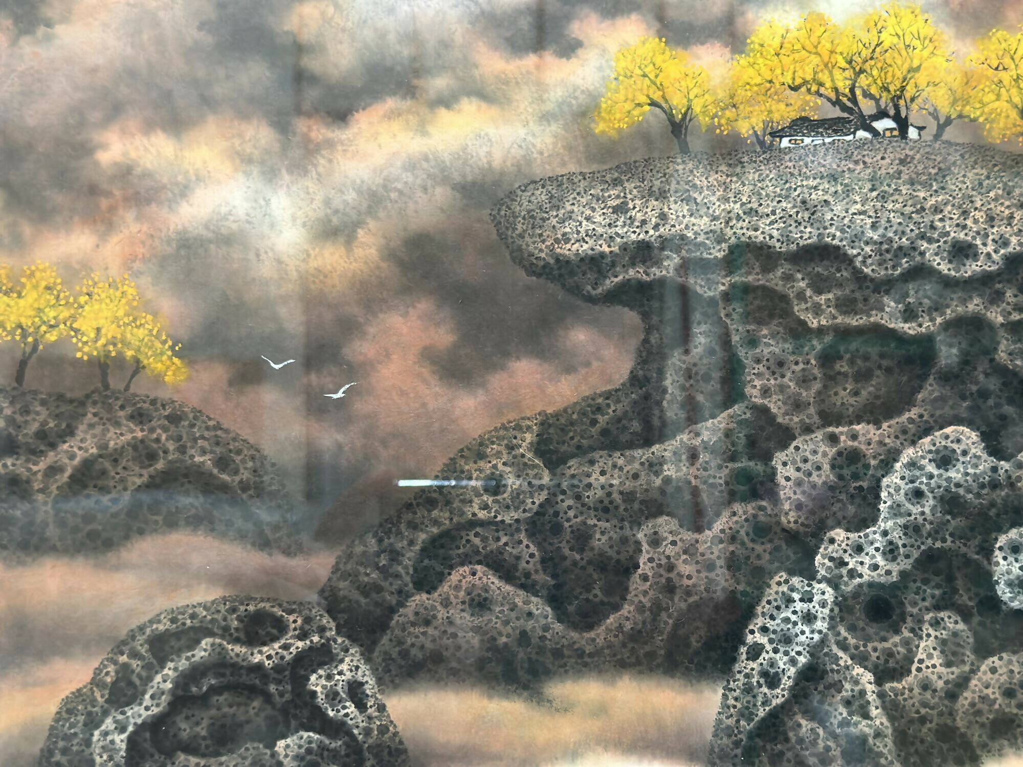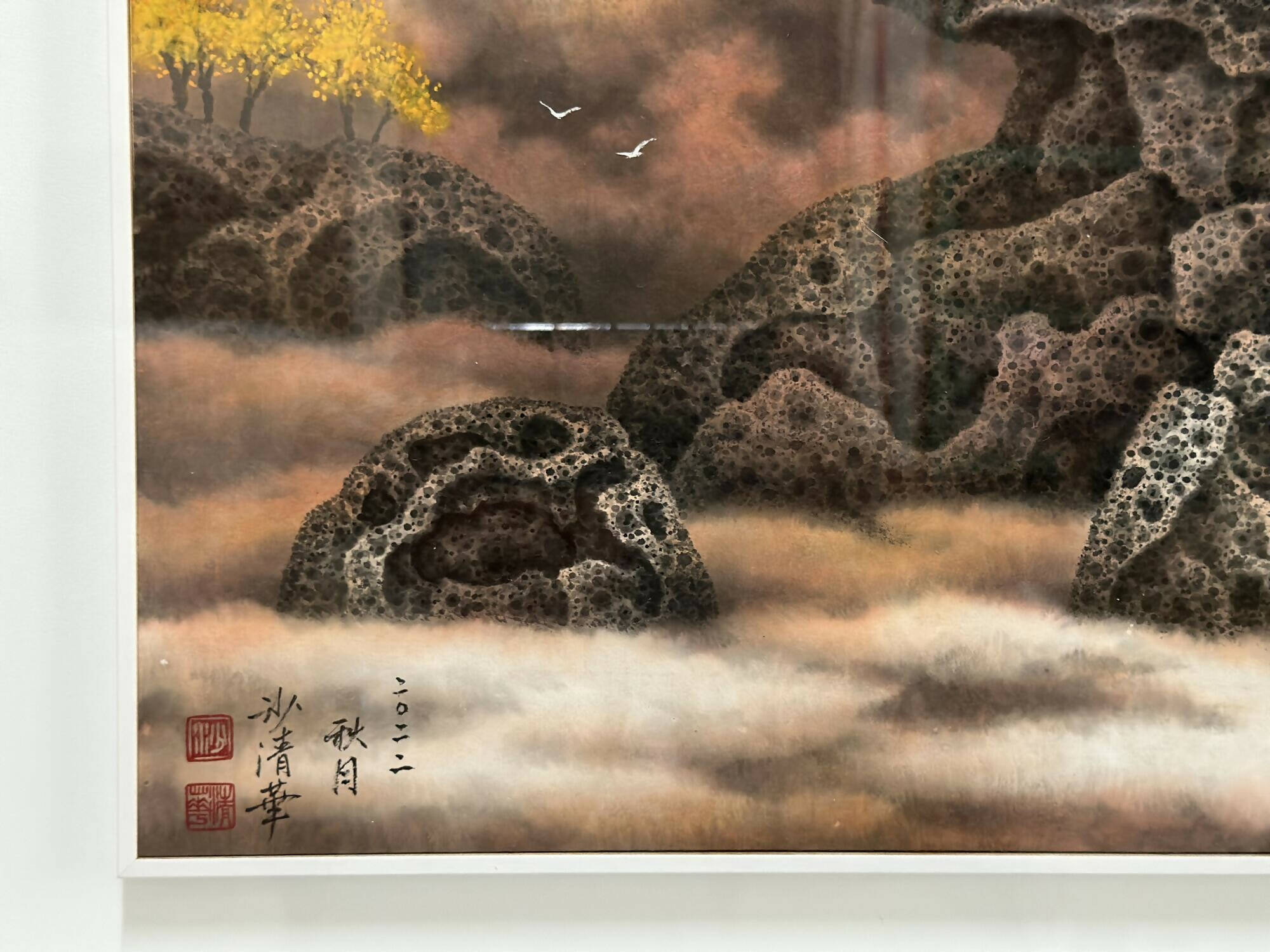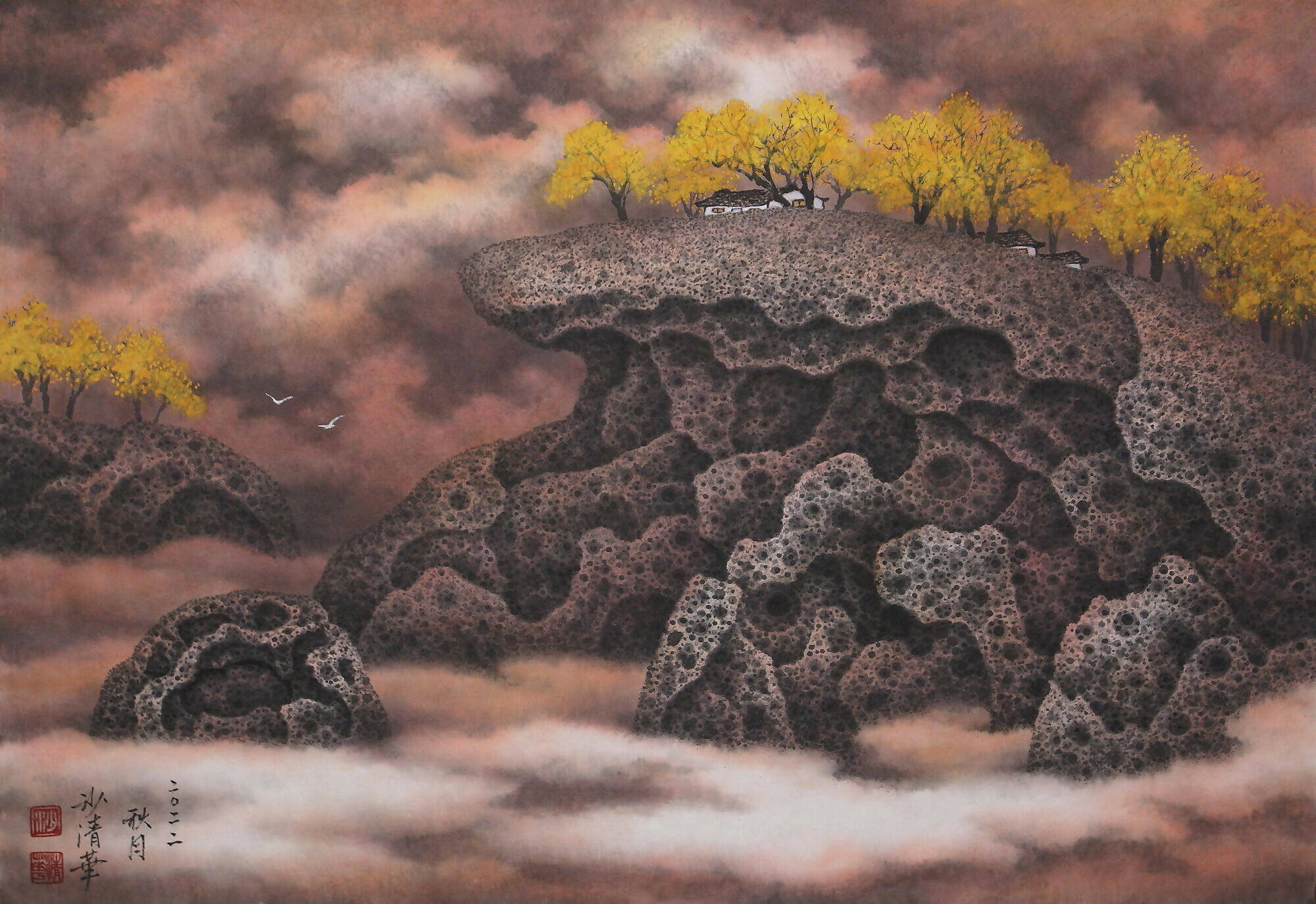 Anchoring this ethereal world are ancient rocks, their surreal textures mirroring the millennia-long weathering seen in "beehive rocks." The realistic depictions of hollow depressions on the rock's surface are achieved through meticulous and repetitive brushwork, which captures the essence of time's passage and hints at the myriad universes they hold.