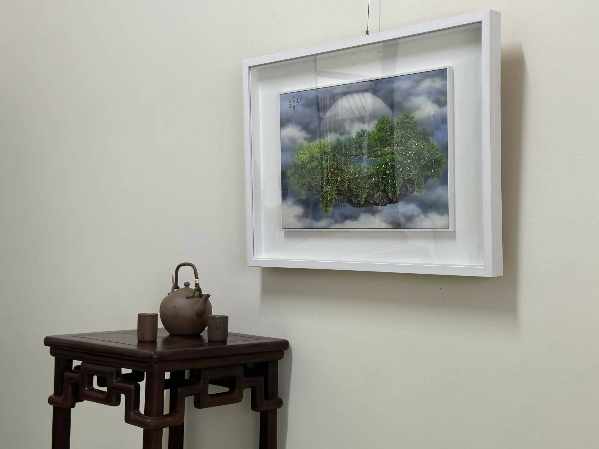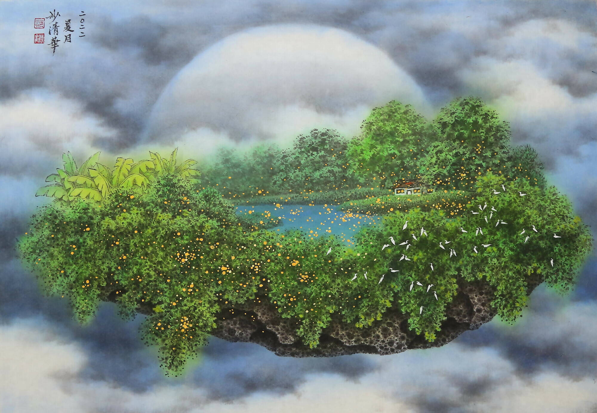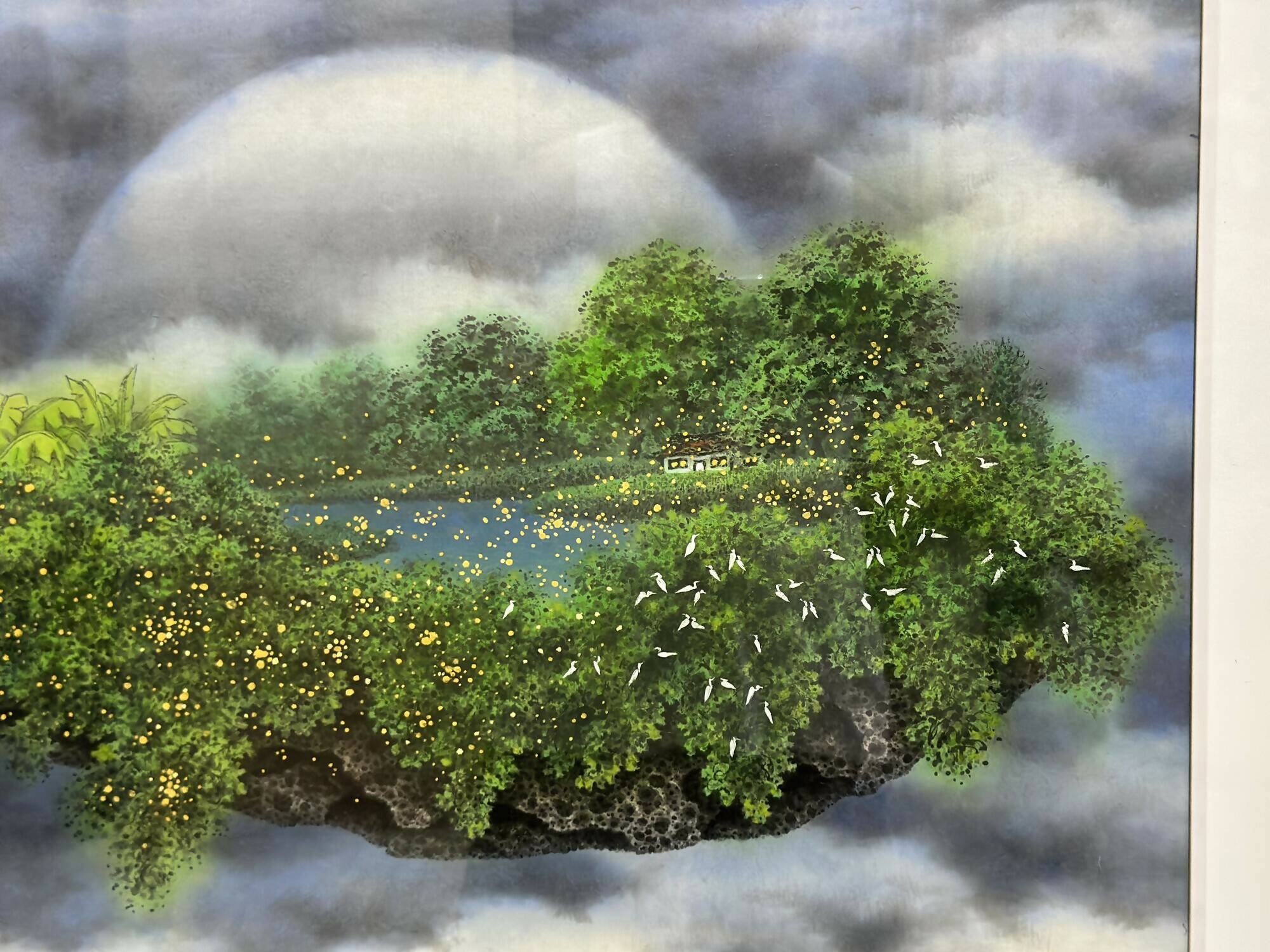 Using the motif of a floating land, the series illustrates the intangible quality of memories. The recurrent portrayal of the family home emphasizes its constant and steadfast presence in our psyche. The warm yellow glow emanating from the windows symbolizes the warmth and cherished memories a home holds.