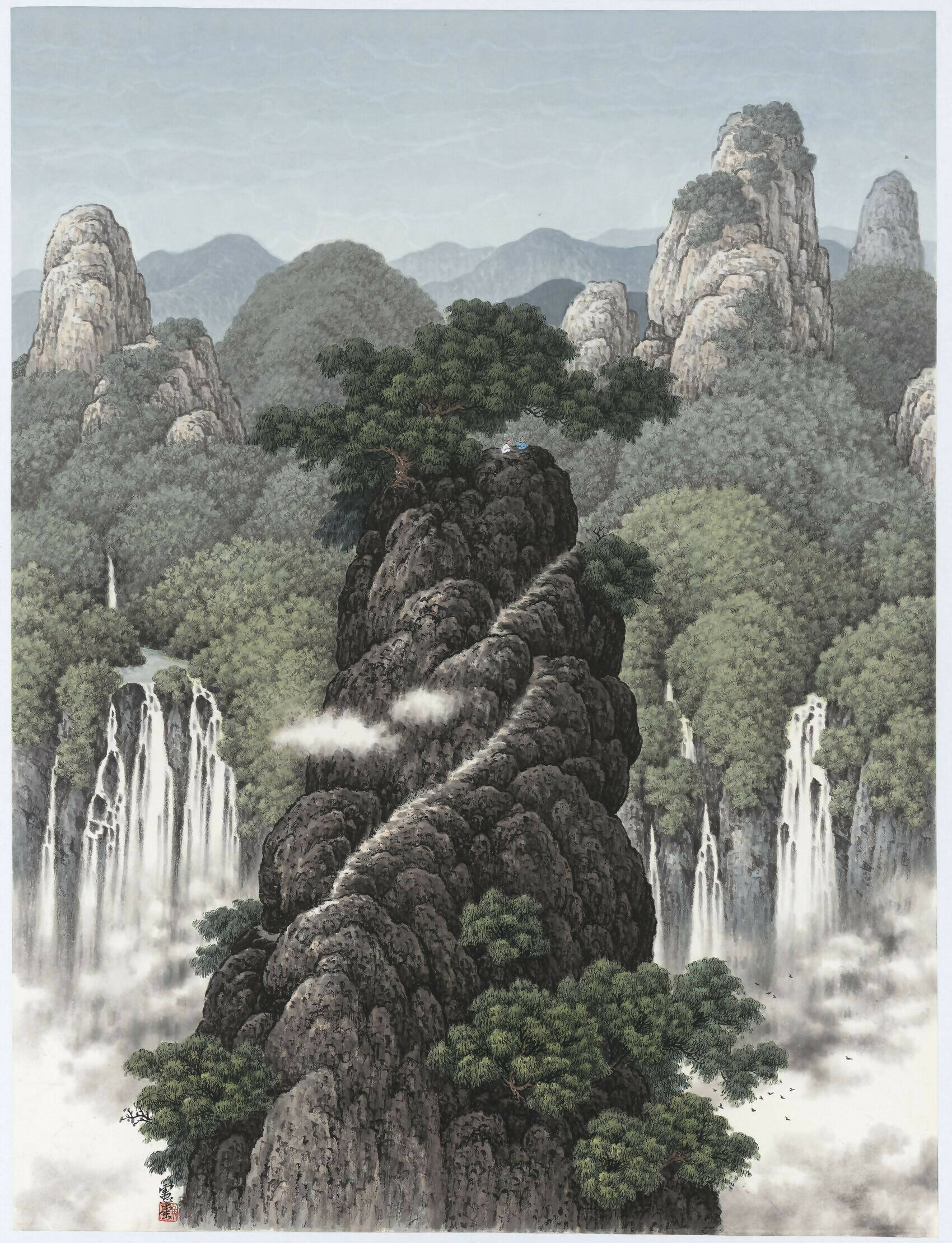 Navigating the serene terrains of Hou Xiantang's paintings, the audience finds itself transported beyond the mundane. Hou employs a distinct M-shaped brush stroke that lends an intriguing blend of vitality and enigma to the mountainous landscapes he presents as his ultimate "hidden paradise." This technique affords remarkable versatility, layering strokes to evoke towering, rugged mountains or employing a softer touch to suggest lush, dense forests.