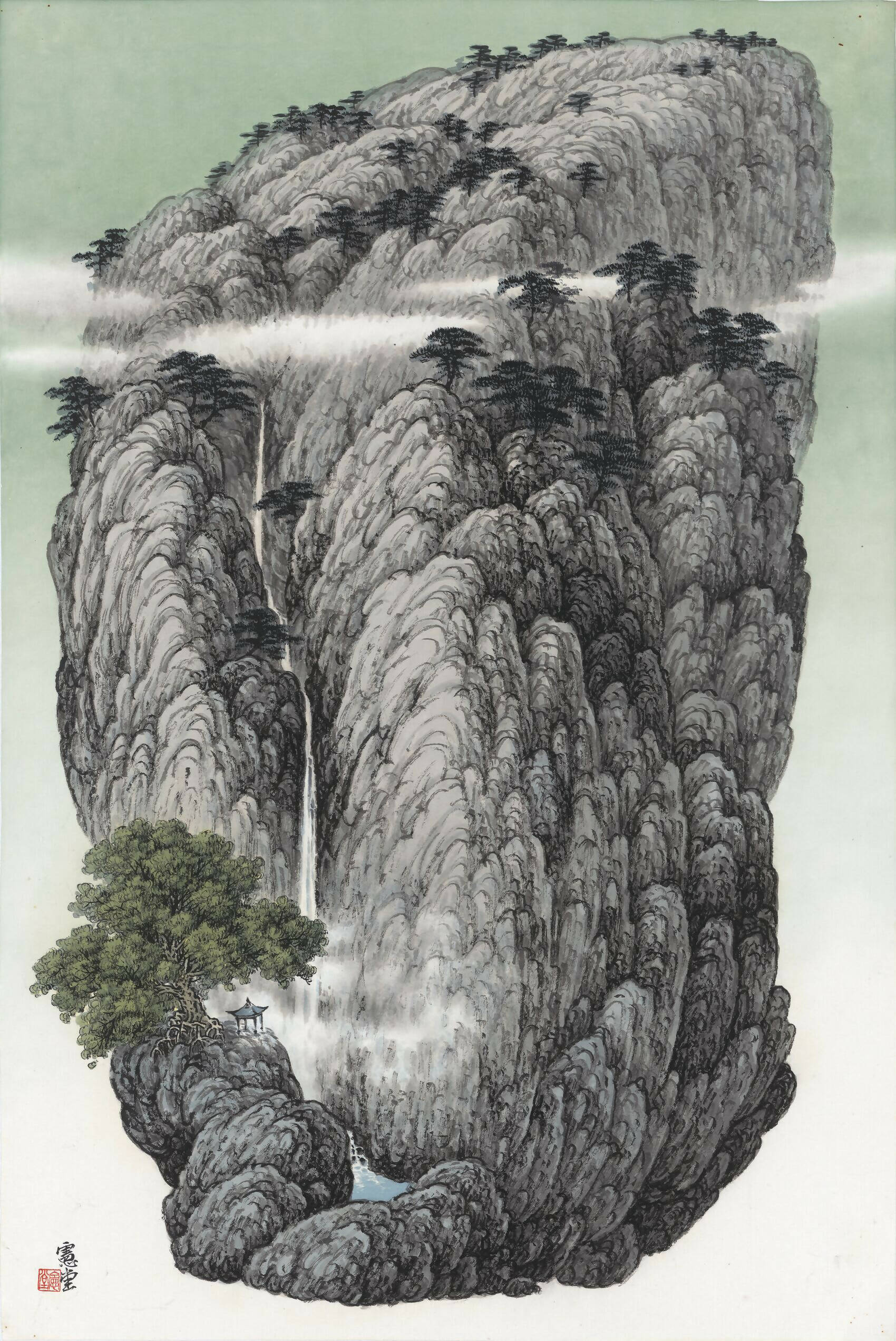 A massive mountain takes center stage in this artwork, its majesty heightened by cascading waterfalls and evergreen pines. The artist's skillful brushwork meticulously conveys this imposing peak's formidable and rugged character. Among the towering trees, scattered dwellings invite us into this enchanting haven. It is a piece that beautifully juxtaposes grandiosity and intimacy.