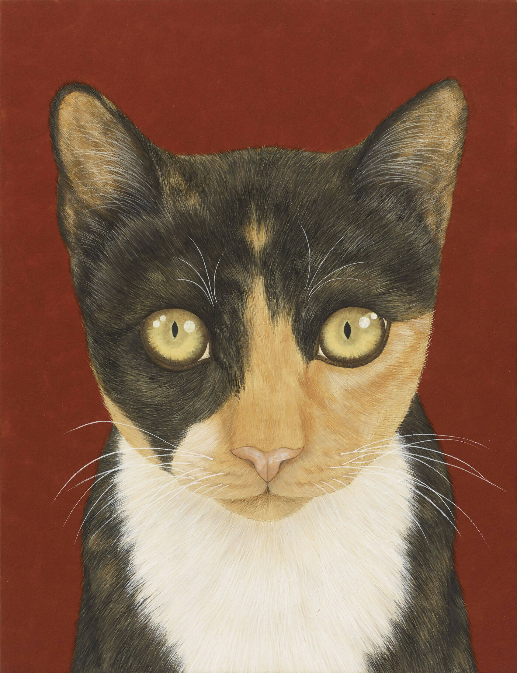In this compelling piece, the artist captures the enigmatic gaze of a plump cat with eyes as radiant as jade. The work demonstrates meticulous craftsmanship in rendering the animal's fur—an intricate mosaic of fine lines and tonal subtleties. This dynamic between observer and observed blurs the lines of conscious awareness, serving as an evocative exploration into the reflective nature of existence.