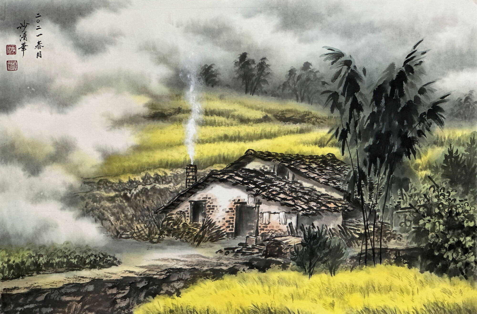 Amid a sweeping field of golden rapeseed flowers, radiant in spring's embrace, a cottage stands at the centre of this vivid tableau. Delicate plumes of smoke rise gracefully from its chimney, merging with the pristine sky above.