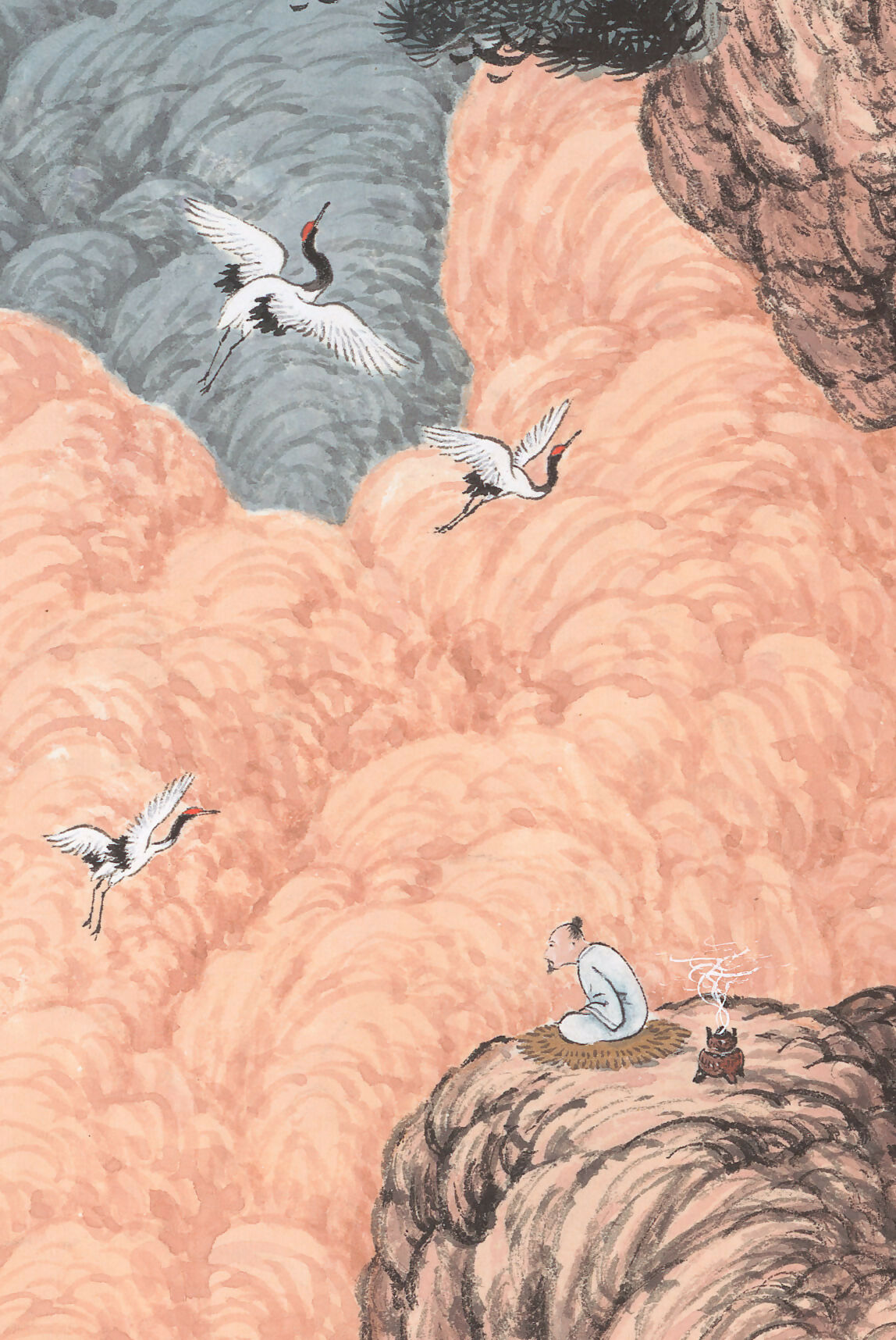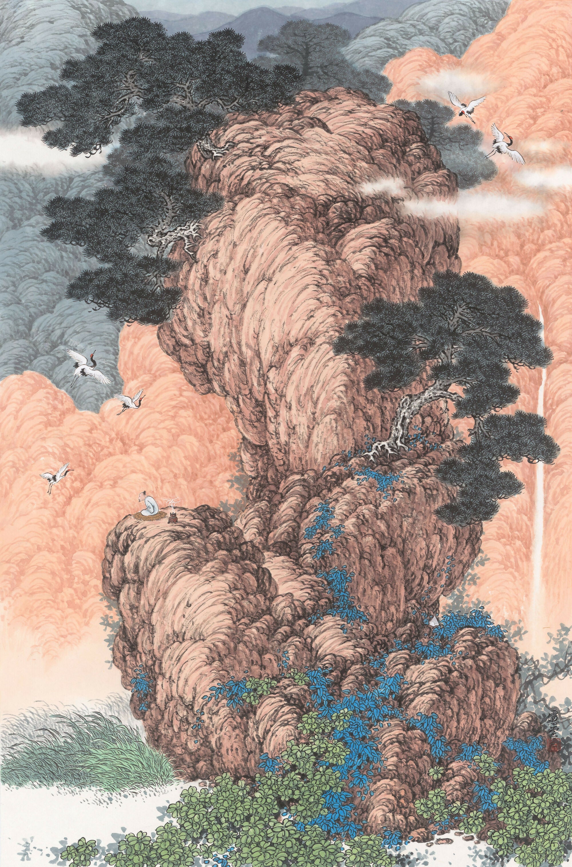 Upon examination of the focal mountains and rocks within the composition, one can discern the artist's deft brushwork characterized by an abundance of "flying white" strokes. These swift and spirited marks, created as the brush swiftly traverses the paper, encapsulate the artist's impassioned creativity, resonating poetically with the title of the painting, "Leisure Clouds and Wild Cranes." The exuberant brushstrokes coalesce harmoniously to form the robust and grandiose mountainous forms, which are emblematic of the artist's mastery in achieving a delicate equilibrium between dynamism and serenity.