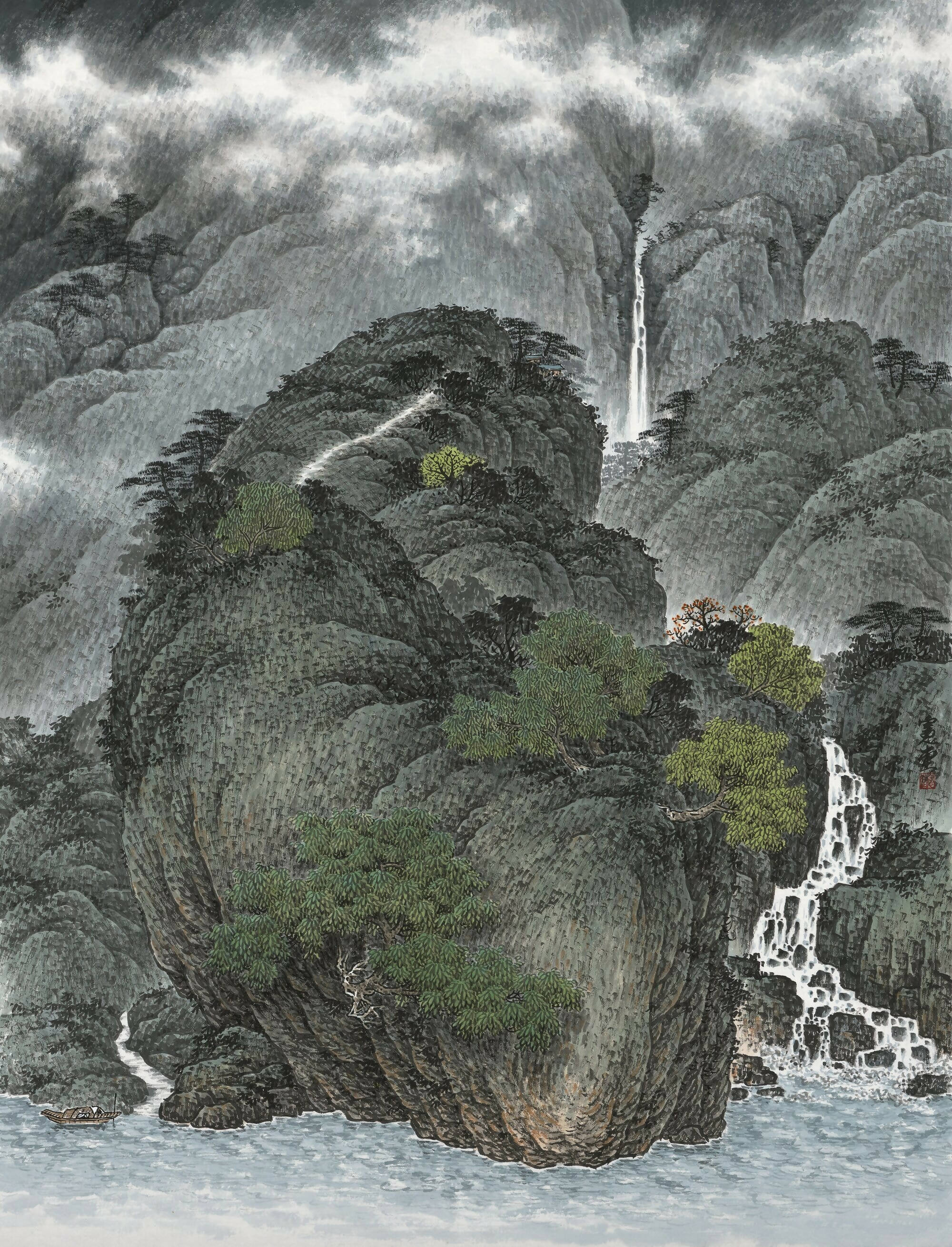 Navigating the serene terrains of Hou Xiantang's paintings, the audience finds itself transported beyond the mundane. Hou employs a distinct M-shaped brush stroke that lends an intriguing blend of vitality and enigma to the mountainous landscapes he presents as his ultimate "hidden paradise." This technique affords remarkable versatility, layering strokes to evoke towering, rugged mountains or employing a softer touch to suggest lush, dense forests.