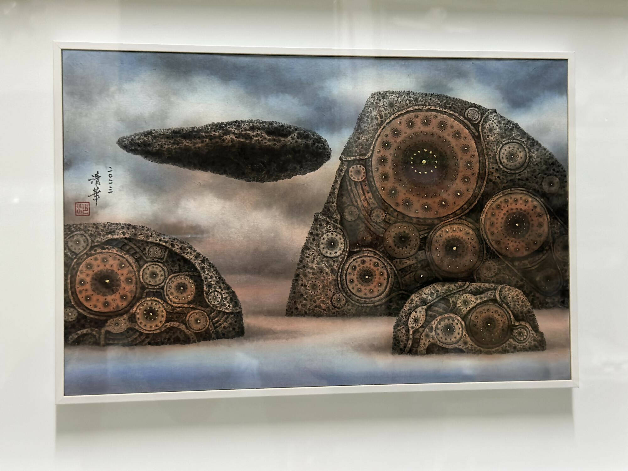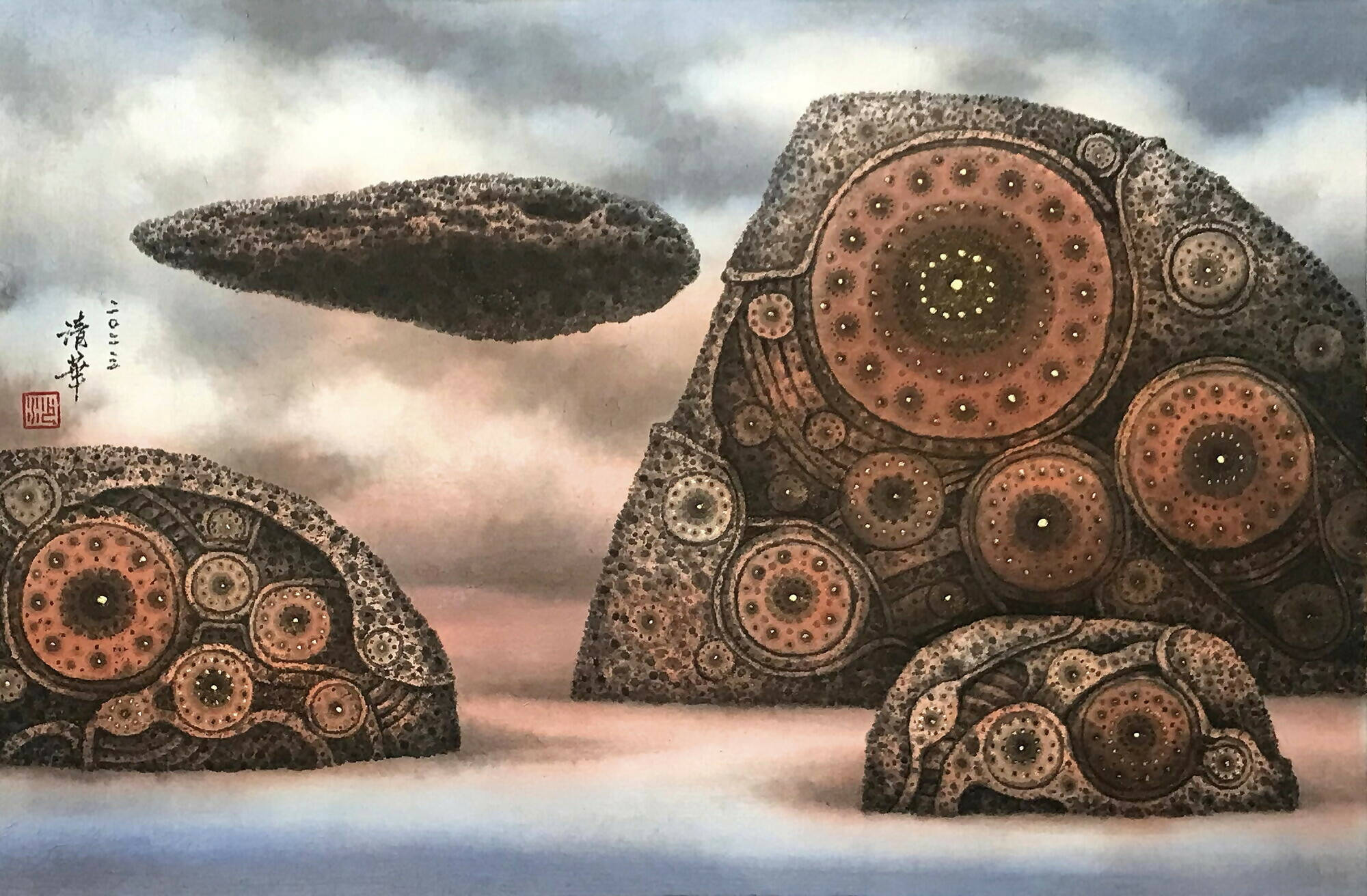 In Sha Qinghua's "Mechanical Landscapes" series, ancient rock surfaces are reimagined, with their myriad cavities morphing into intricate, interconnected fantasy gears. The ceaseless motion of these gears represents the enduring imprints of time's passage, prompting reflections on its relentless flow. Each gearwheel is a testament to the vast interconnectivity of the cosmos.