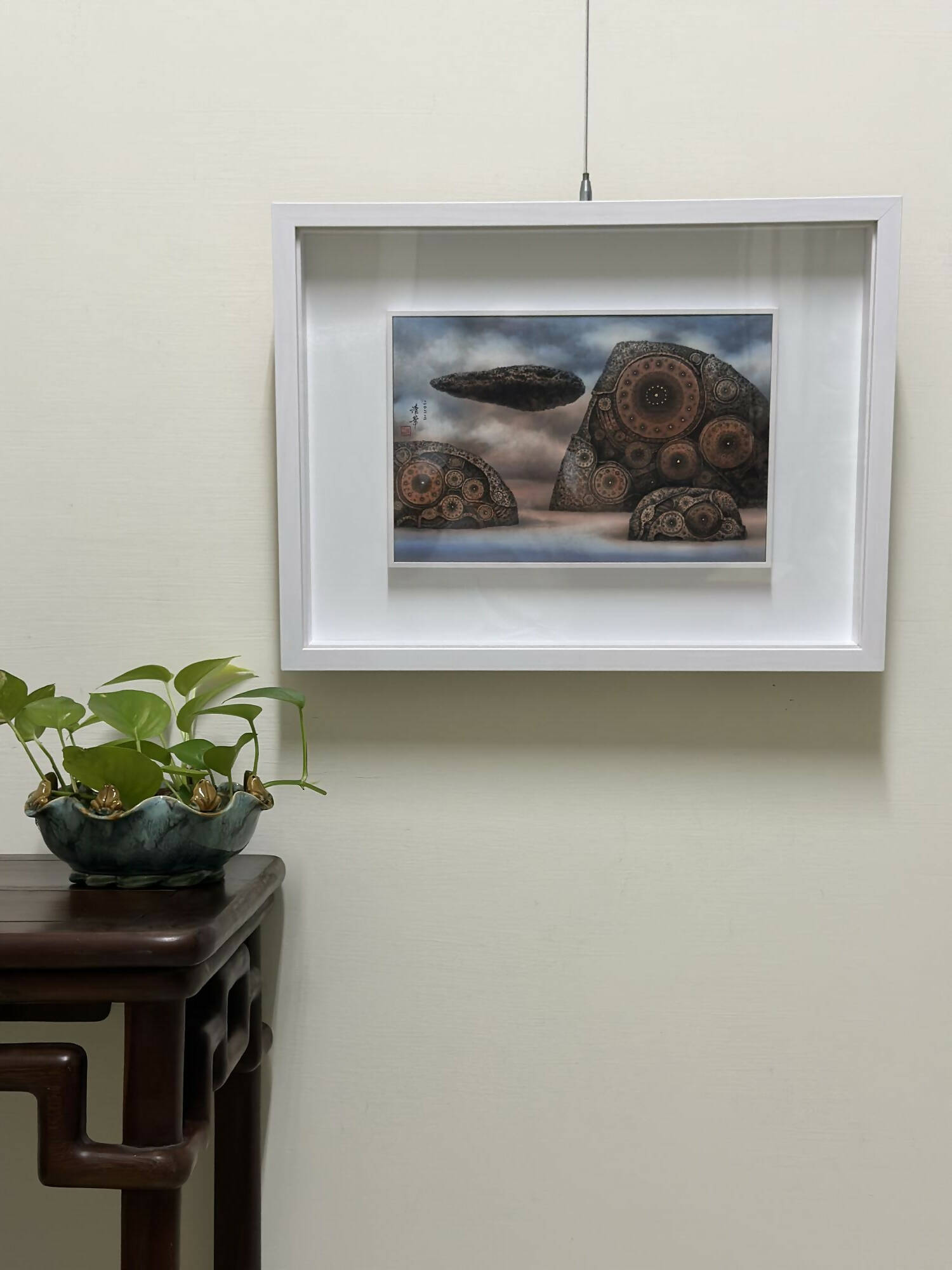 In this piece, an ancient, monumental stone mysteriously hovers in the upper-left quadrant against a vast, overcast expanse, introducing a nuanced balance to the artwork. The levitating mountain symbolizes life's potential for unburdened freedom. Set against the boundless backdrop of the cosmos, the painting reminds the audience that when viewed from a grander perspective, even our most pressing troubles diminish in significance.
