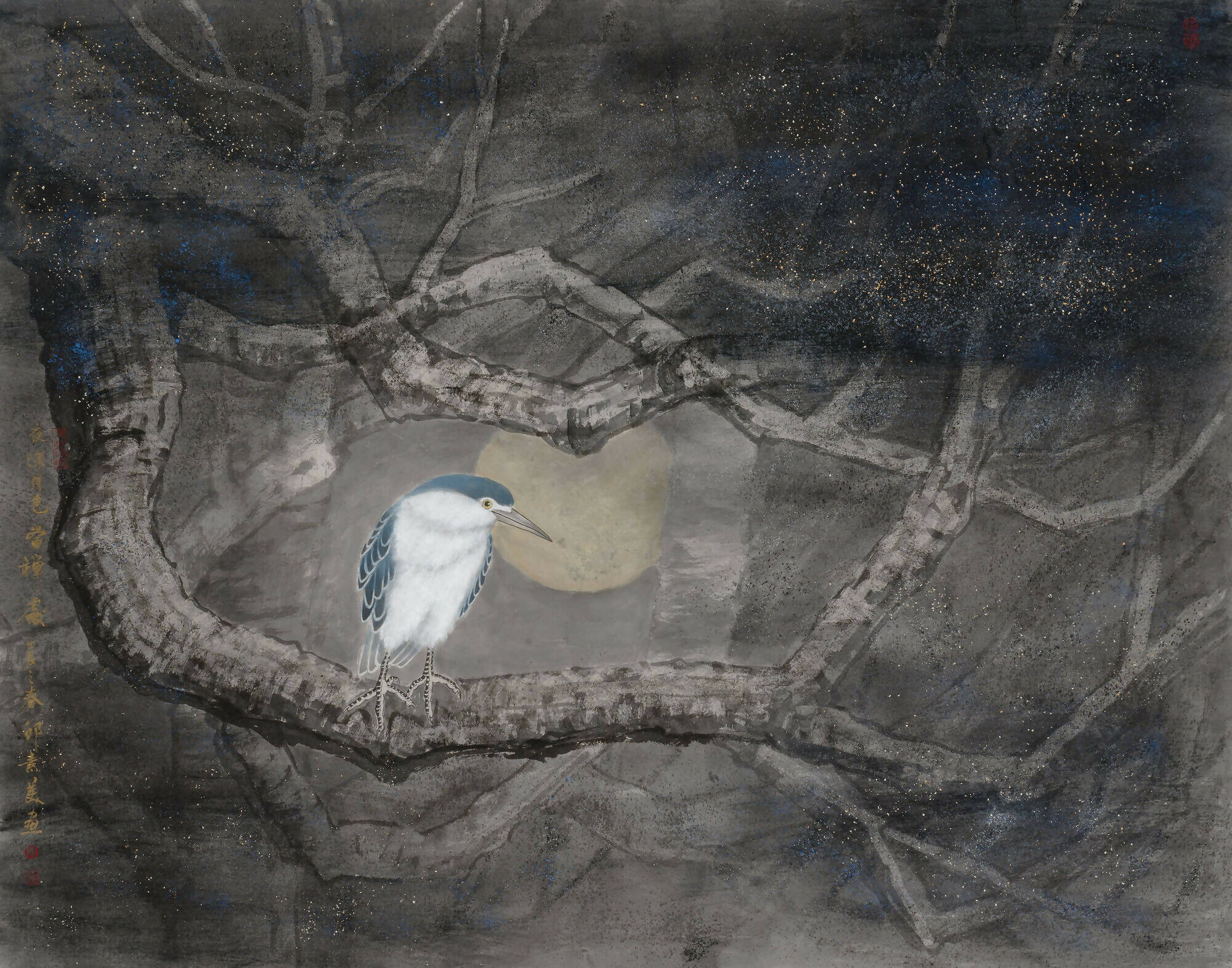 In "Moonlight Meditation", the artist captures the serenity of nighttime, illuminated by an overhead moon. Against this tranquil backdrop, a night heron perches on a rugged, twisted branch, seemingly savouring the calm. The artwork showcases her masterful ink brushstrokes, which skillfully convey the tree bark's texture and the night sky's depth. Vigorous, twisting branches frame the radiant moon and tranquil heron, creating an impactful composition as a window into a peaceful nocturnal landscape.