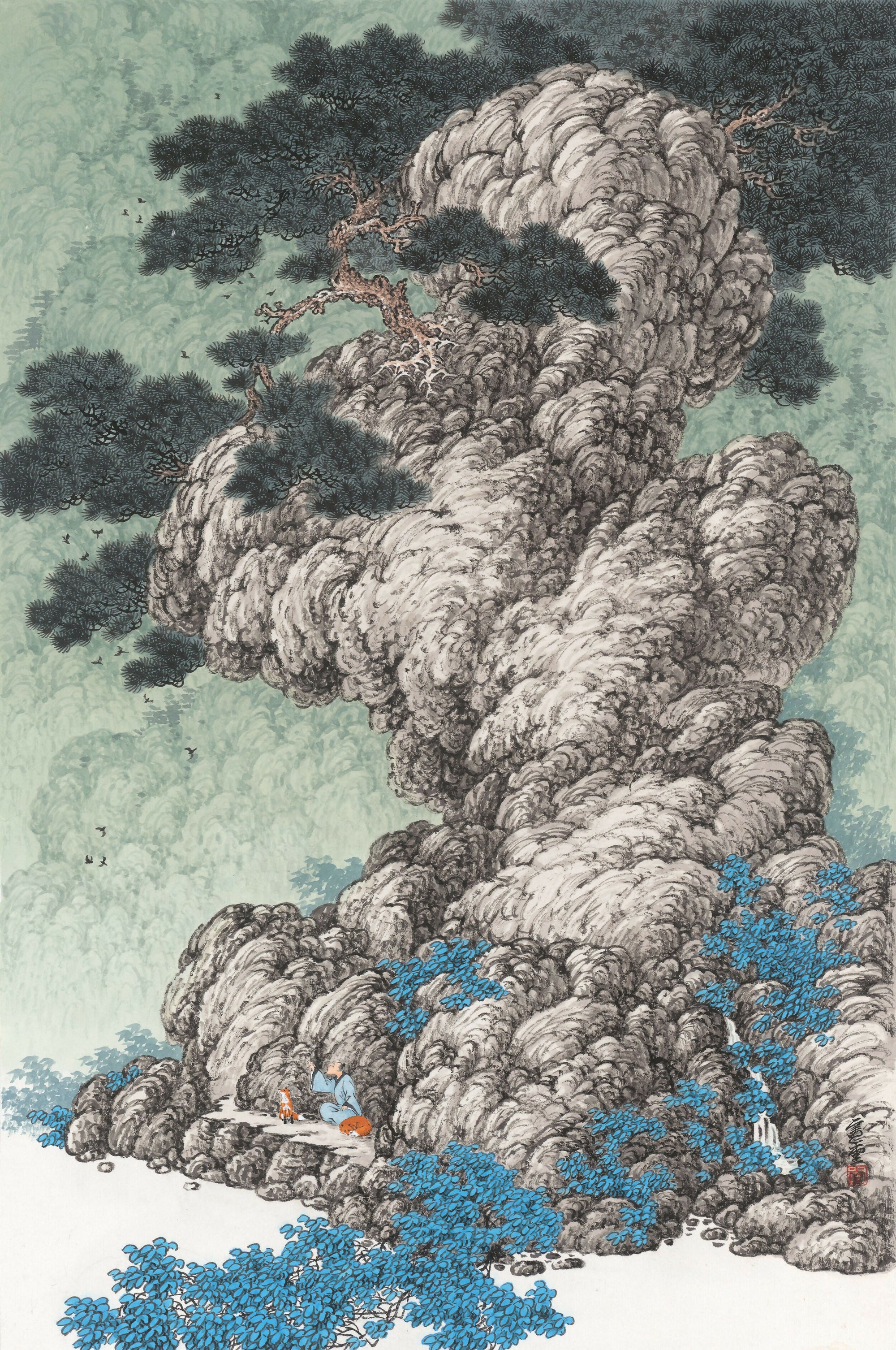 Hou's distinctive textured brushwork breathes life into the central mountain, evoking an image of a monumental tree firmly entrenched in the earth. The artist's skillful strokes reveal the mountain's contorted shape and jagged textures, drawing us into its world.