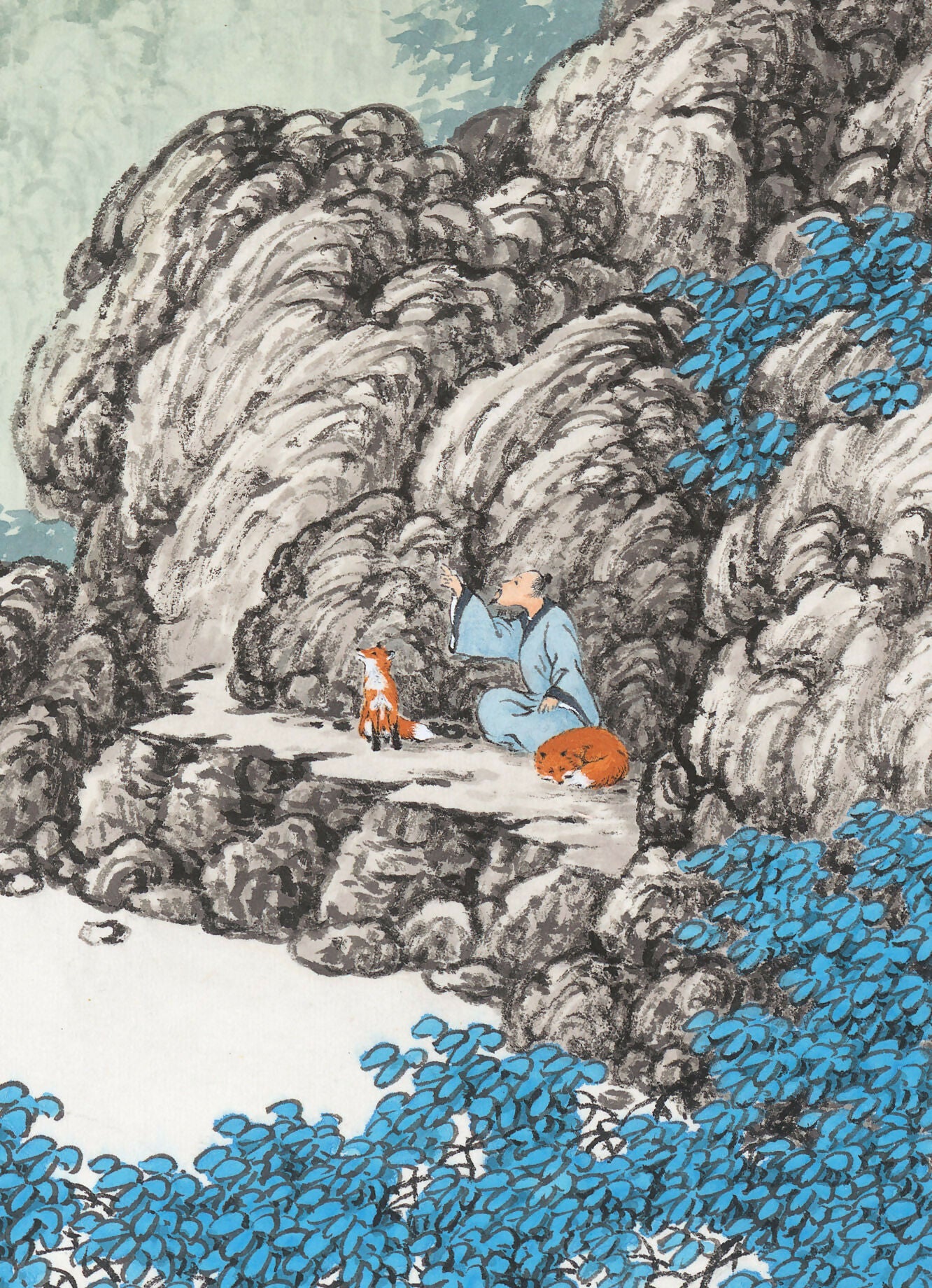 Amid the tranquil landscape at the mountain's foothills, a recluse seeks solace in the company of two foxes. As the three of them observe a flock of birds gliding gracefully overhead, a harmonious interplay between humanity and nature unfolds.