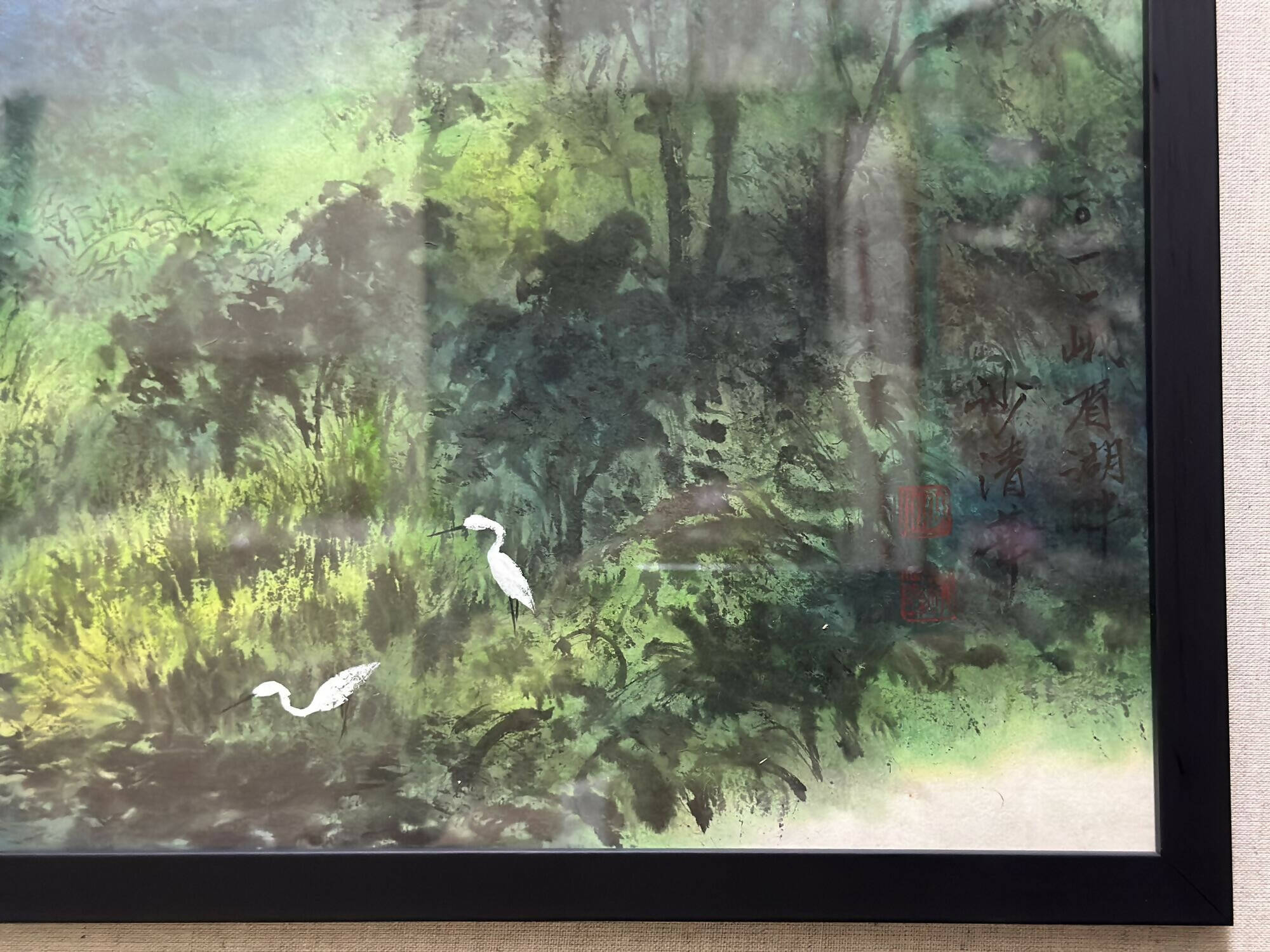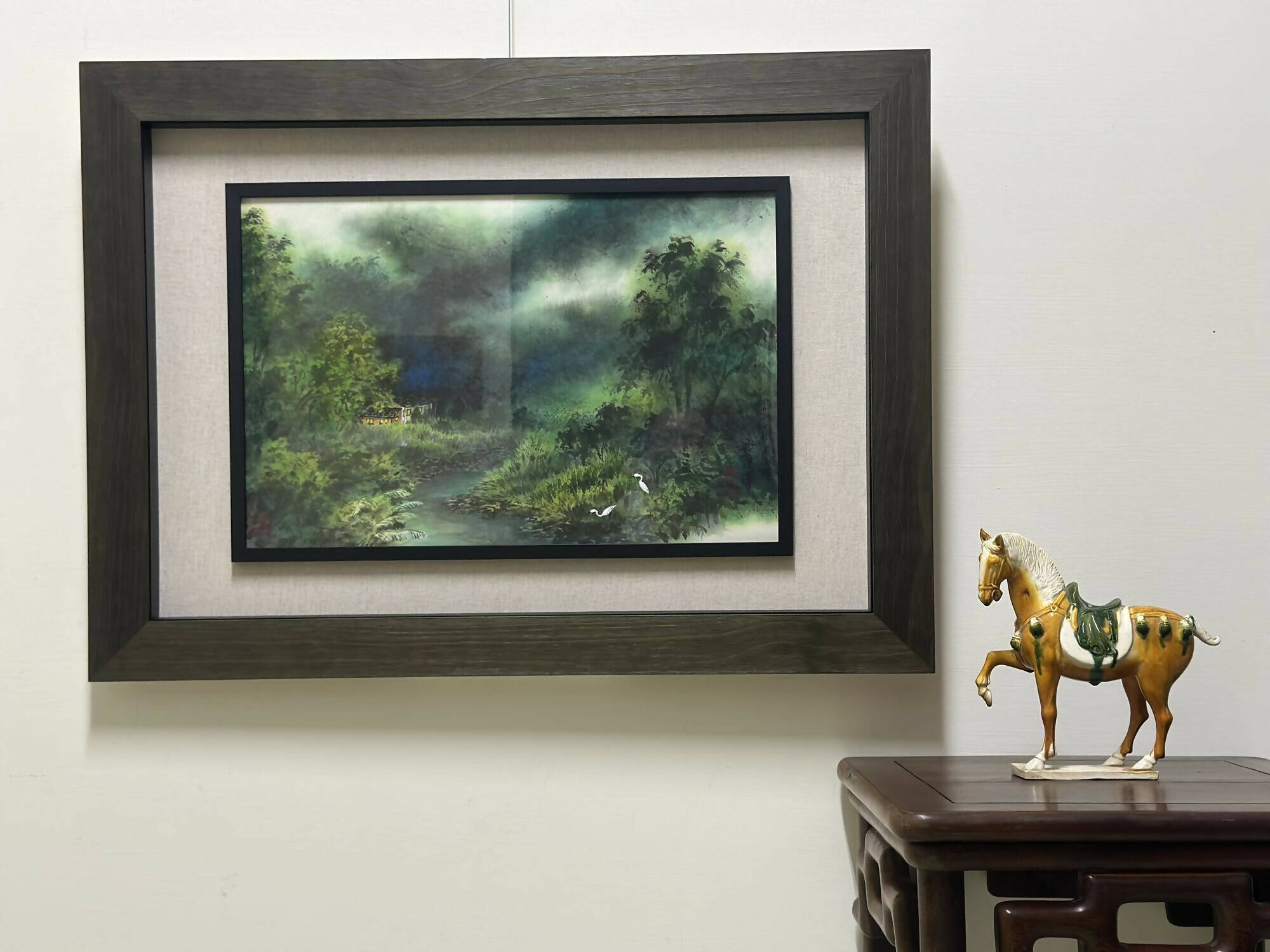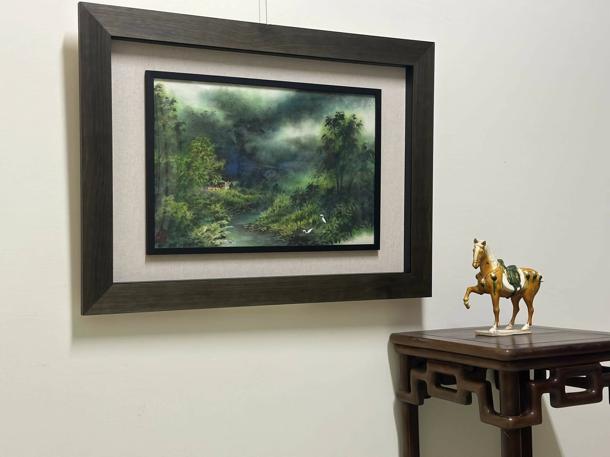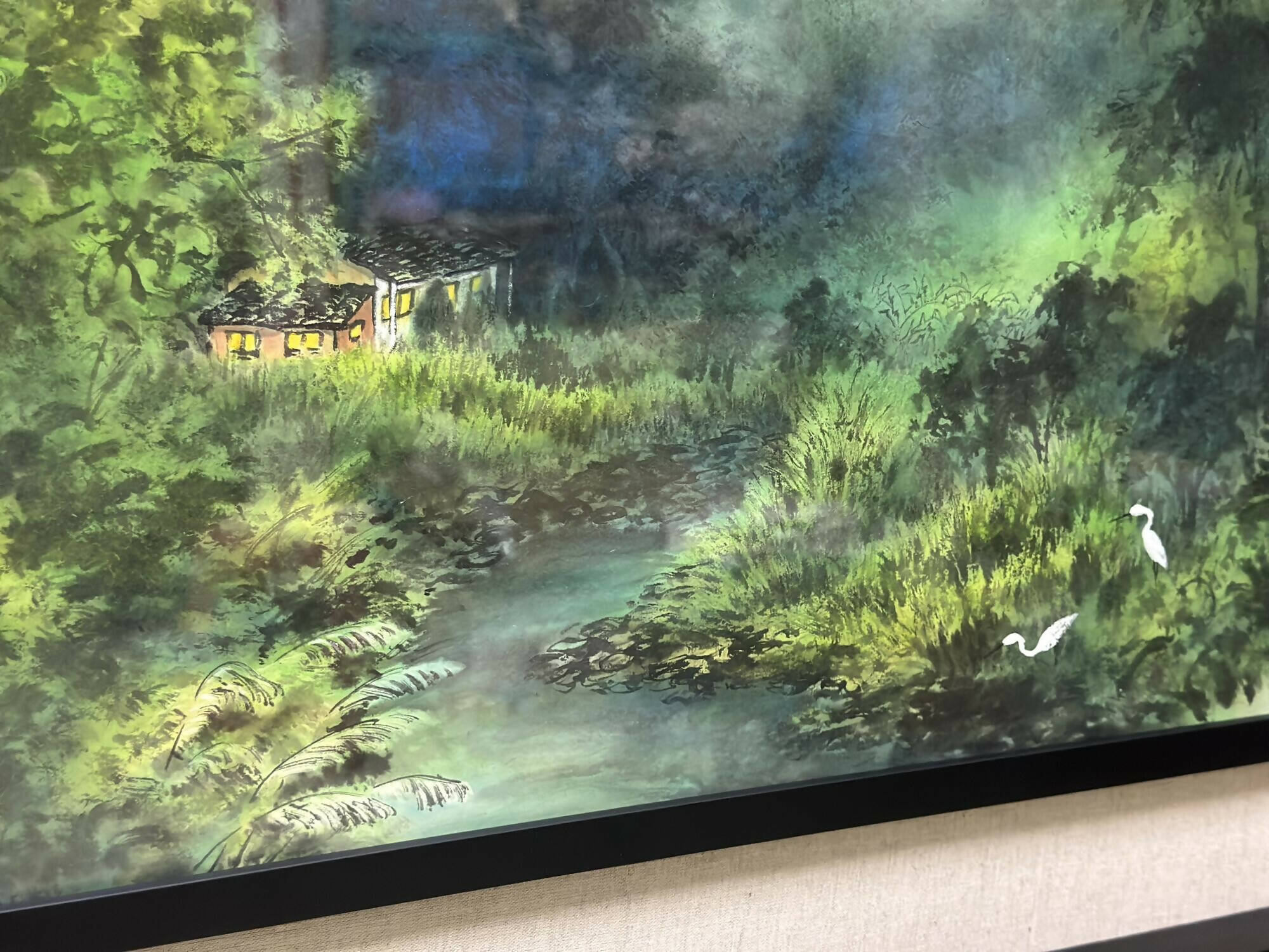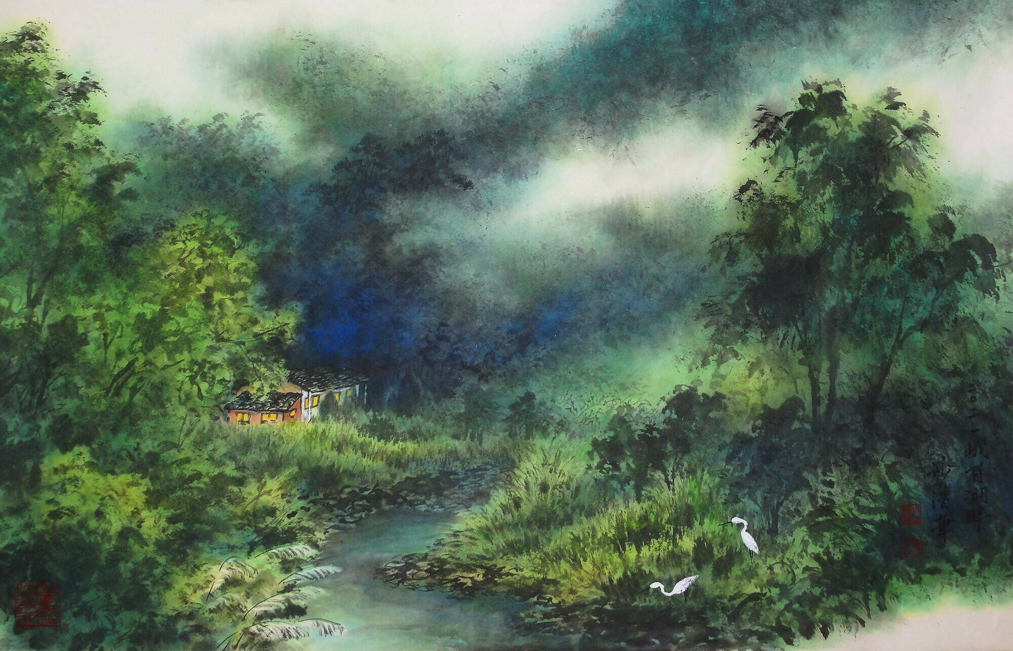 A quaint cottage is nestled amidst lush, verdant woods, and in the distance, an enveloping mist and a gently winding stream make an appearance – a scene that evokes serenity. Two graceful egrets emerge in the lower right corner, introducing a subtle vitality to the otherwise tranquil montage.
