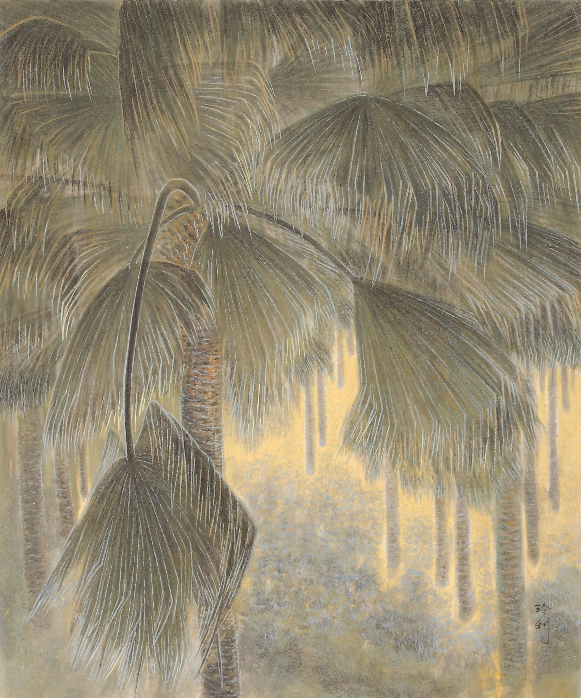 "Palm Tree Grove" portrays the forest's growth in subtle light. To depict the palm trees' graceful movement and emphasize the lushness of the terrain, the artist uses skillful, meticulous brushstrokes applied repeatedly in mild shades of gold and soft cyan to enrich the composition. The delicate rendering of light and shadow through graceful and rhythmic brushwork enlivens each palm tree with an ethereal presence, evoking a sense of awe.