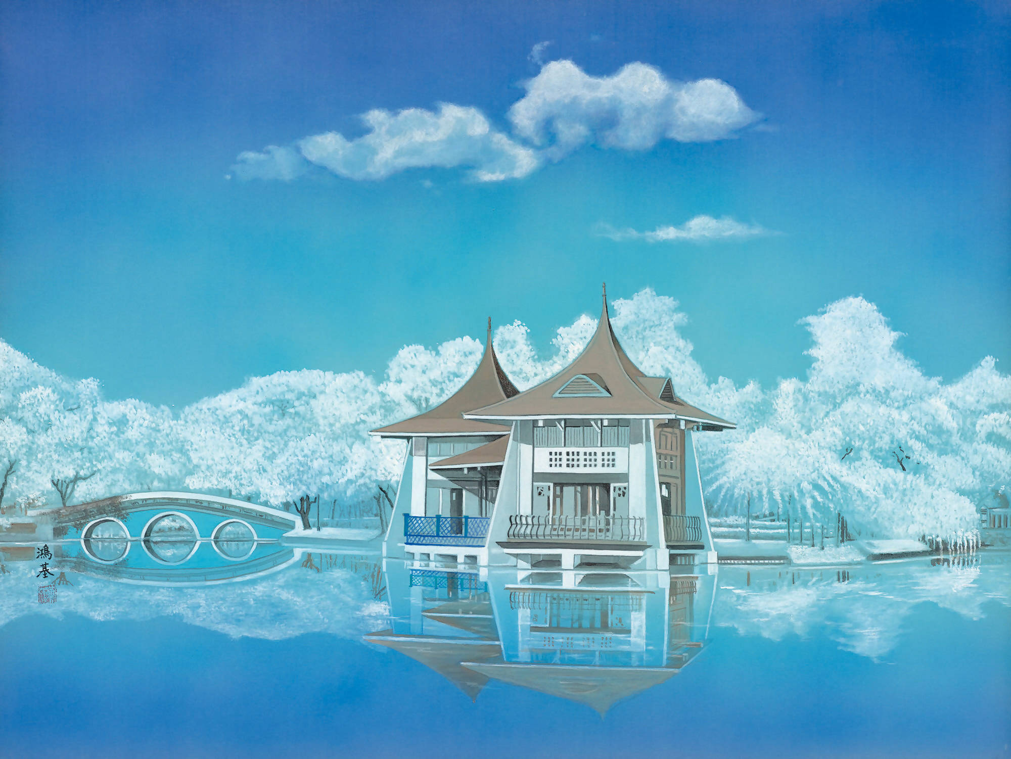The renowned pavilion at the heart of Sun Moon Lake in Taichung Park is depicted with the subtle and gentle gradients distinctive of gouache, blending seamlessly with the sky and crystal-clear lake surface. The visual melding of architecture and nature creates a tranquil and cohesive scene, inviting reflection on the unity of constructed and natural beauty.