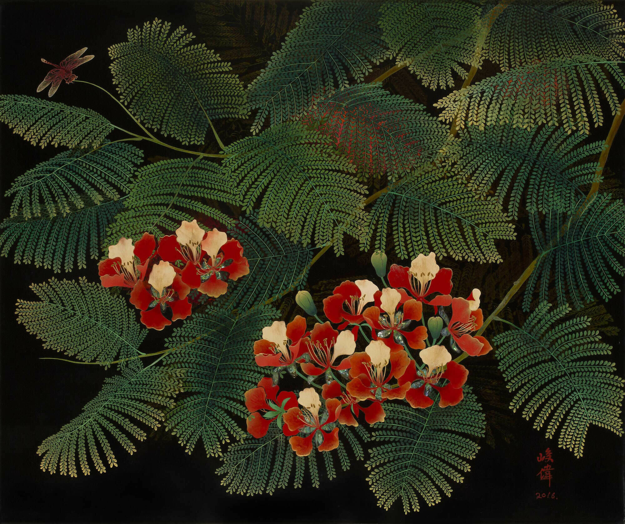 Dominating the foreground, the meticulously rendered phoenix tree leaves provide a harmonious counterpoint to the vivid red phoenix flowers. At the centre of each bloom, a mother-of-pearl inlaid pistil casts a delicate luminescence, punctuating the night's serenity with a subtle sparkle.