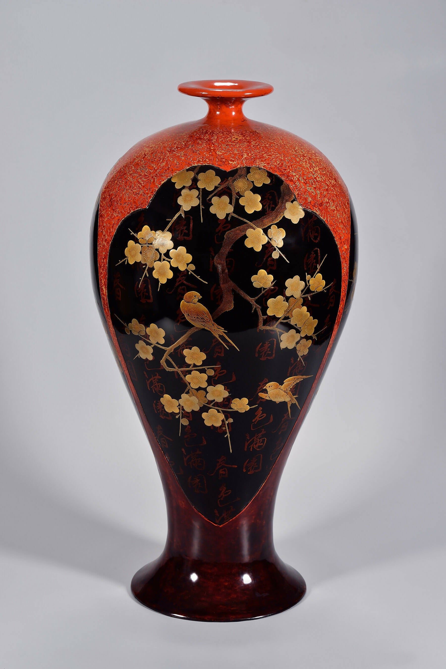 The vase's rich red upper section masterfully incorporates the revered rhinoceros leather lacquer. This craft juxtaposes the raw allure of rhinoceros leather with the gleaming finish of lacquer, culminating in a singular aesthetic that resonates with art enthusiasts.