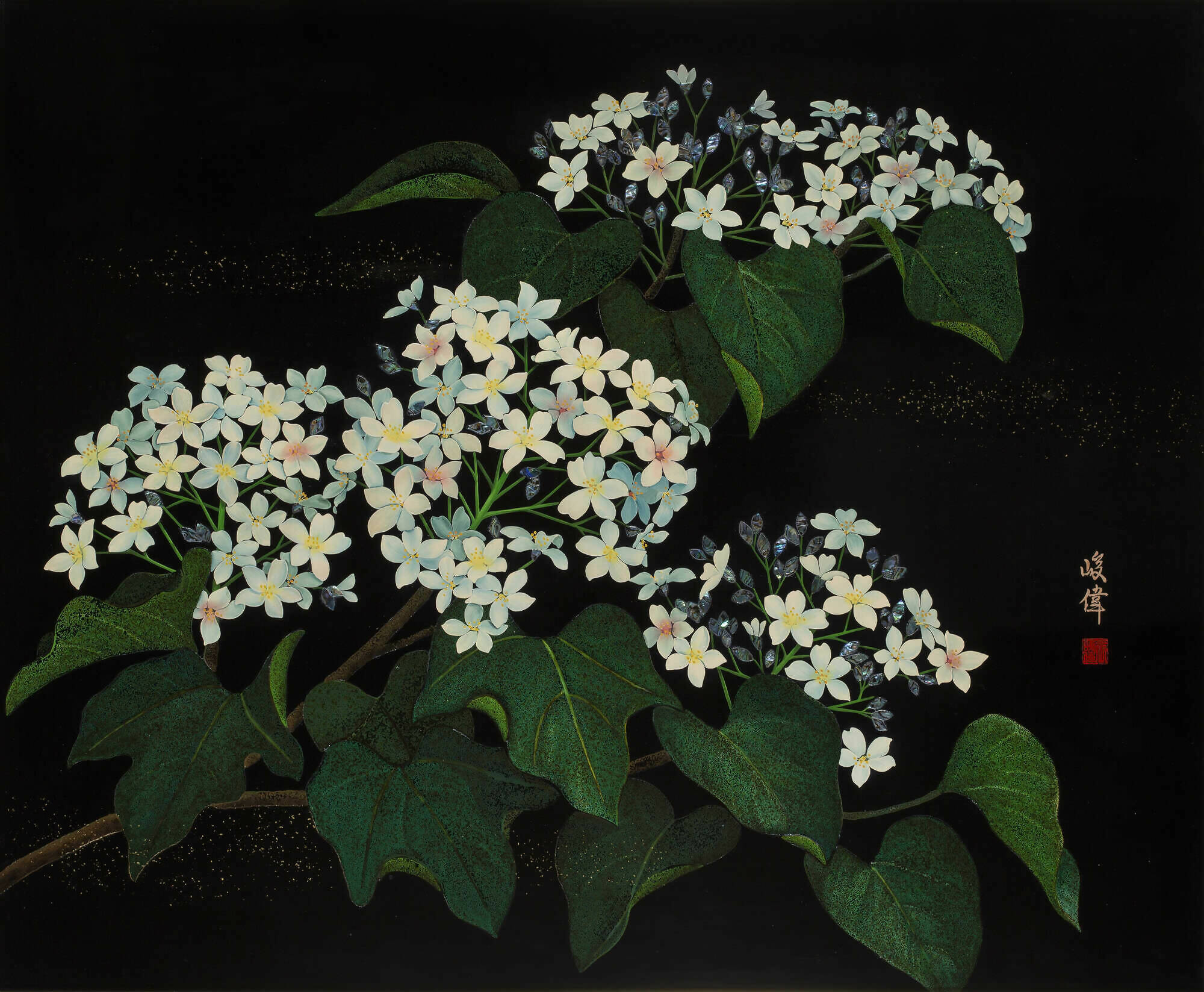 Set against a deep, lustrous black lacquer backdrop, a serene display of white tung tree flowers comes to life. Every delicate petal, accentuated by the soft hues of yellow and pink at their pistils, nestles among verdant leaves. This evocative portrayal exemplifies the ancient Maki-e technique, or "sprinkled picture." A captivating, intricate visual emerges through the meticulous application of metallic powders onto wet lacquer.