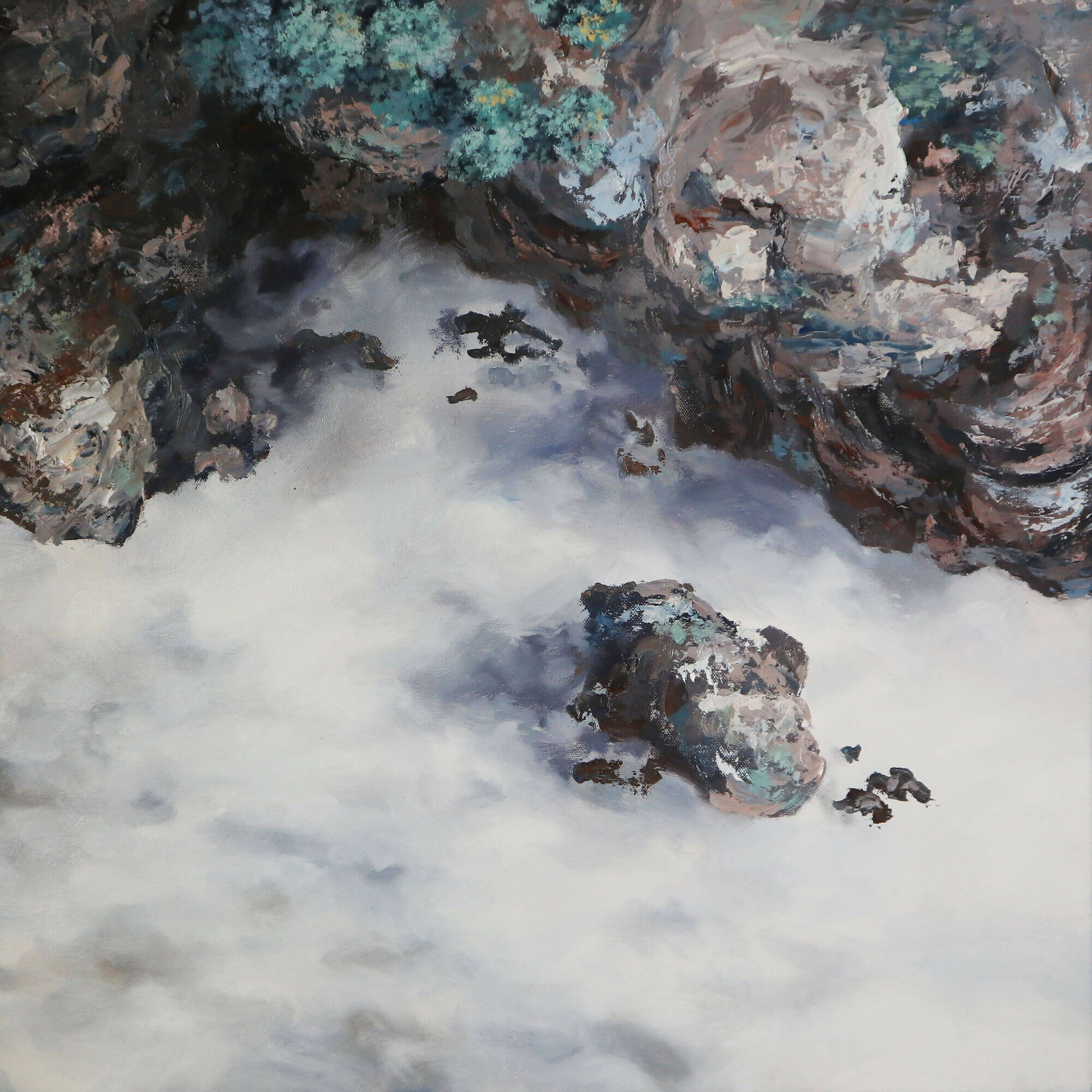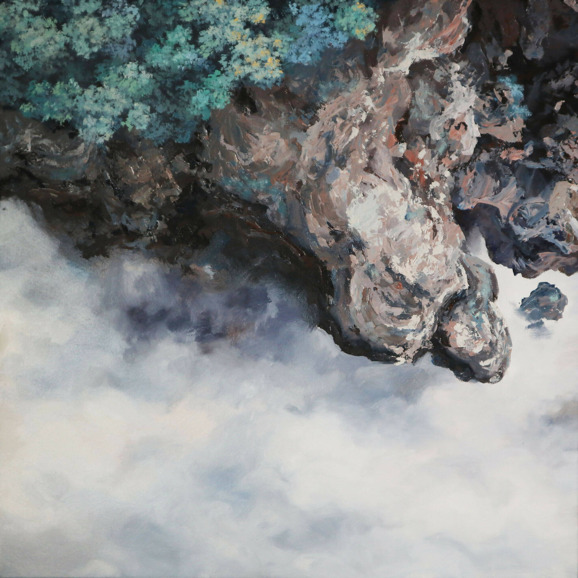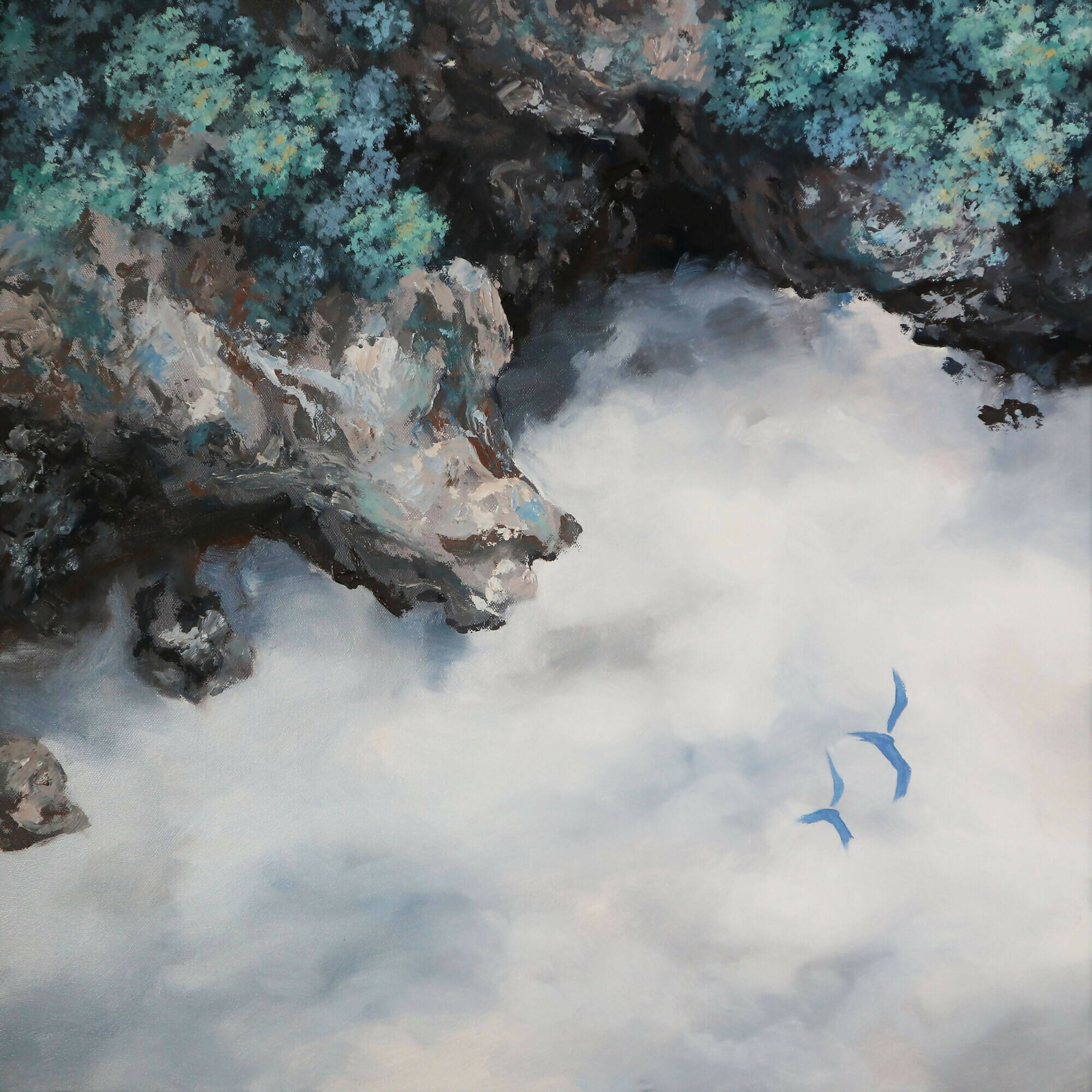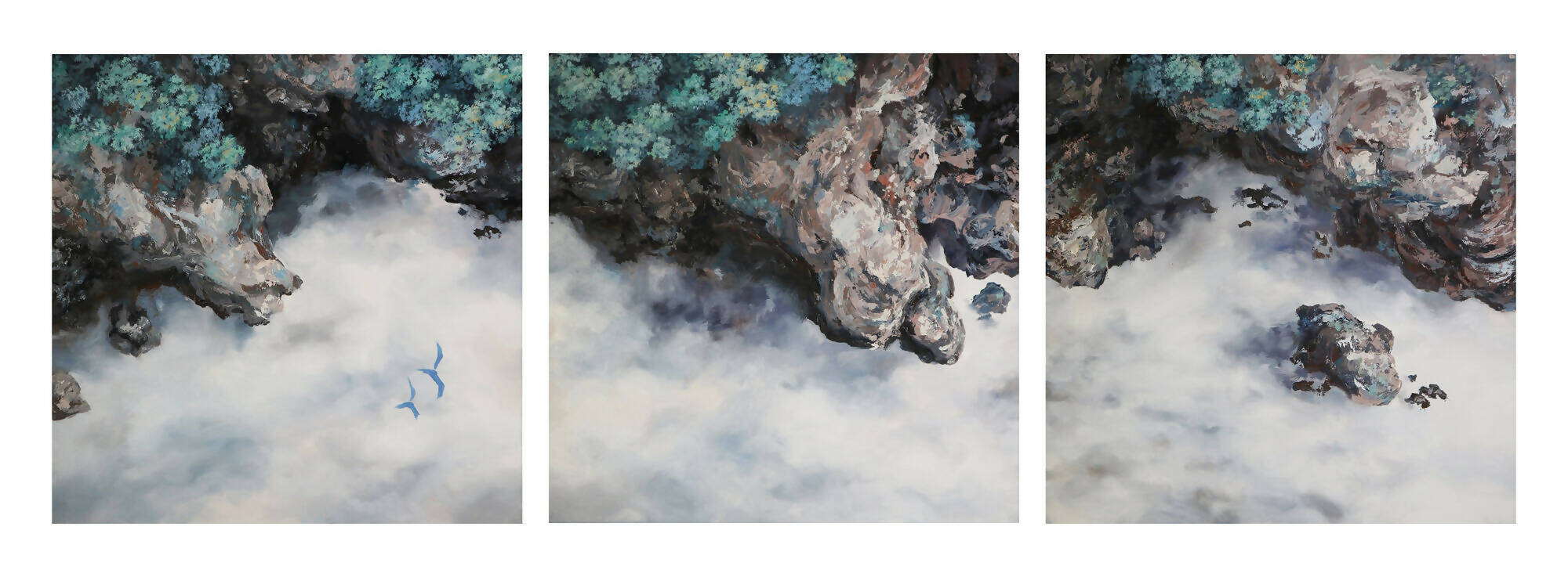 "Soar Above" comprises three panels depicting cliffs that rise above the mist-laden expanse below. The paintings convey to the viewer that life's journey is irreversible, and the sole option is to forge ahead. In this piece, the themes of human resilience intertwine with the artist's dreamlike depictions of forests cast in enigmatic blue and purple. The piece embodies the artist's philosophy of navigating life's complexities with purpose and grace.