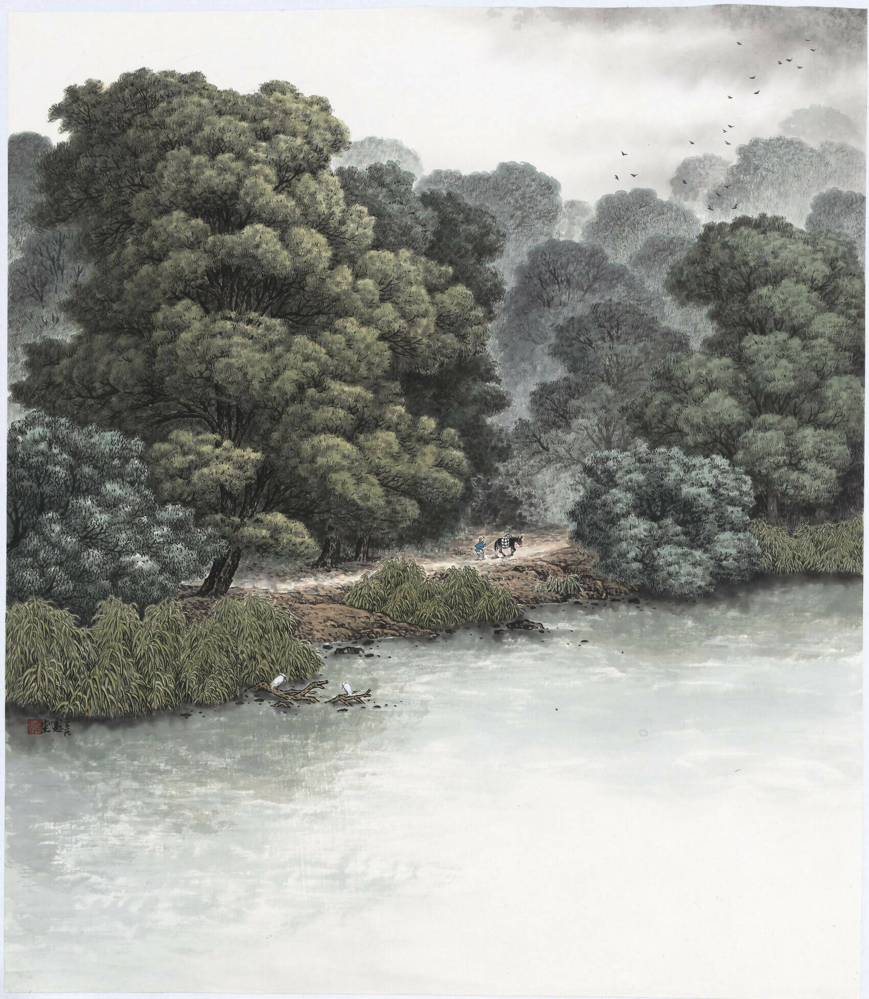 In the lower right corner, distinctive brushwork and masterful use of white space skillfully portray the water's gentle undulations, harmonizing with the ethereal mist that merges into distant mountaintops. A solitary traveller walks along a path, his solitude emphasized by a pair of waterfowl resting in nearby reeds. The trees lining the lakeside, rendered in layers to suggest varying distances, evoke a sense of vastness and infinite reflection within the scene.