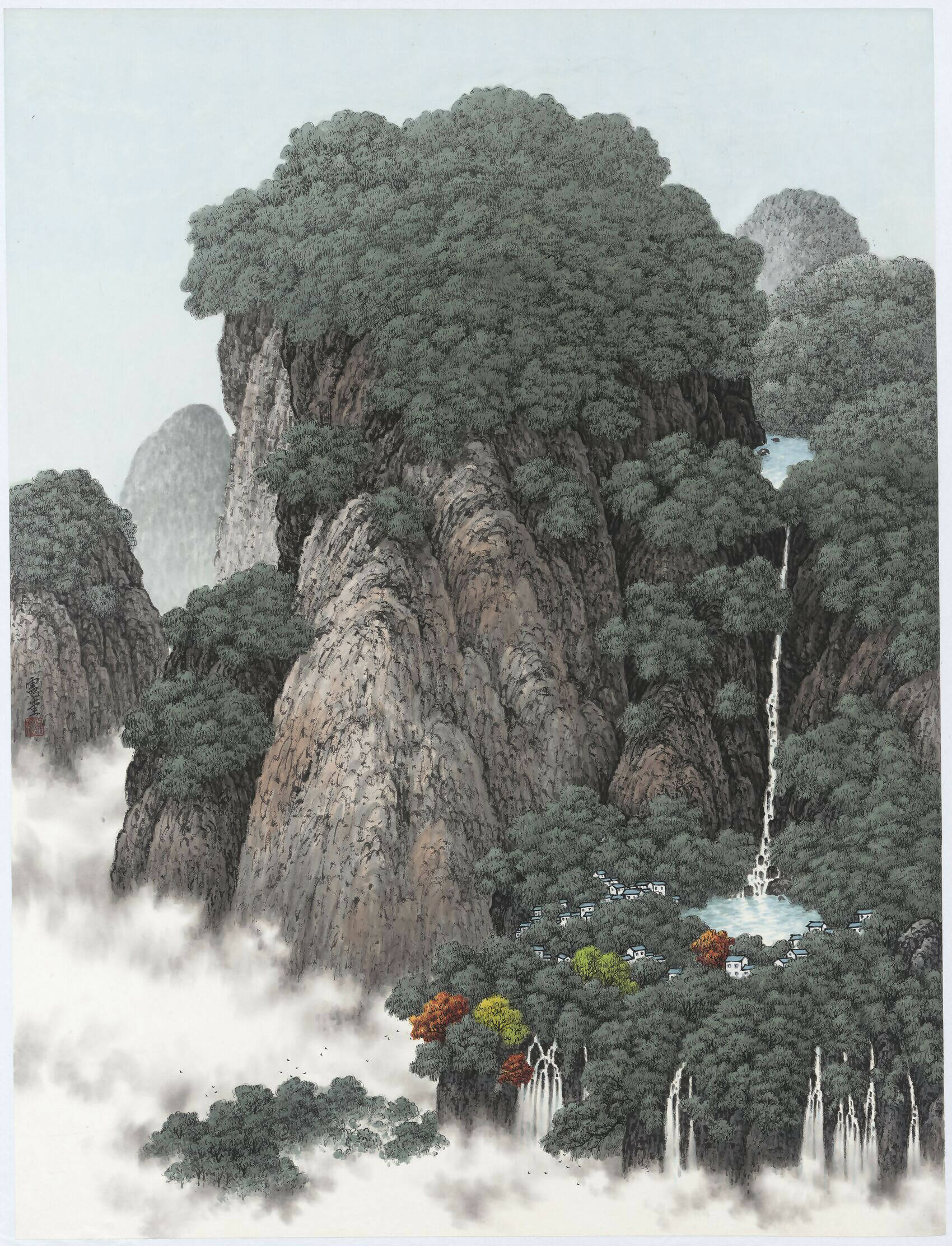 Navigating the serene terrains of Hou Xiantang's paintings, the audience finds itself transported beyond the mundane. Hou employs a distinct M-shaped brush stroke that lends an intriguing blend of vitality and enigma to the mountainous landscapes he presents as his ultimate "hidden paradise." This technique affords remarkable versatility, layering strokes to evoke towering, rugged mountains or employing a softer touch to suggest lush, dense forests.
