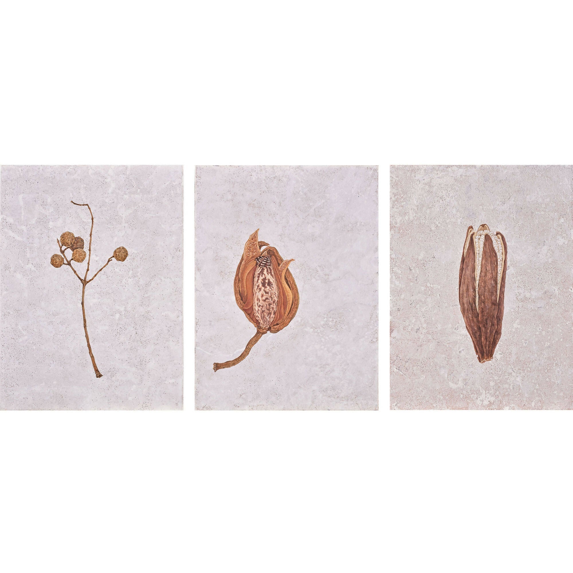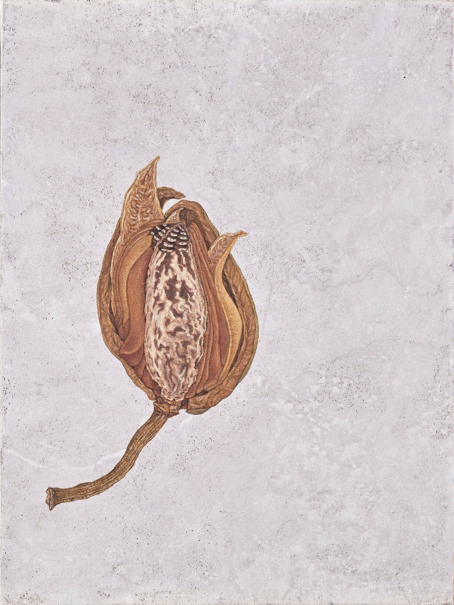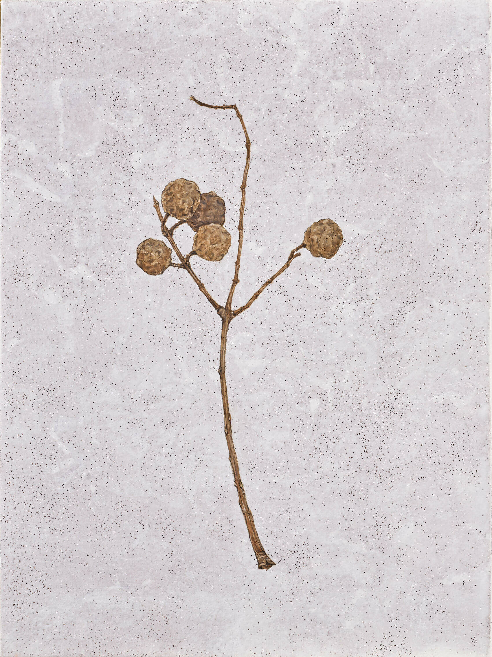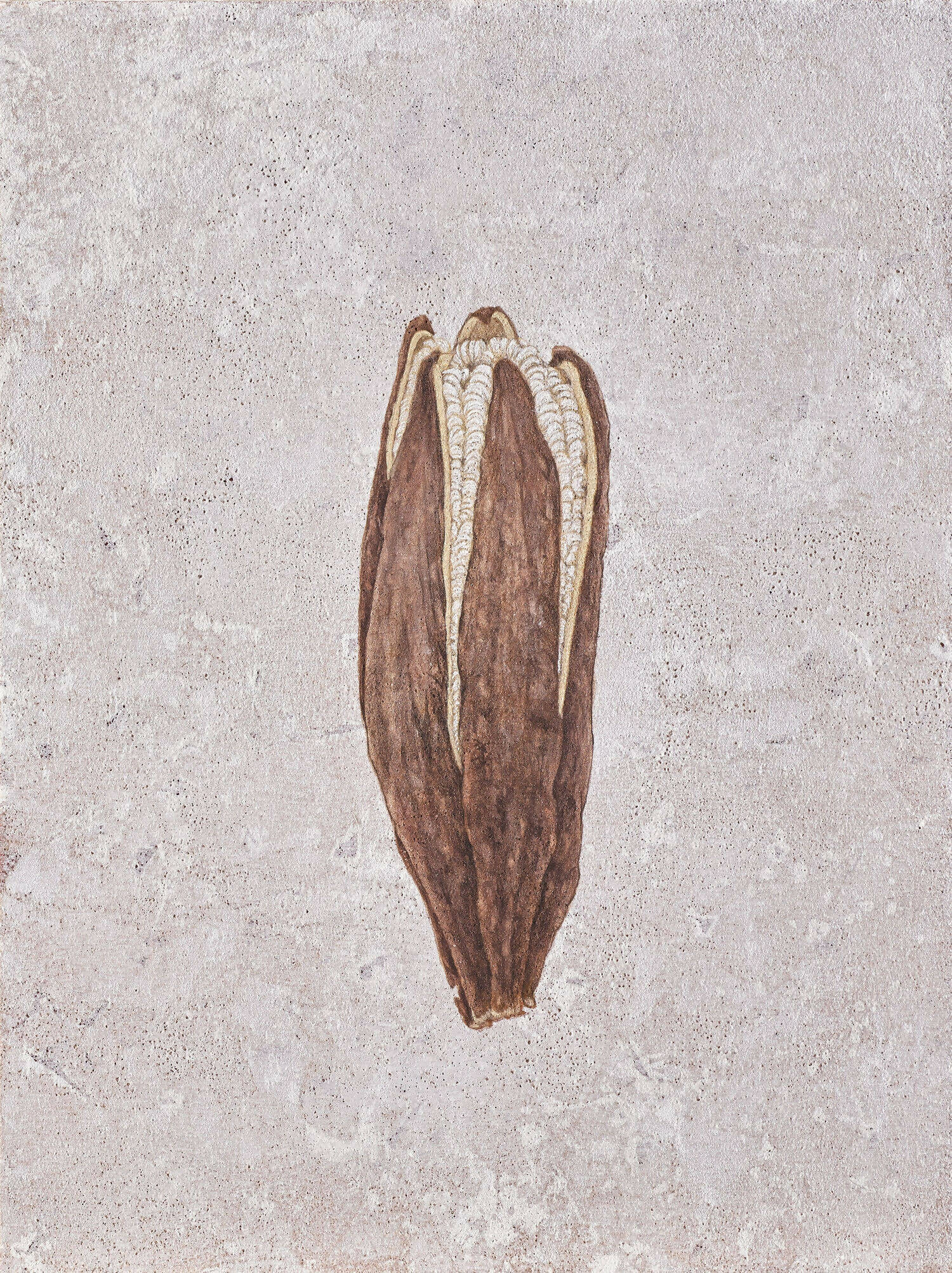 In Chung Shun-wen's compelling series "Collecting Seeds," the artist turns her focus on the fundamental building blocks of life: seeds. Whether they are from peach blossoms or bamboo cypress, each seed is rendered as it finds its place in the fertile soil, a momentary pause in its journey toward growth and renewal. Created using carefully chosen mineral pigments, the artist's precise brushwork elevates these diminutive seeds into profound symbols of the cyclical nature of existence. This piece transforms the seemingly mundane into an eloquent testament to life's inherent potential and constant renewal.