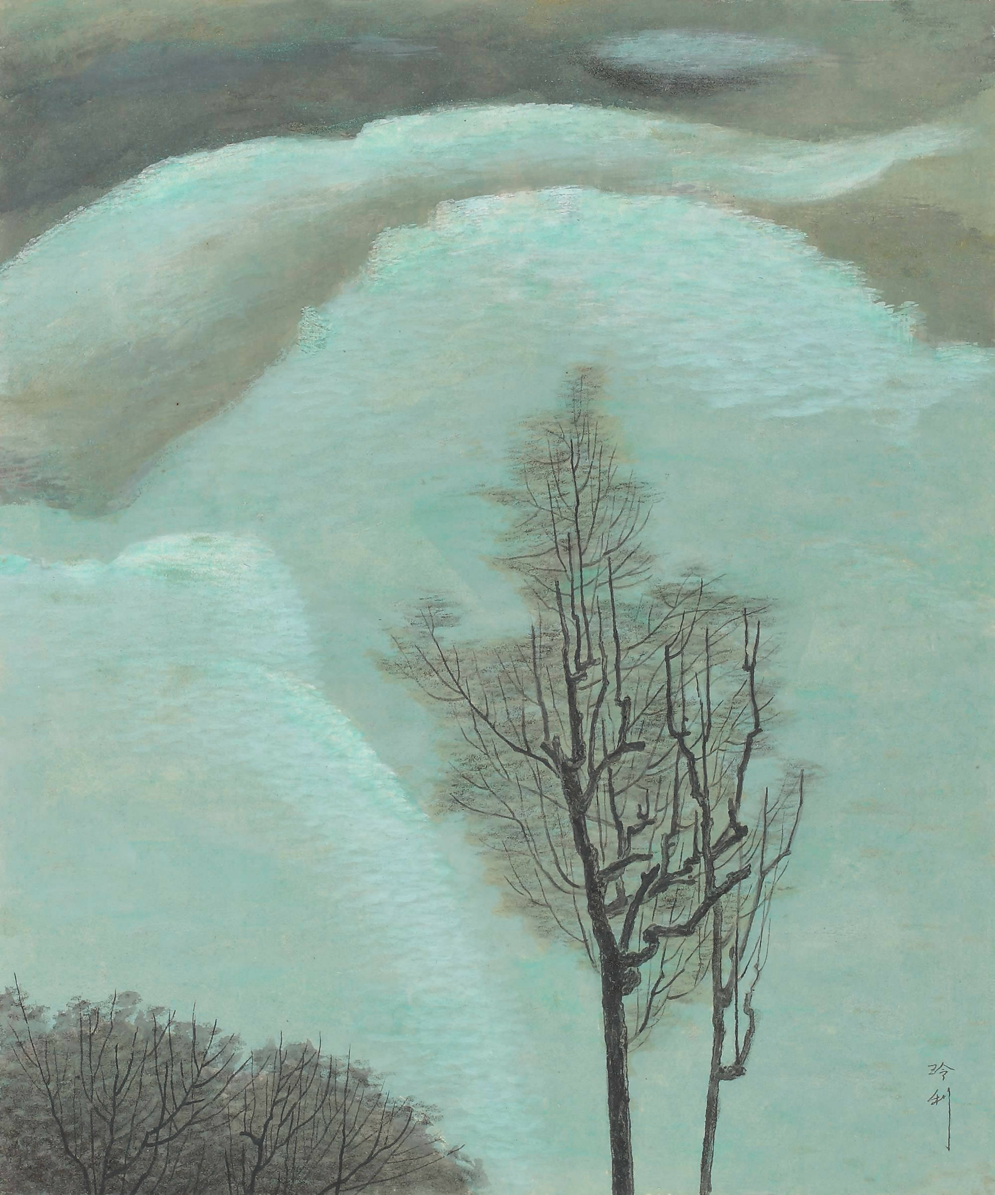 Throughout the entire painting, the artist employs subtle shades of gray-blue, subtly intertwined with delicate hues of light ink and ocher, conjuring an atmosphere of ethereal refinement.