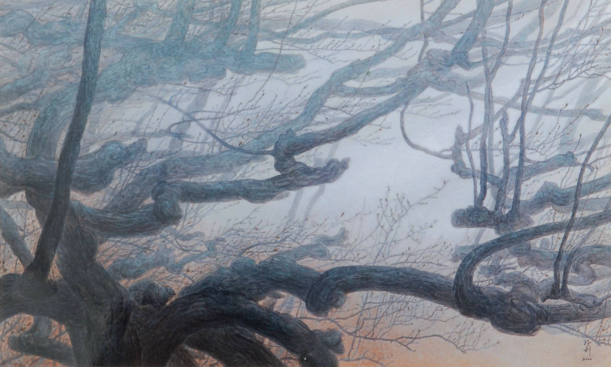 Life's current persists, and seasons ebb. Following the veiled embrace of time's passage, wisteria's aged branches, stirred by the morning sun's tender light, reawaken in early spring, heralding the jubilant bloom of all existence. This artwork reflects that true distinction in form emerges solely through time. By contrasting the weathered wisteria branches with the fresh shoots that emerge after winter's harshness, it depicts the delight of withered wood experiencing a springtime resurgence. Interwoven branches evoke spatial depth, while delicate white strokes imbue the painting with an artistic essence, layering space and capturing natural phenomena with finesse.