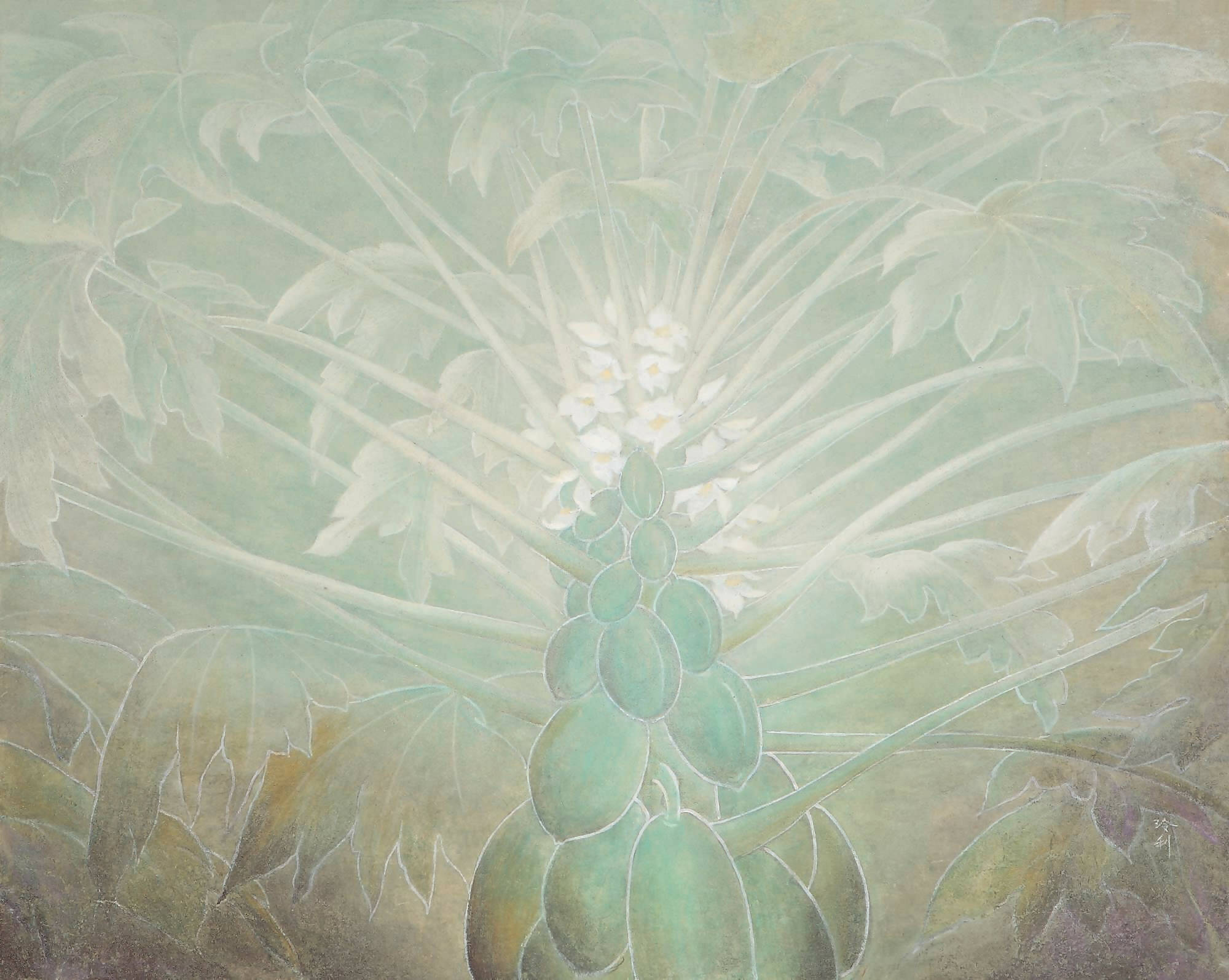 The papaya tree flourishes in lush greenery, its branches filled with fruit clusters resembling a woven tapestry. The artist depicts a familiar sight in Taiwan, as this fruit tree infuses the summer season with its full-bodied fragrance. Beyond the more apparent theme of shifting seasons, Liu, using an ethereal aesthetic and ambiguous forms, invites the audience to reflect on the passage of time.