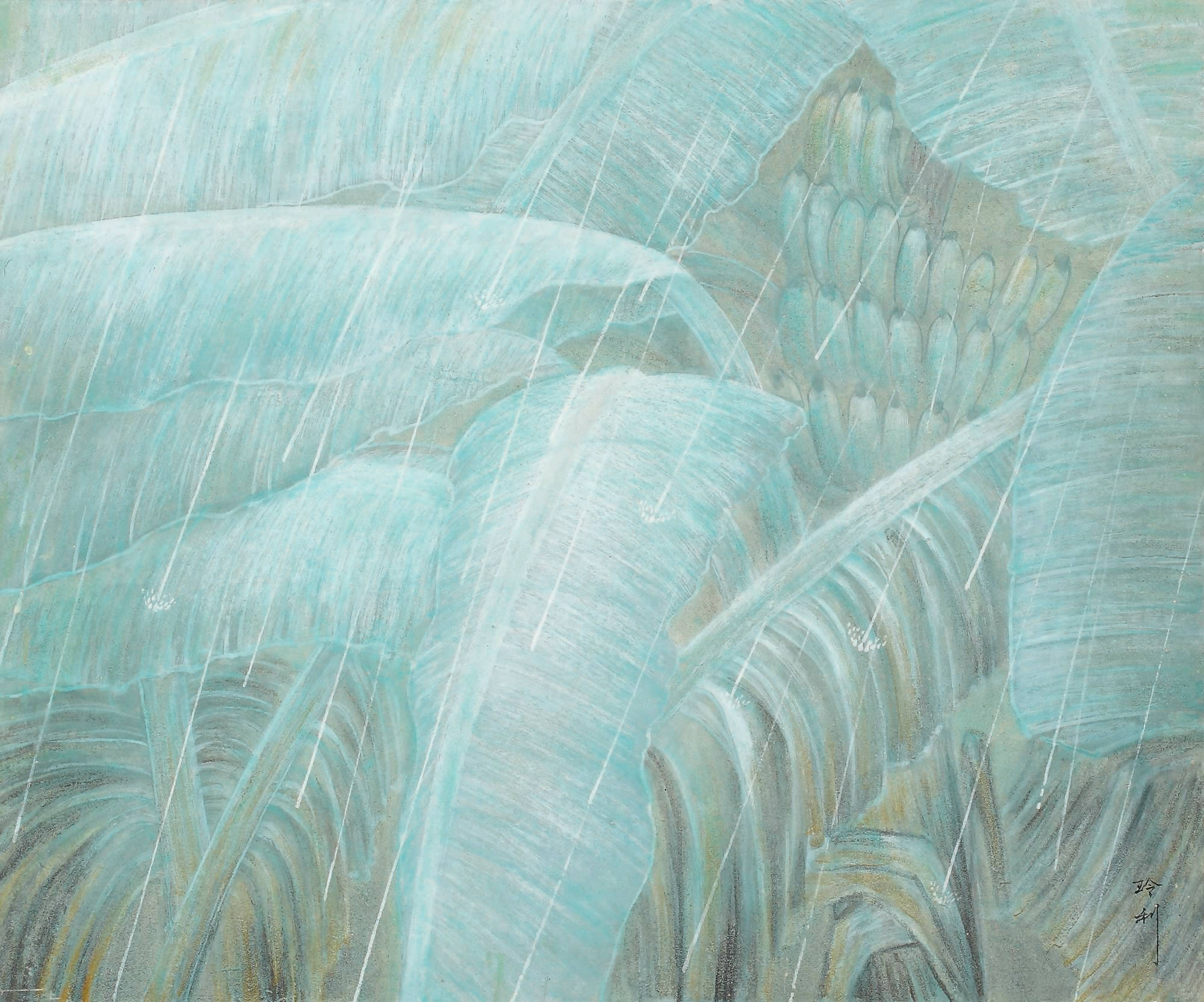 With masterful and gentle brush strokes alongside muted colors, the artist creates Summer Rain, depicting fan-shaped banana leaves attempting to shield bananas, as clusters of ripe fruit remain hidden, poised to emerge in due course. As summer rain arrives, an abundant harvest beckons.