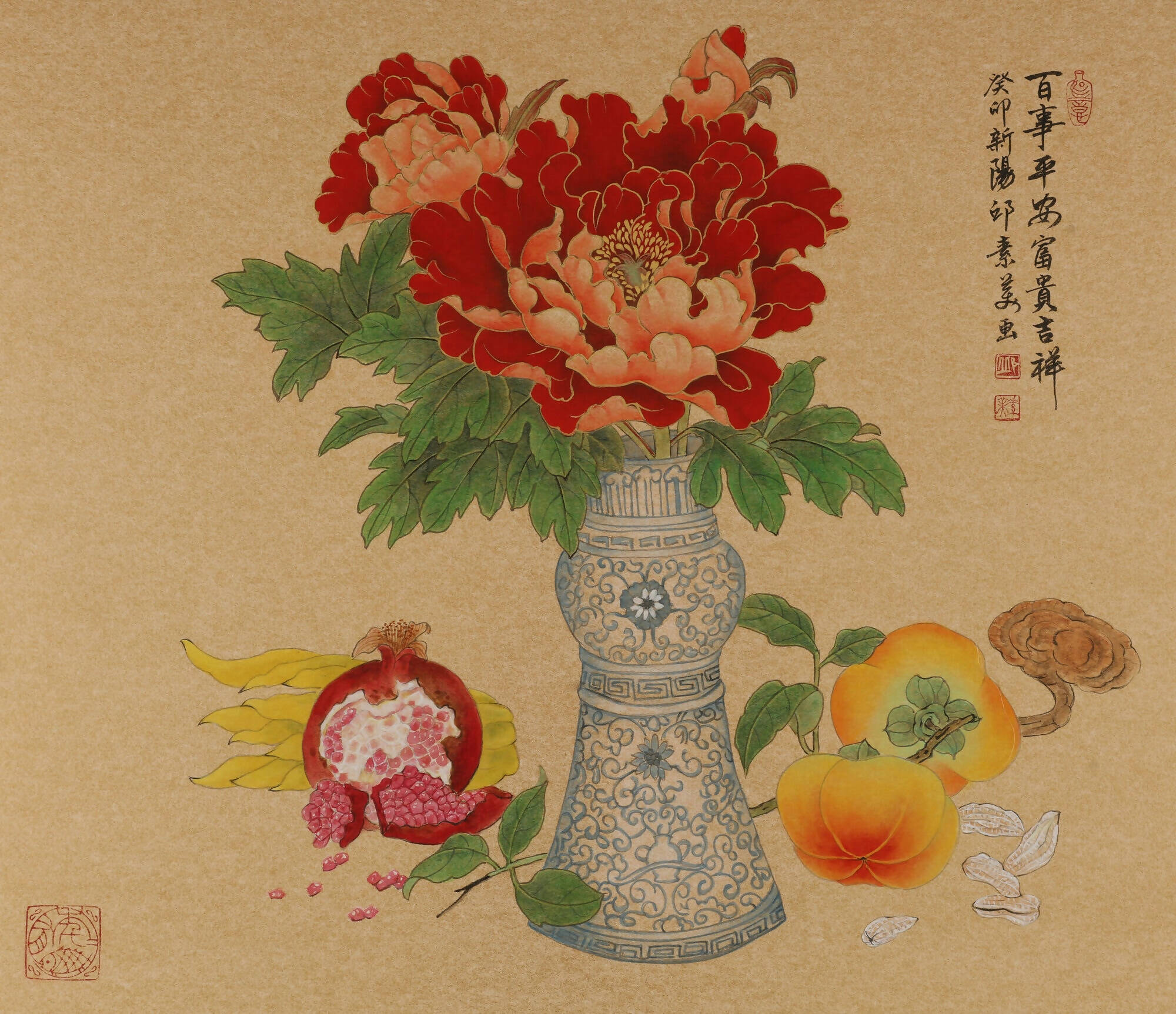 This multi-faceted painting reveals a rich tapestry of symbols, each representing a different blessing. The resplendent peony signifies peace and prosperity, while the blue-and-white vase embodies security. Translucent pomegranate seeds evoke wishes for abundant offspring and fortune, as golden persimmons adorned with leaves suggest a smooth journey ahead. Meanwhile, peanuts symbolize longevity, and lingzhi mushrooms--regarded as auspicious since ancient times--complete this ensemble of blessings.