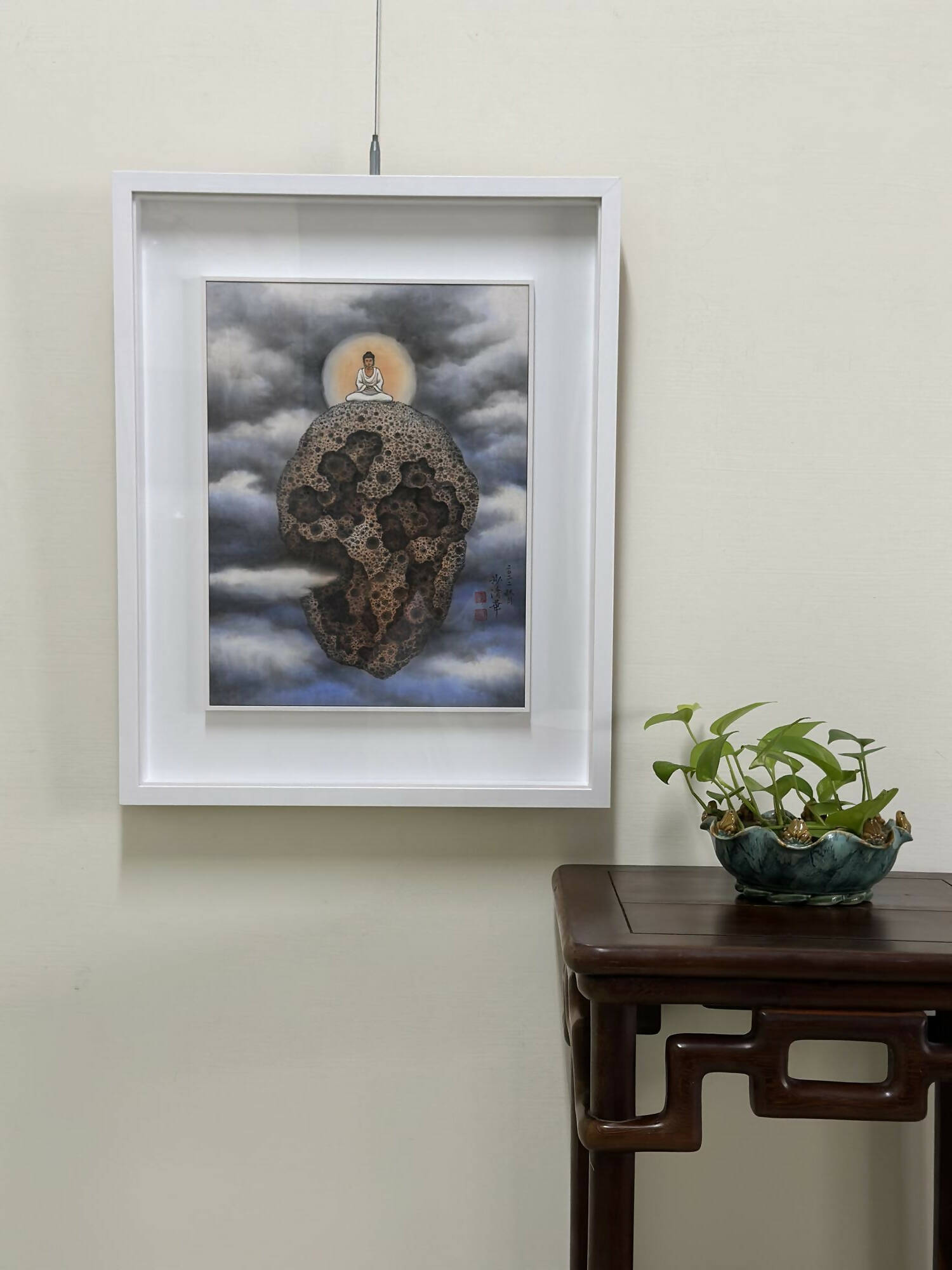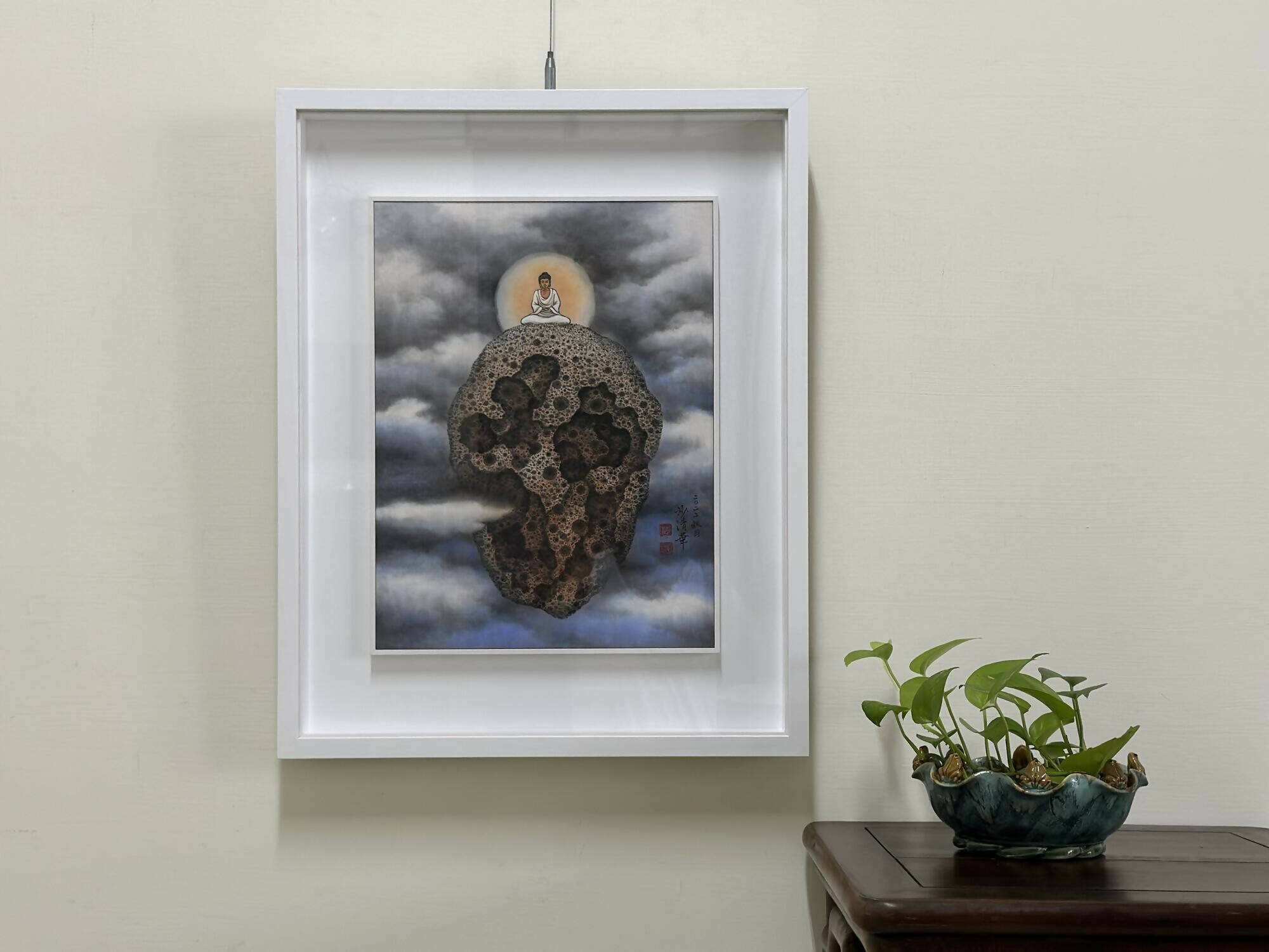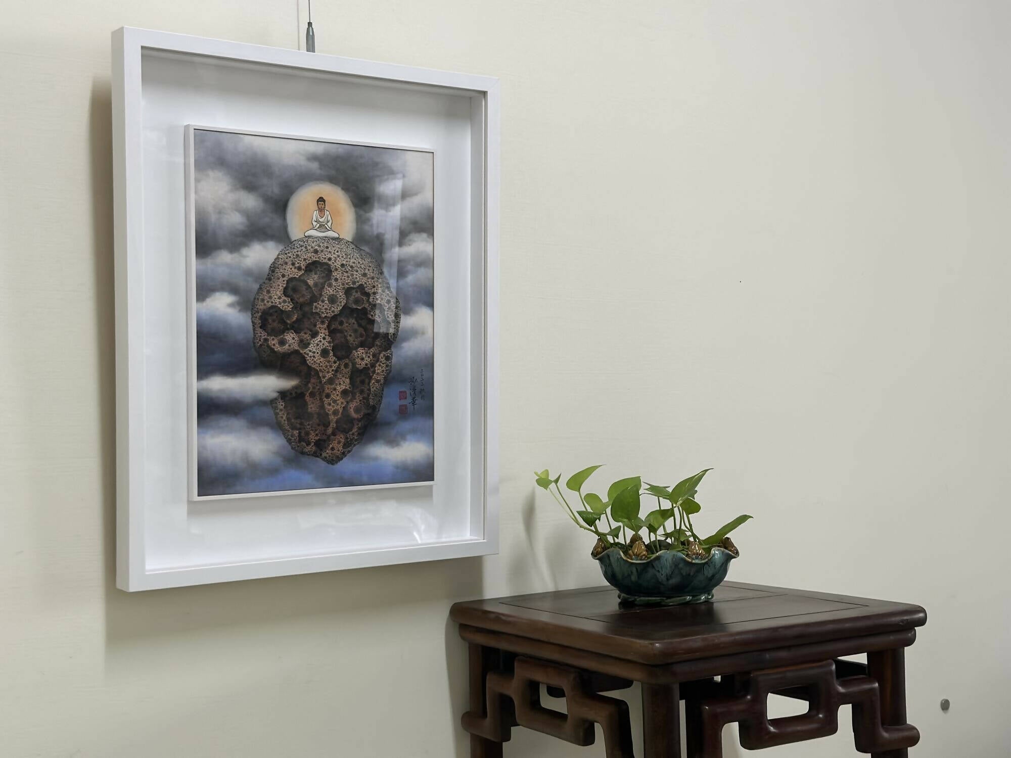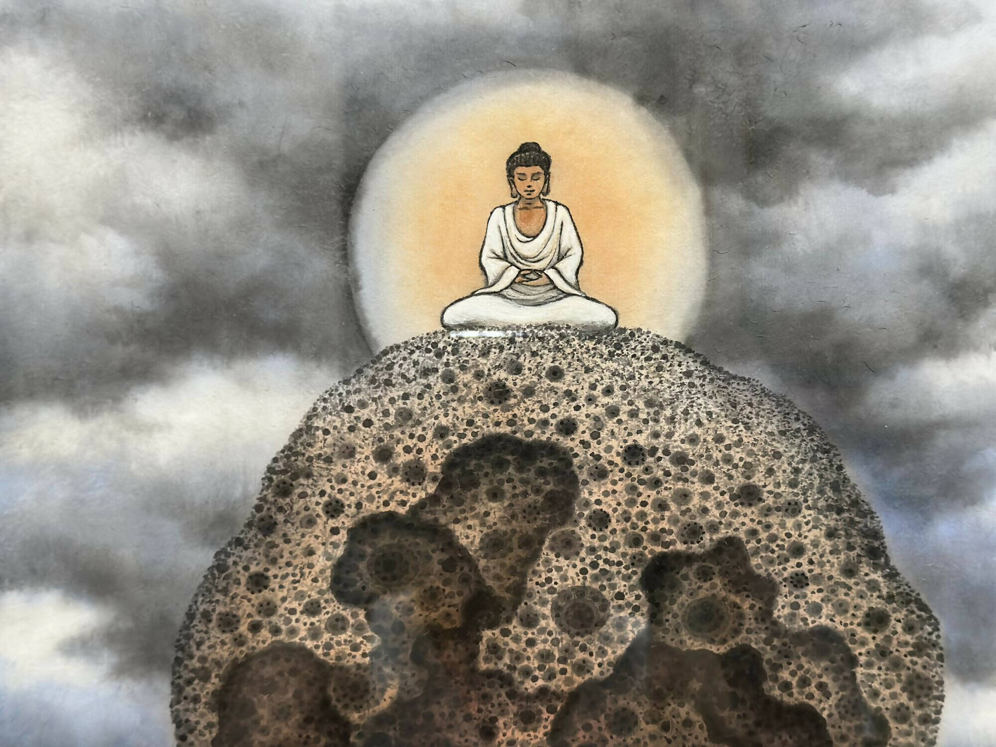 Against a backdrop of a misty cosmic expanse, a massive stone levitates with a Buddha seated atop, representing worldly wisdom and hopes for humanity.