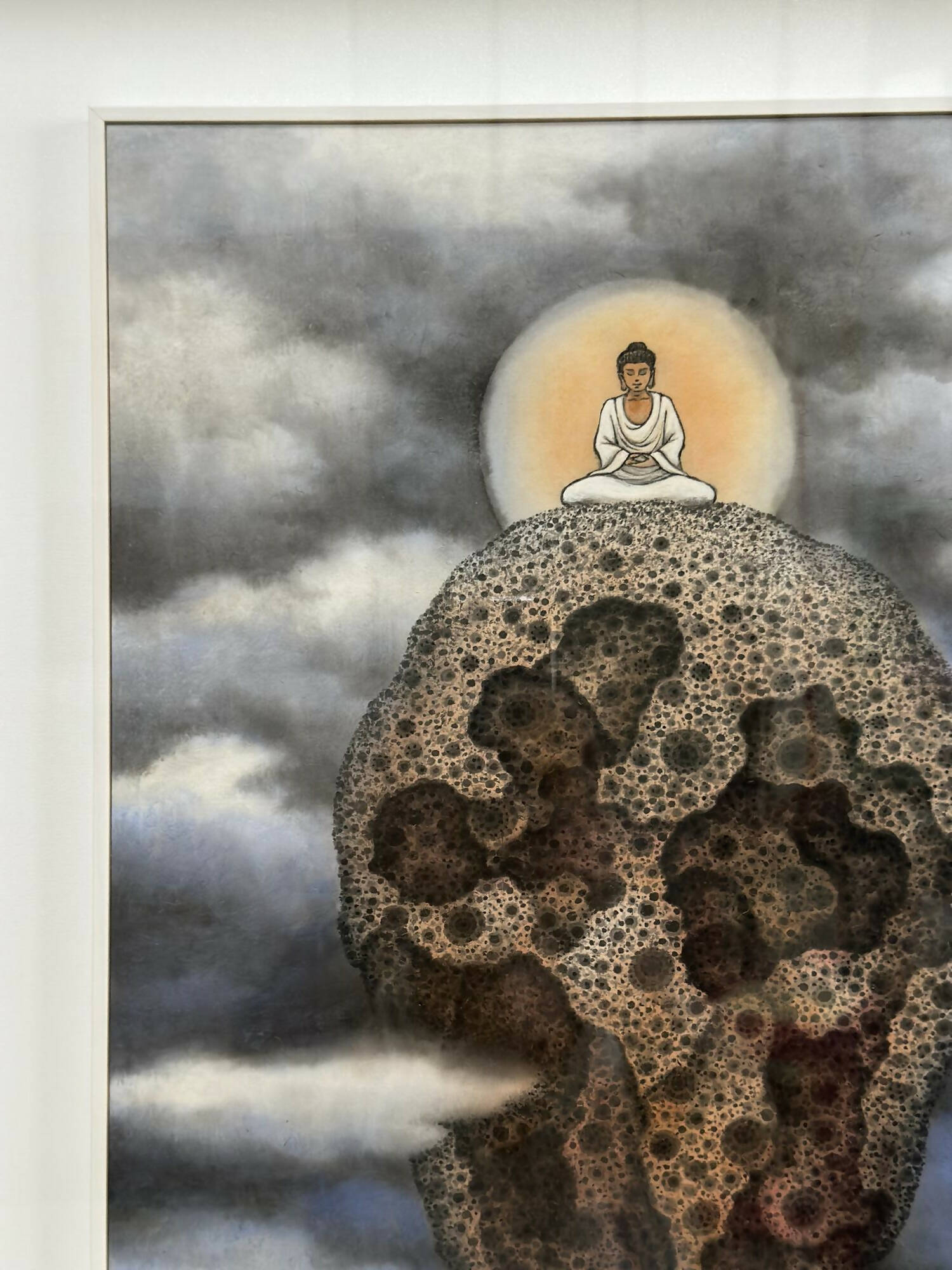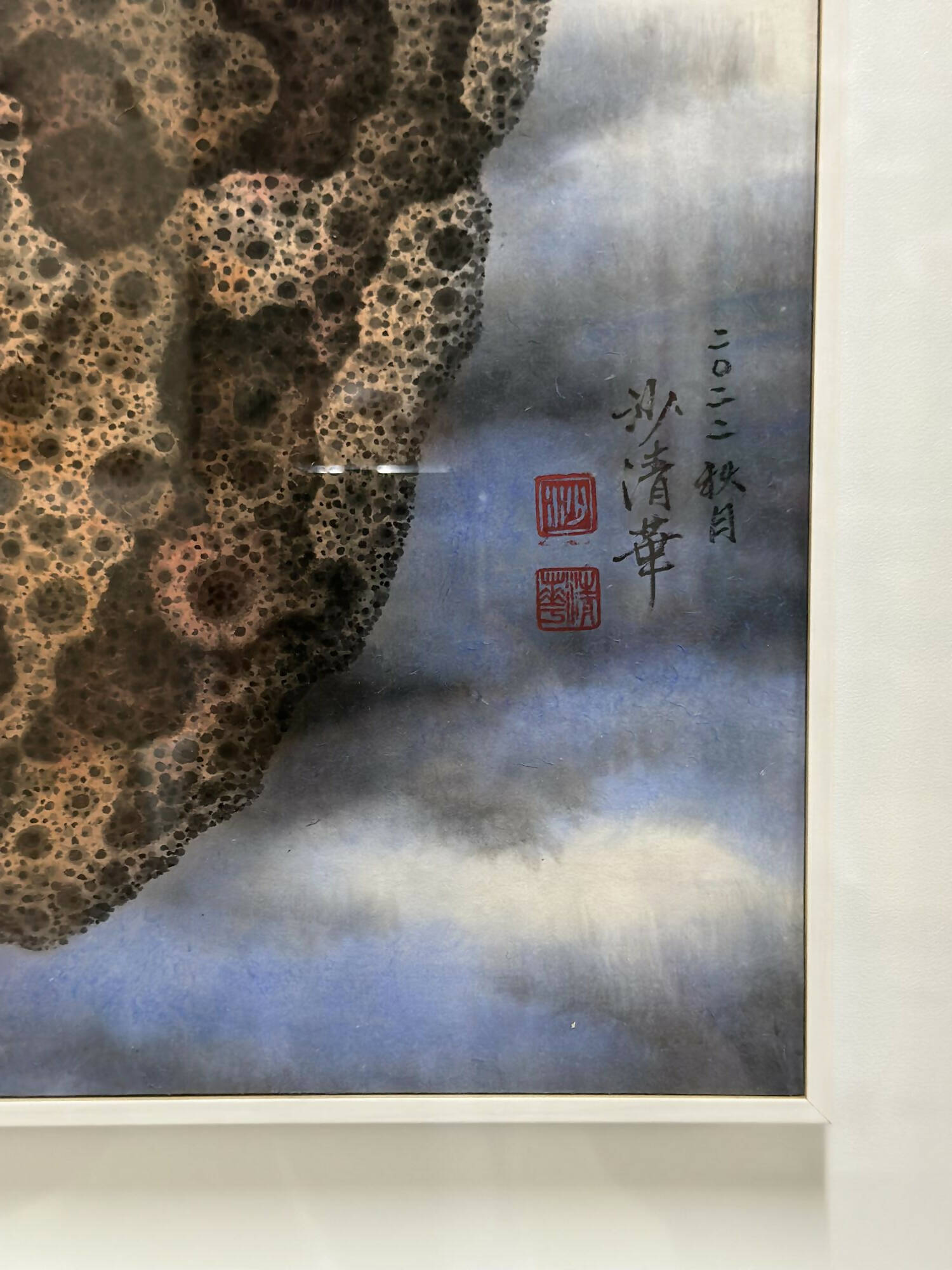 Anchoring this ethereal world are ancient rocks, their surreal textures mirroring the millennia-long weathering seen in "beehive rocks." The realistic depictions of hollow depressions on the rock's surface are achieved through meticulous and repetitive brushwork, which captures the essence of time's passage and hints at the myriad universes they hold.